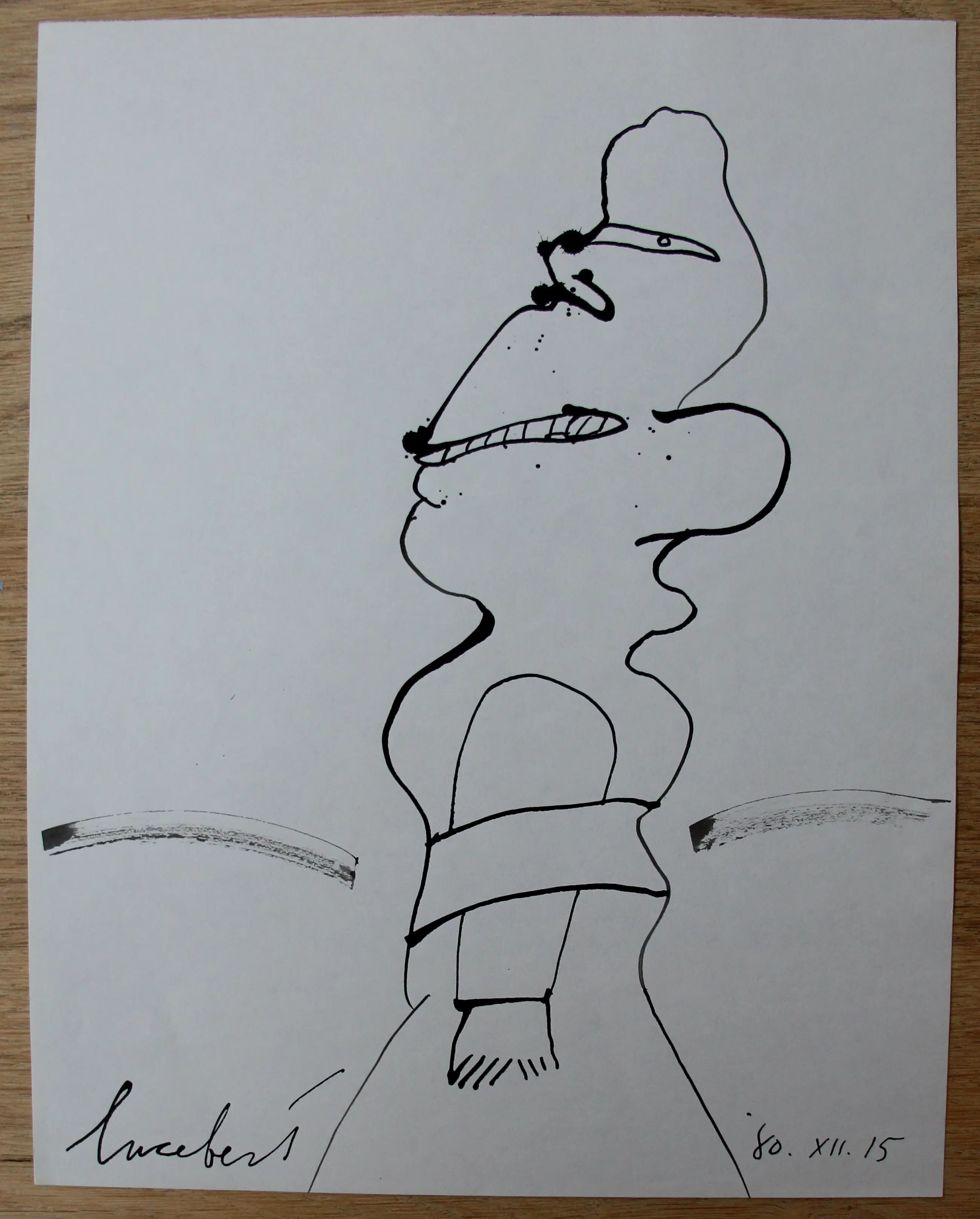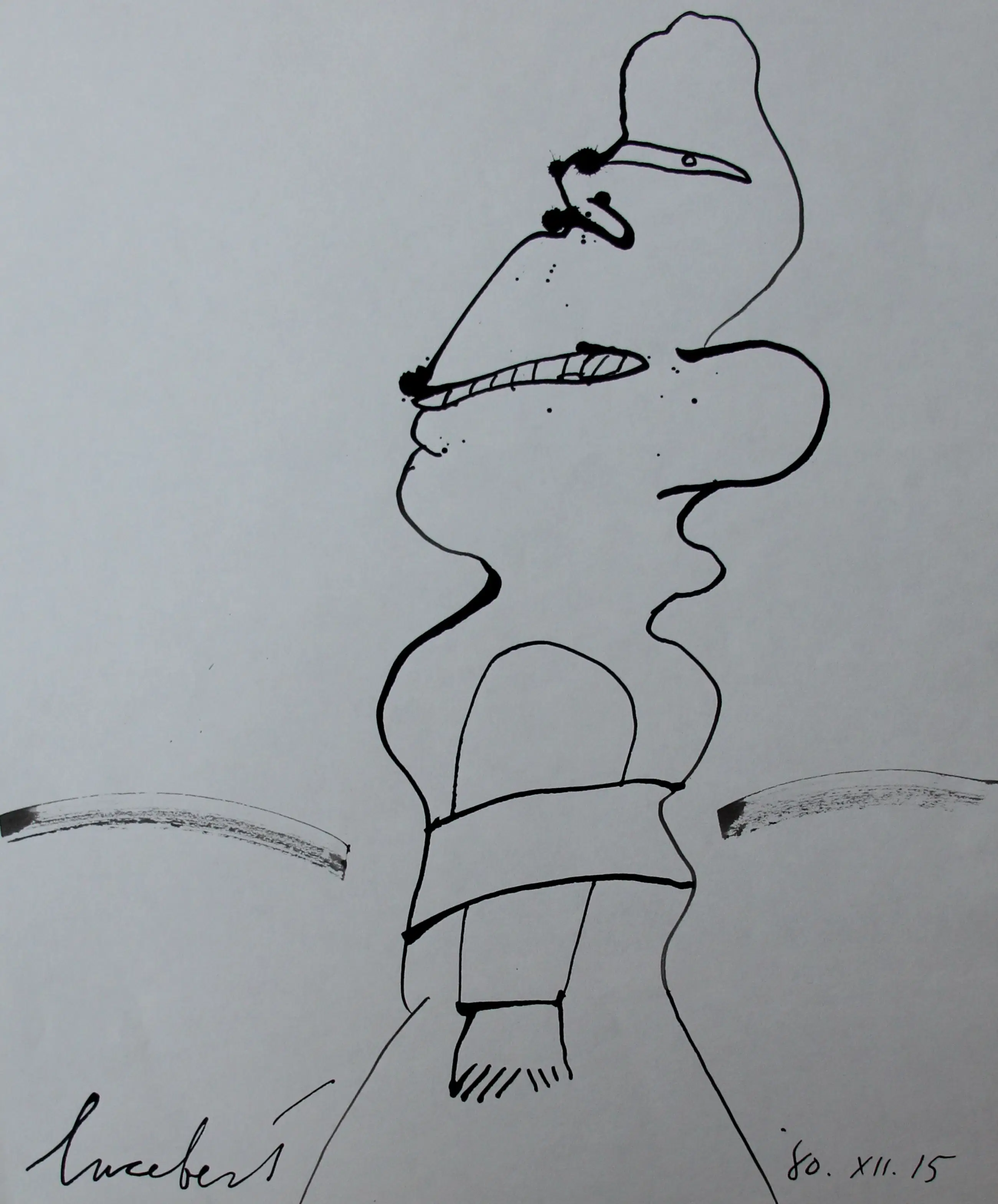 Pen tekening(zwarte inkt), van Lucebert. Gedateerd: "80.XII.15". Afmetingen blad: H27 x b21cm. Afmetingen voorstelling: H25 x b12cm. Het werk is links onderaan gesigneerd, door de kunstenaar. De authenticiteit van dit werk wordt volledig gegarandeerd. Een certificaat kan, op aanvraag, worden gemaild.