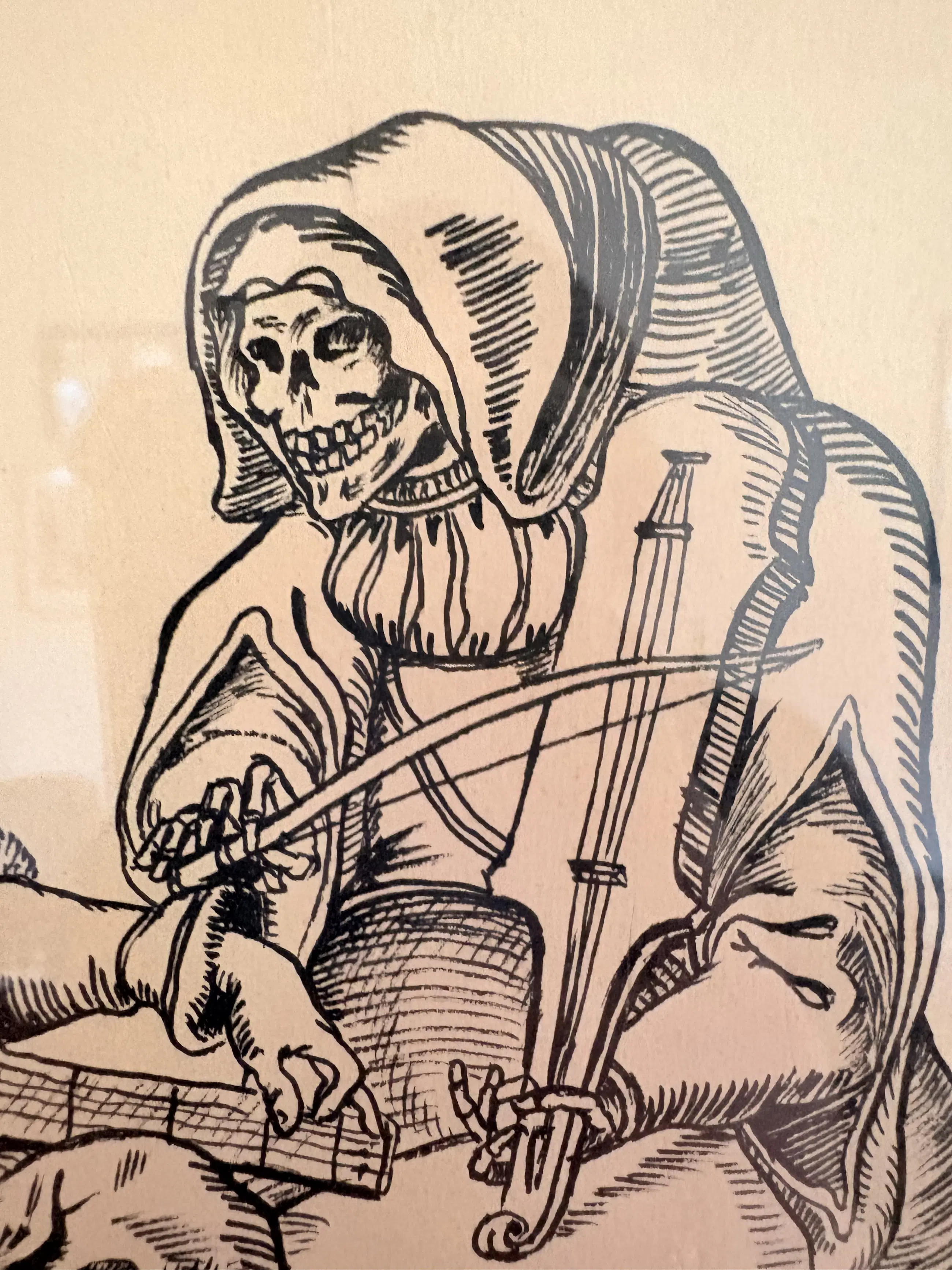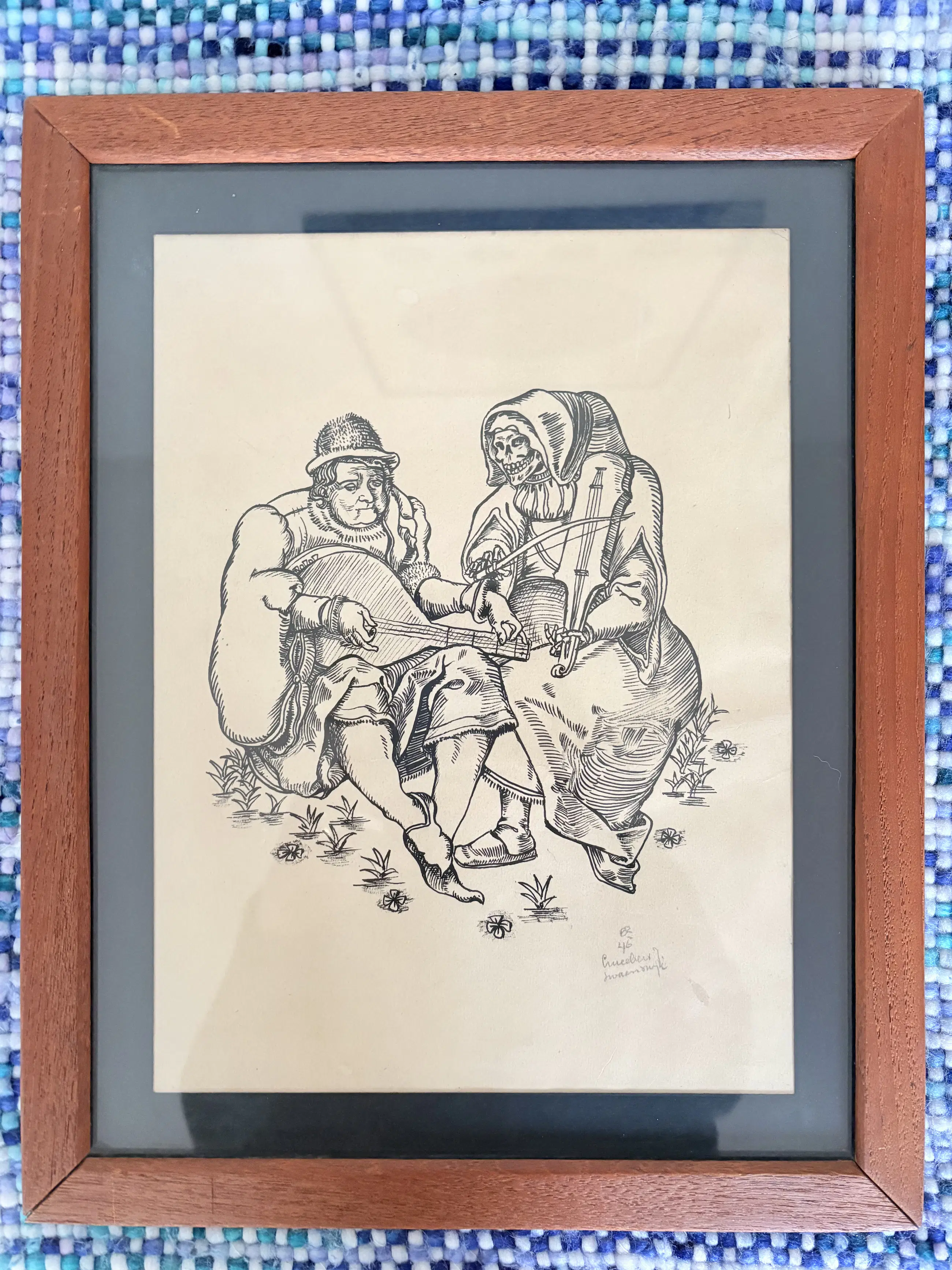 The composition depicts a skeletal violinist (Death) confronting a seated musician — a classic Danse Macabre theme. The work reveals Lucebert’s early fascination with religious and existential symbolism, reflecting the immediate post-war atmosphere of Europe.