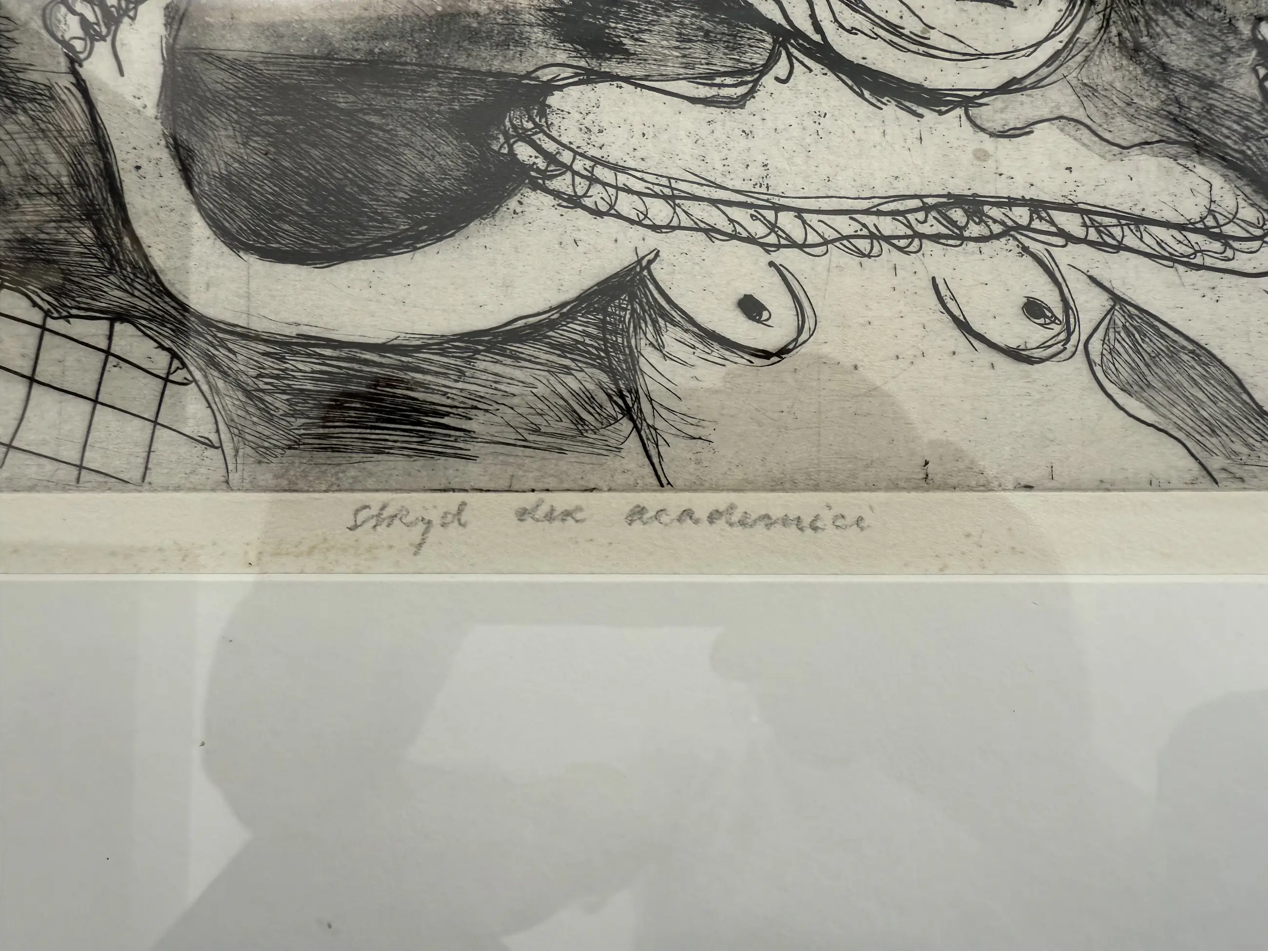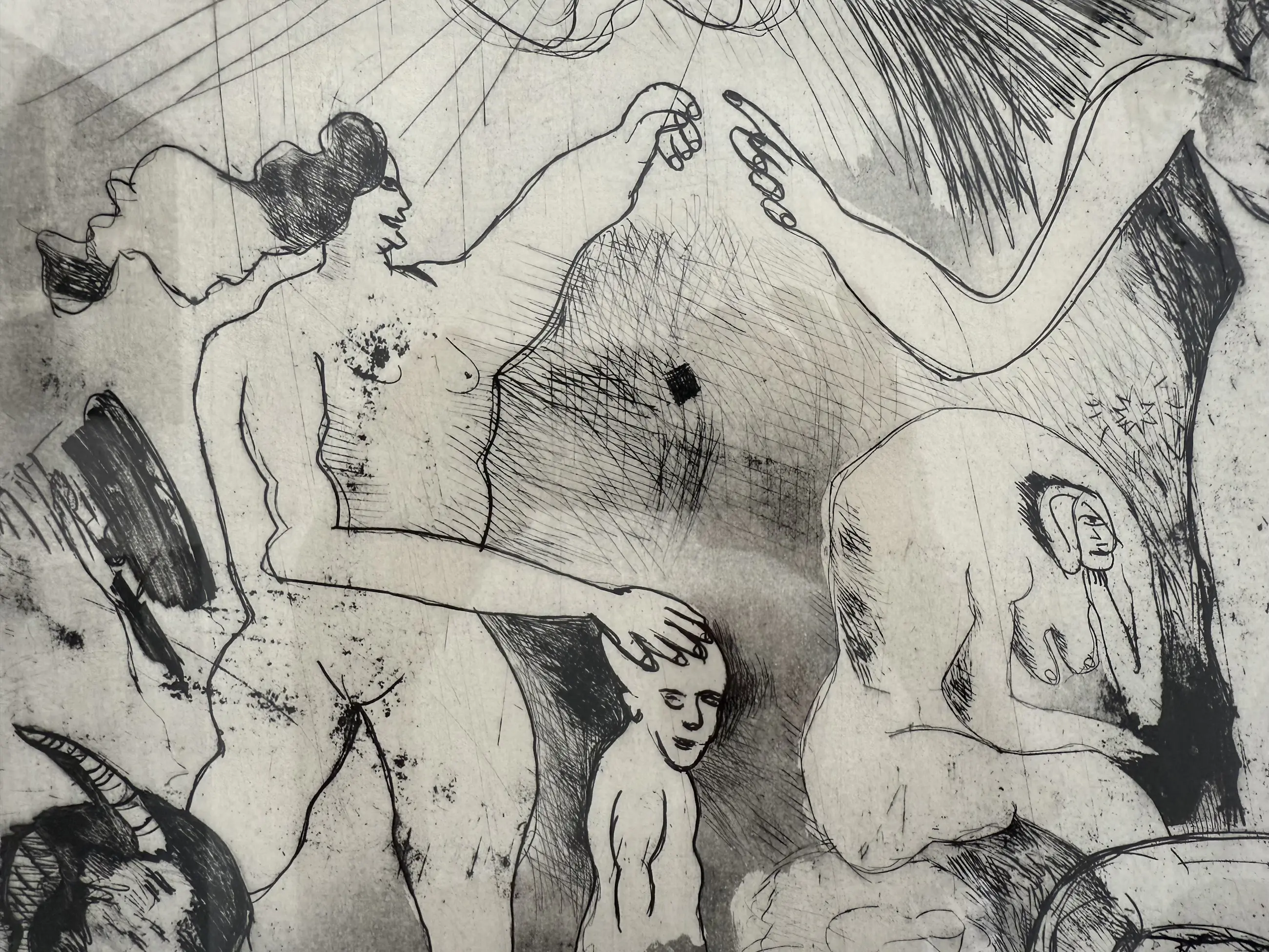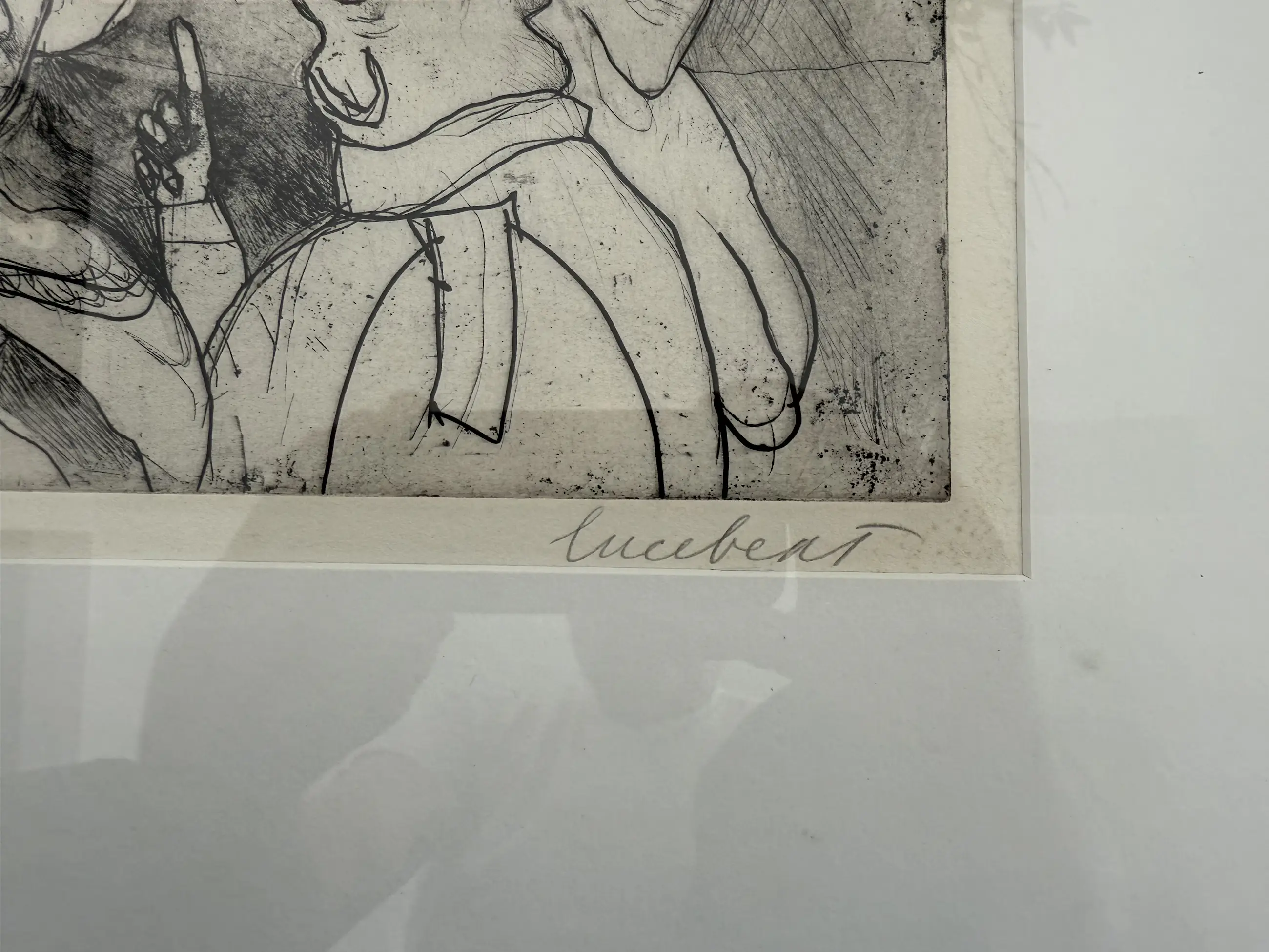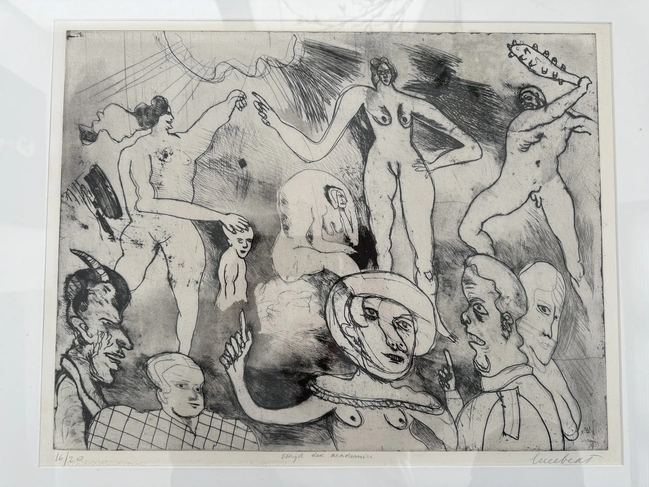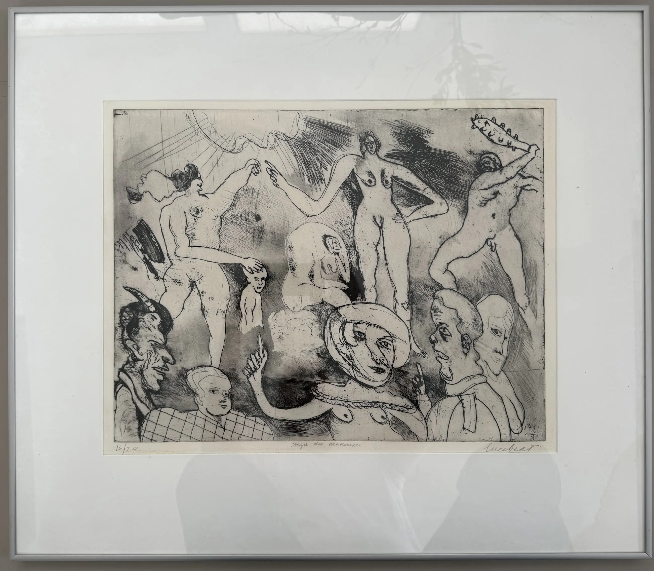 Nummer 16 van 20, lucebert ets Strijd der Academici. Volgens catalogus Stedelijk Museum uit 1967. Sinds aanschaf altijd in onze familie geweest. Ziet er goed uit maar ik ben geen kenner. Passepartout heeft kleine vochtschade. Zie foto’s voor conditie van de ets.