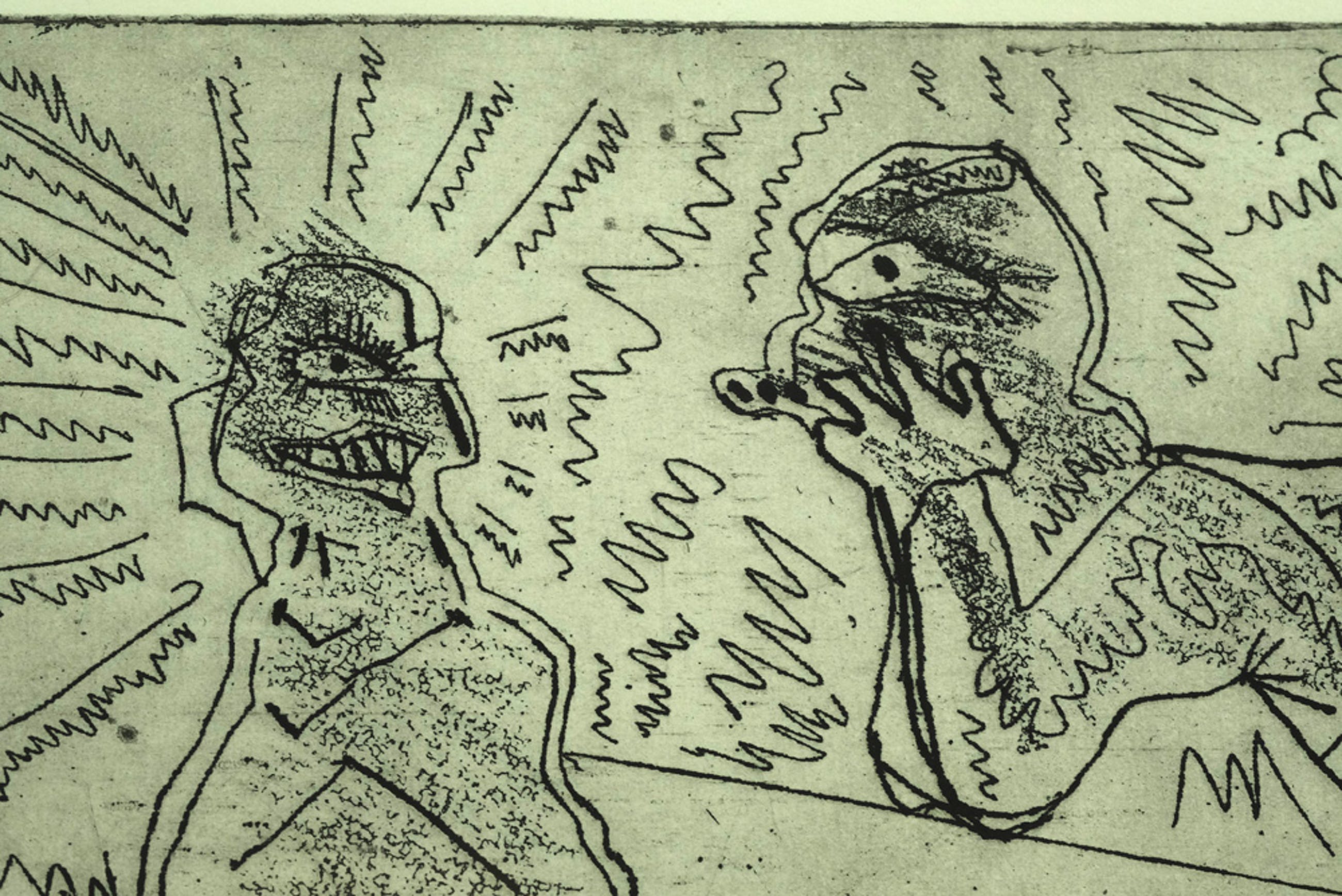 Een fraaie ets voorstellende twee mensen in gesprek vergezeld door een poes / kat.