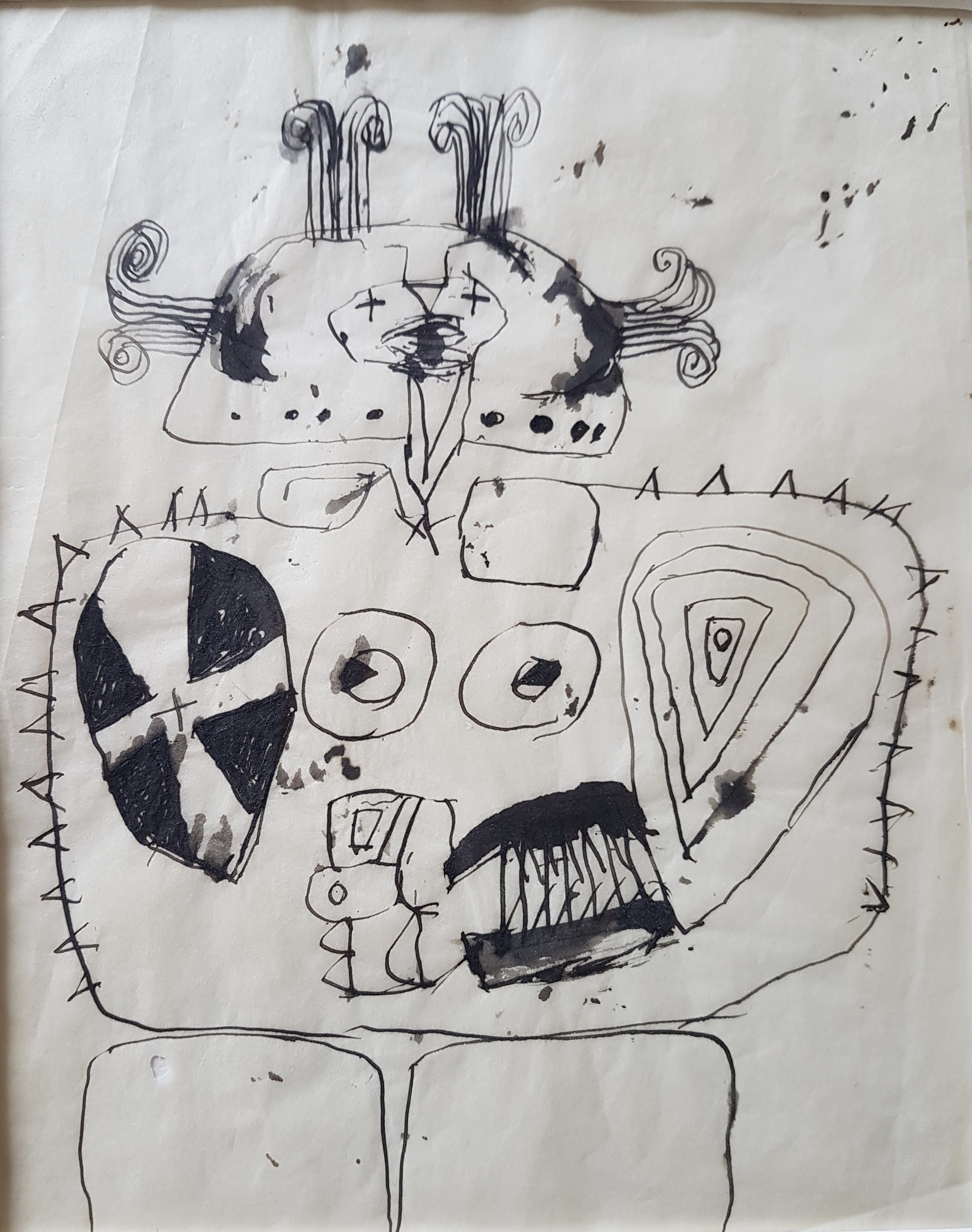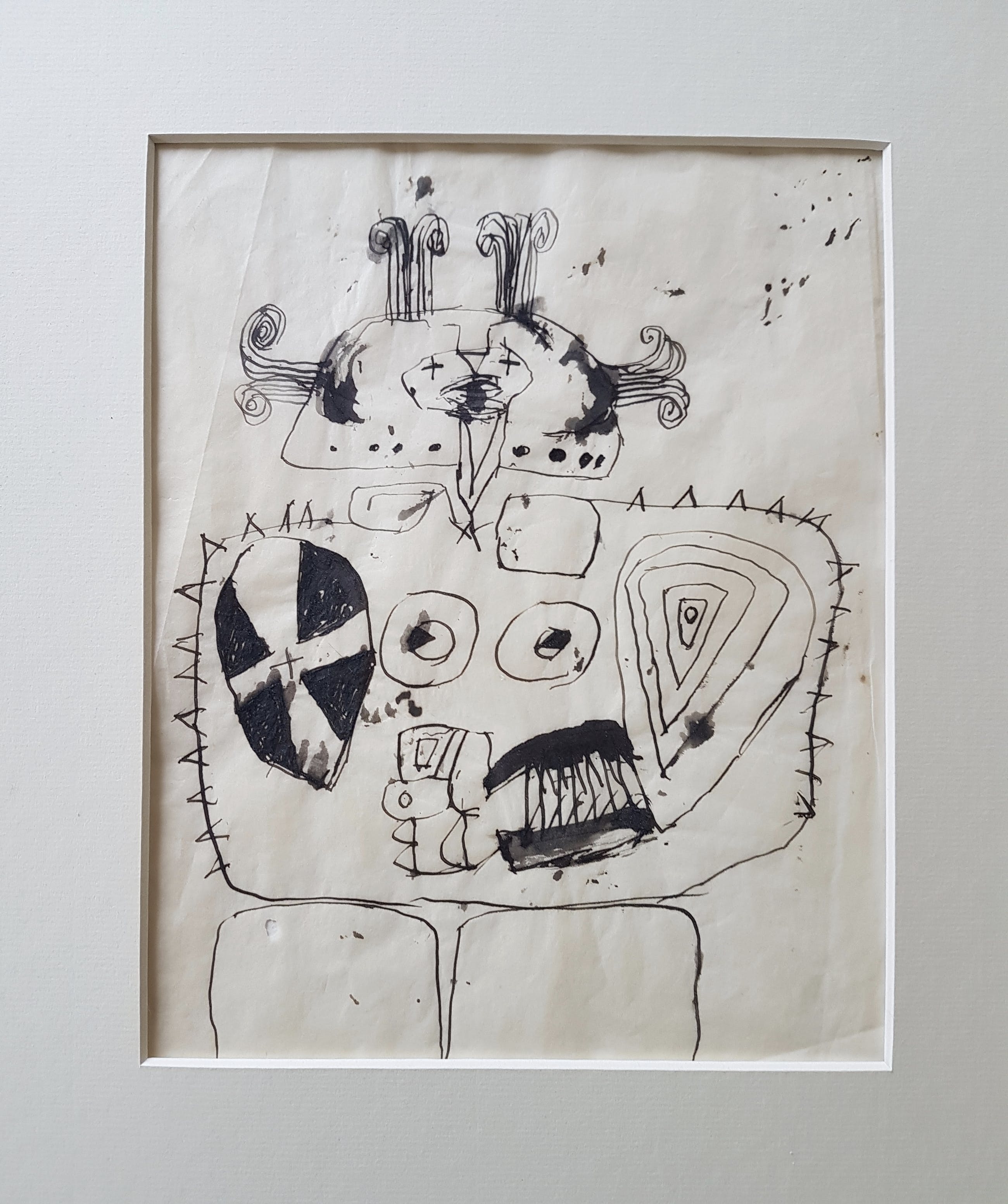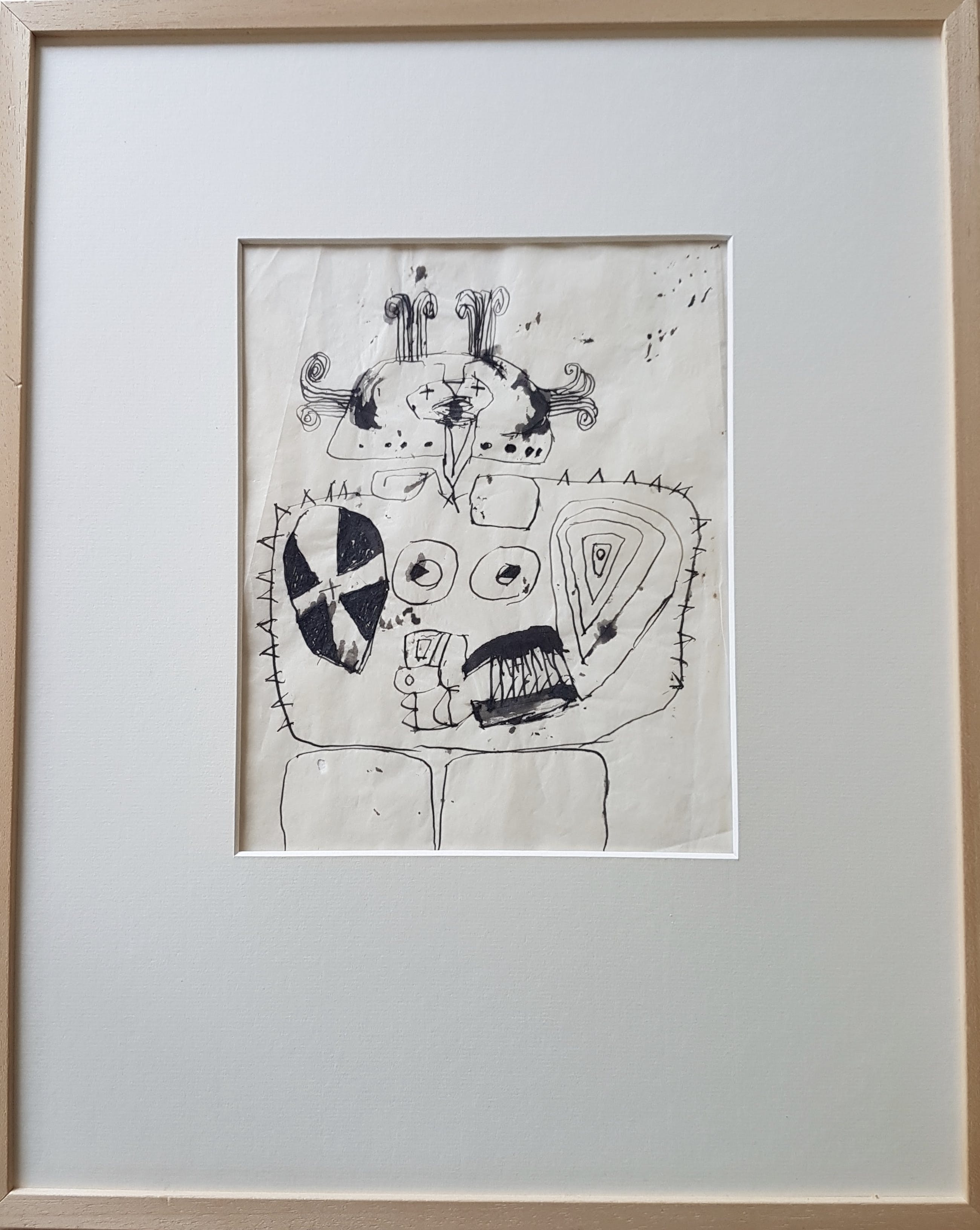 Fraai vroeg werk van Lucebert ( pen en penseel op papier Japon ) Werk komt uit nalatenschap van de dichter Bert Schierbeek en is destijds bij Bubb Kuyper in Haarlem in één lot geveild samen met een wel gedateerde (1950 ) en gesigneerde tekening op papier Japon uit dezelfde collectie . Lucebert was eind 1949 bij Bert Schierbeek en diens vrouw , de pottenbakster Frieda Koch, ingetrokken in de van Eeghenstraat te Amsterdam. Lucebert kreeg een relatie met Frieda , wat voor een aantal jaren durende ingewikkelde driehoeksverhouding zorgde .