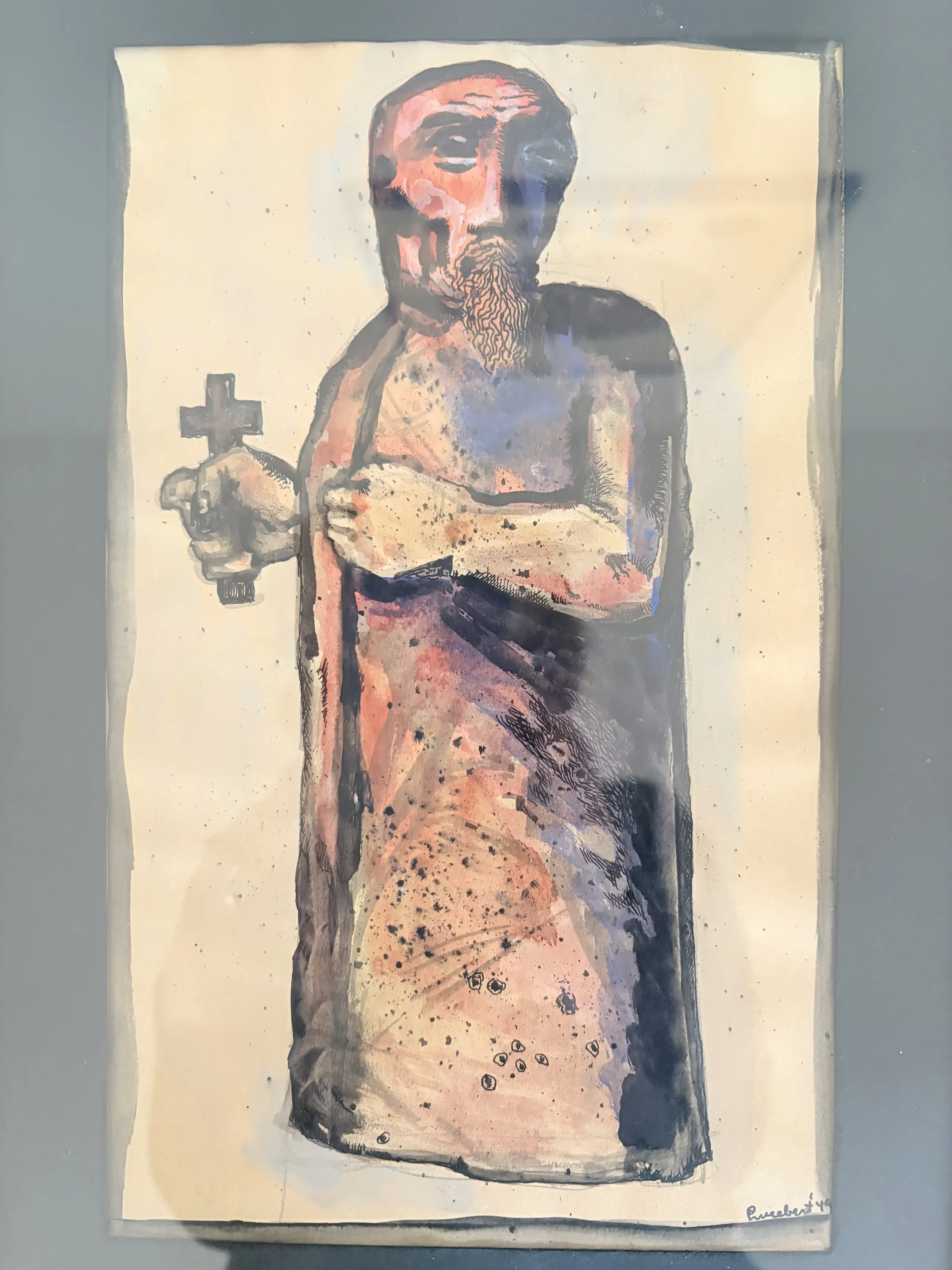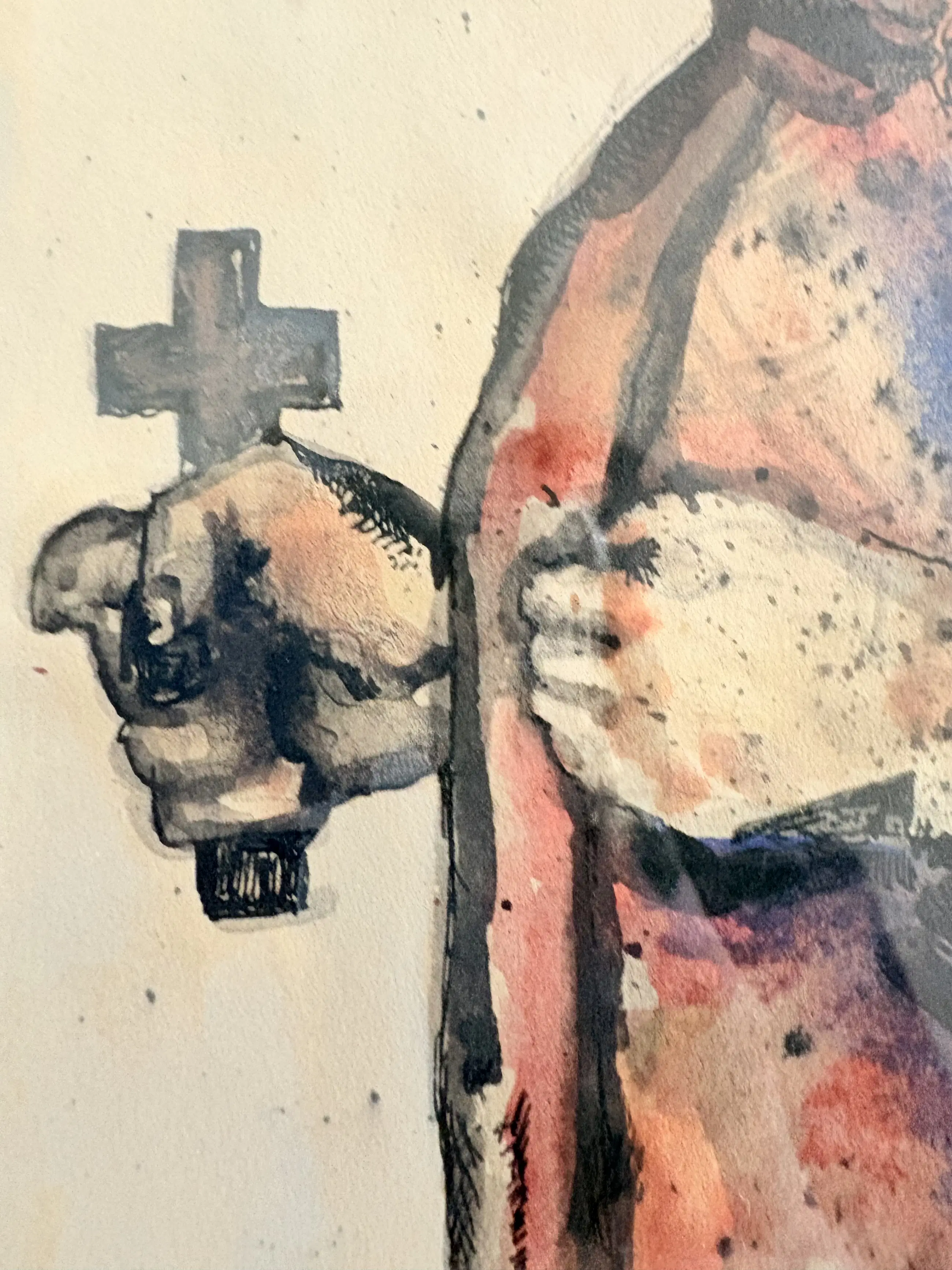 The reclining figure holds a cross-like form, introducing religious symbolism —an element often present in post-war European expressionism, where faith, suffering, and the body collide in direct, unidealized imagery.