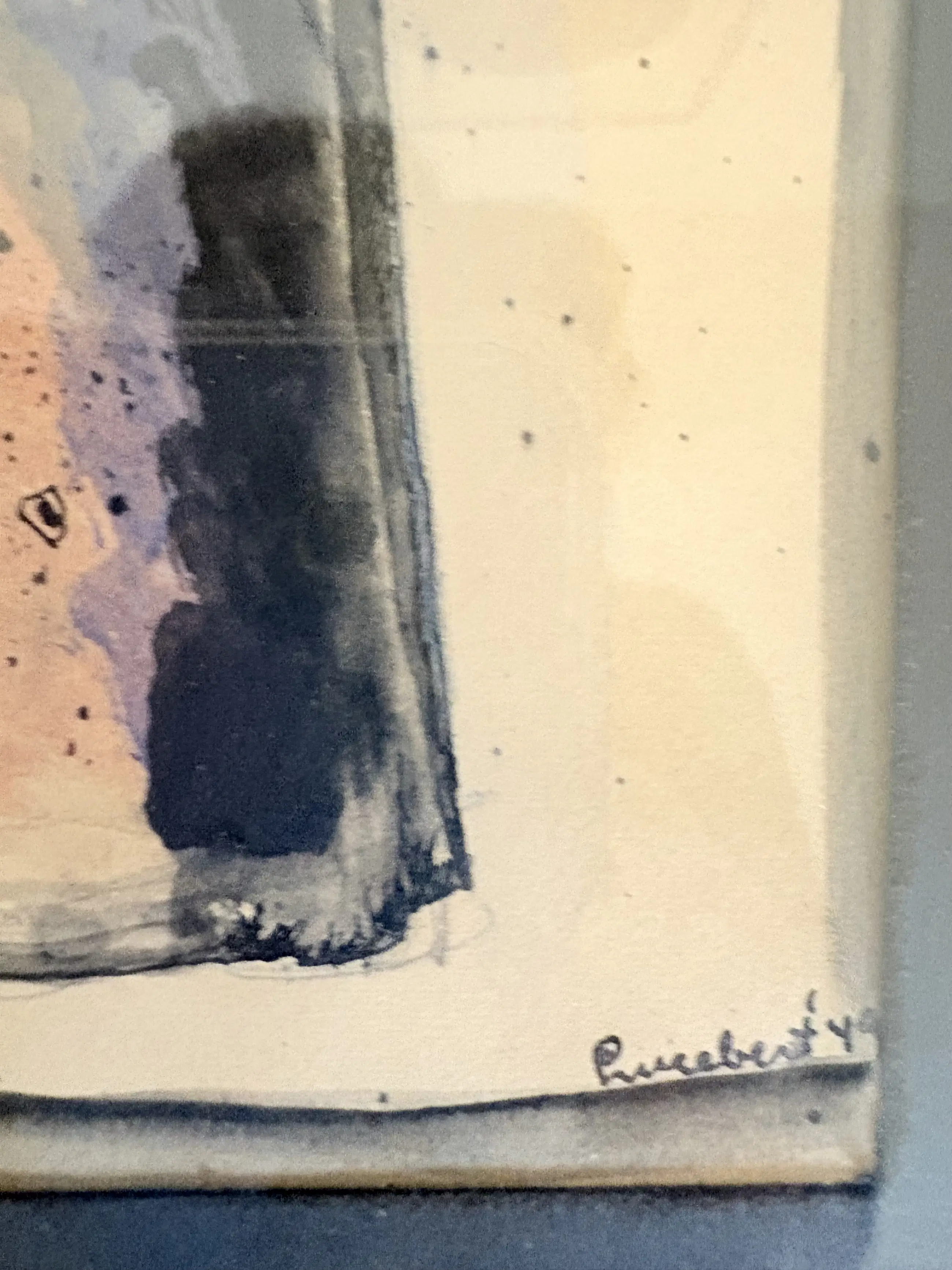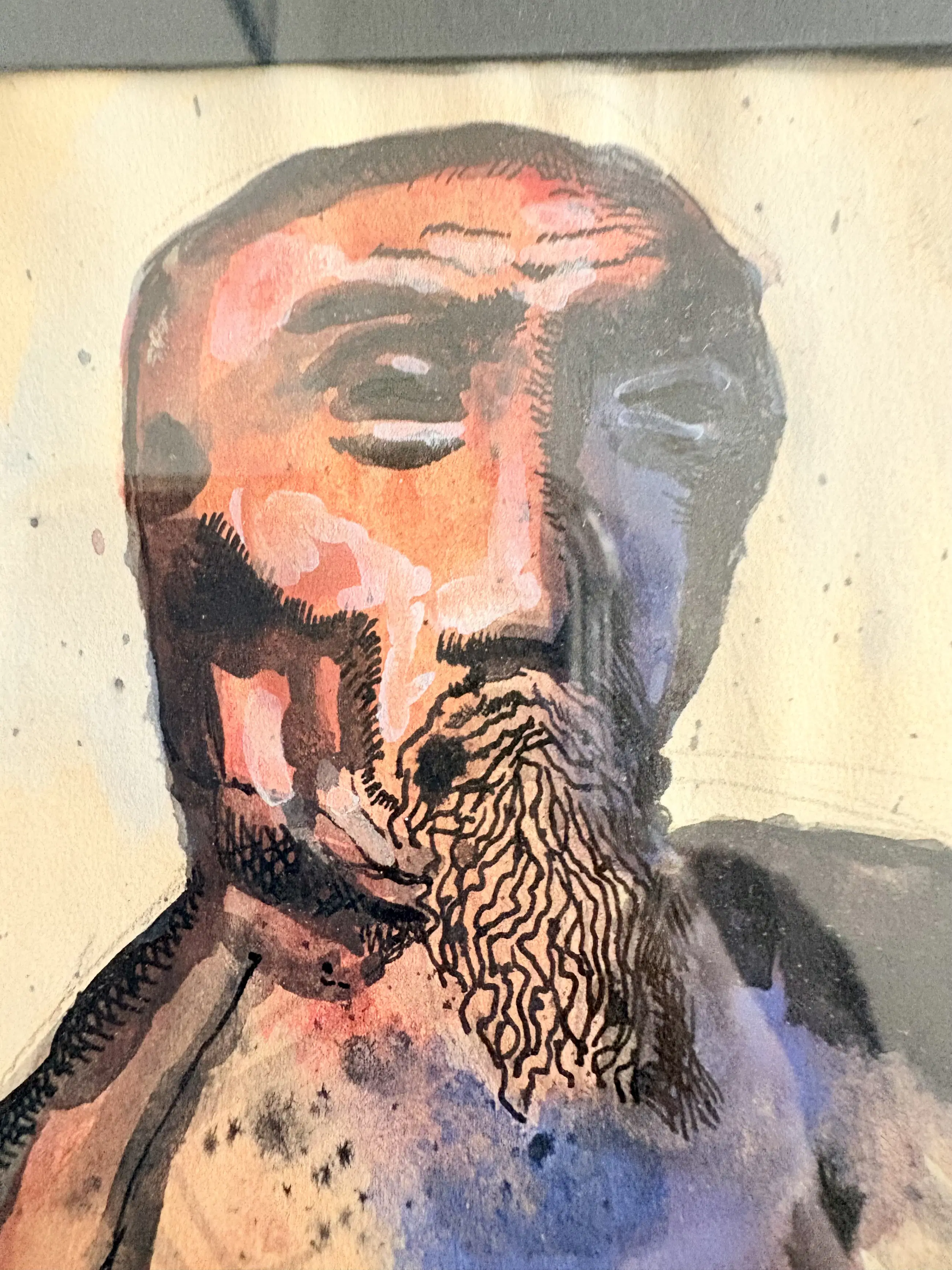 Expressive figurative work in ink and watercolour, strongly aligned with Lucebert’s early CoBrA language: raw gestural washes, nervous black linework, and an intense, psychologically charged face built from rhythmic hatch marks. The palette (indigo/violet against warm flesh tones) and the deliberately “unfinished” atmospheric background are typical of the spontaneous, anti-academic CoBrA sensibility.