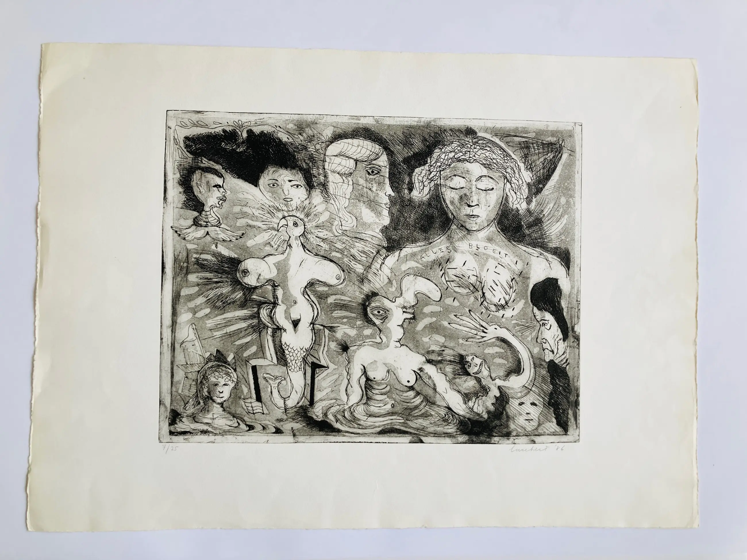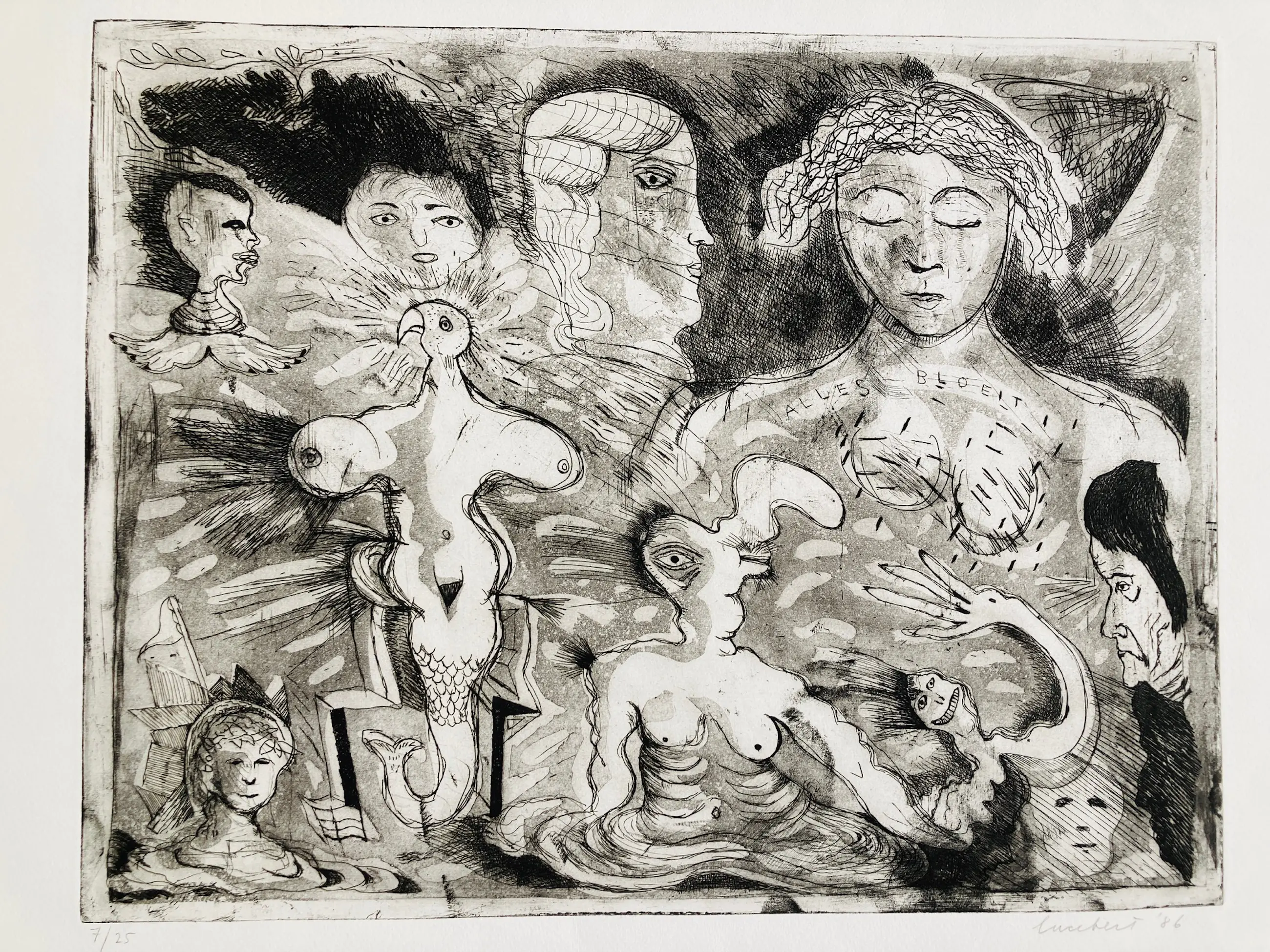 Expressionistisch werk van Cobra-kunstenaar Lucebert. Genummerd en gesigneerd door de kunstenaar. Het ets is van goede kwaliteit. In de witranden zien we lichte gebruik sporen. U kunt het werk vooraf komen beoordelen in de schatkamer van galerie Rotor in Gorcum. In overleg kunt u uw aankopen laten opslaan in onze verwarmde opslagruimte en ze in een later stadium ophalen. Wij kunnen ook uw inlijstingen verzorgen.