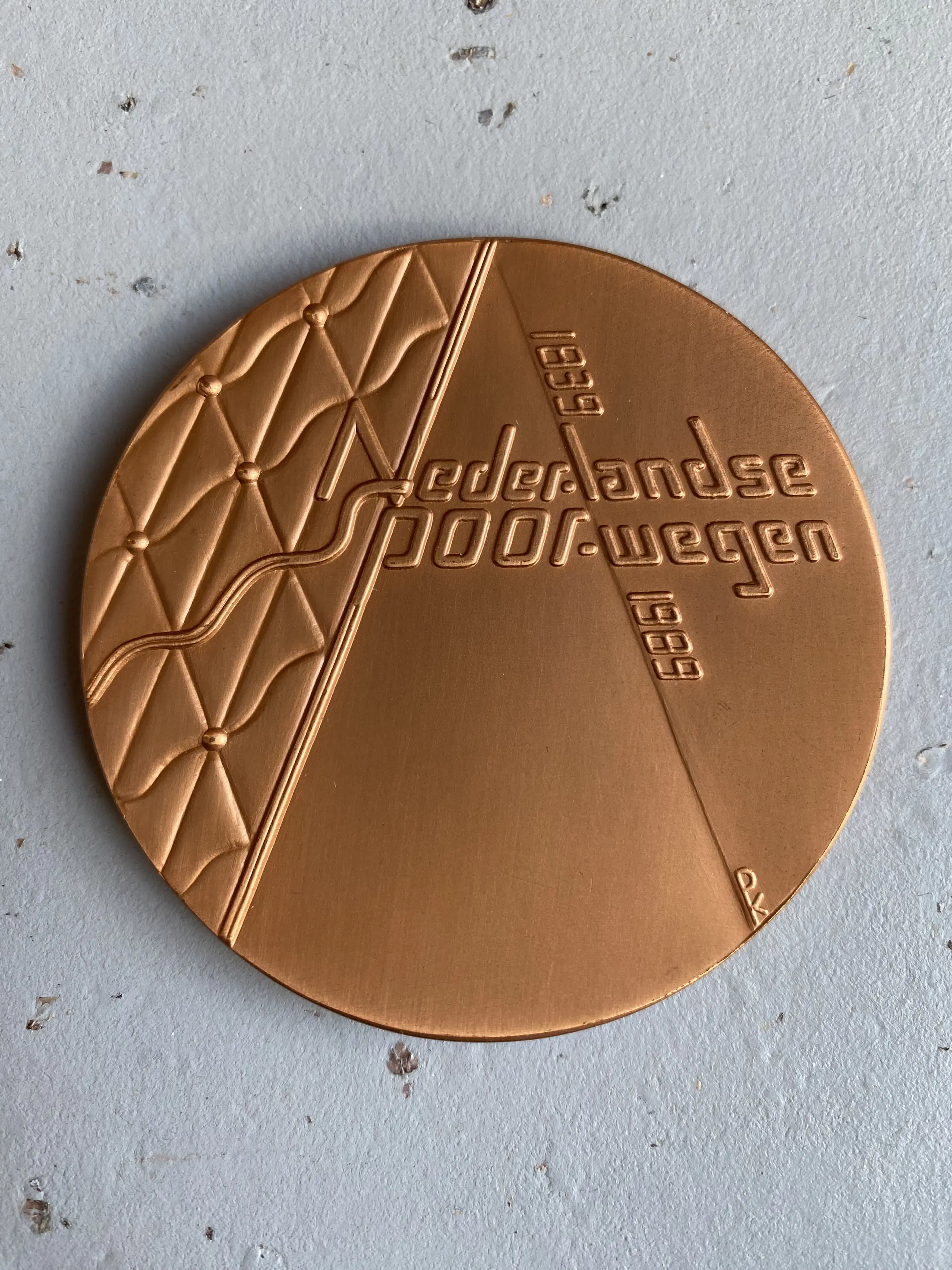 Specificaties • Ontwerper: Lucie Willemina (Lucie) Limperg-Nijland • Jaar: 1989 • Thema: 150 jaar Nederlandse Spoorwegen (1839–1989) • Materiaal: roodkoper • Diameter: ca. 65 mm