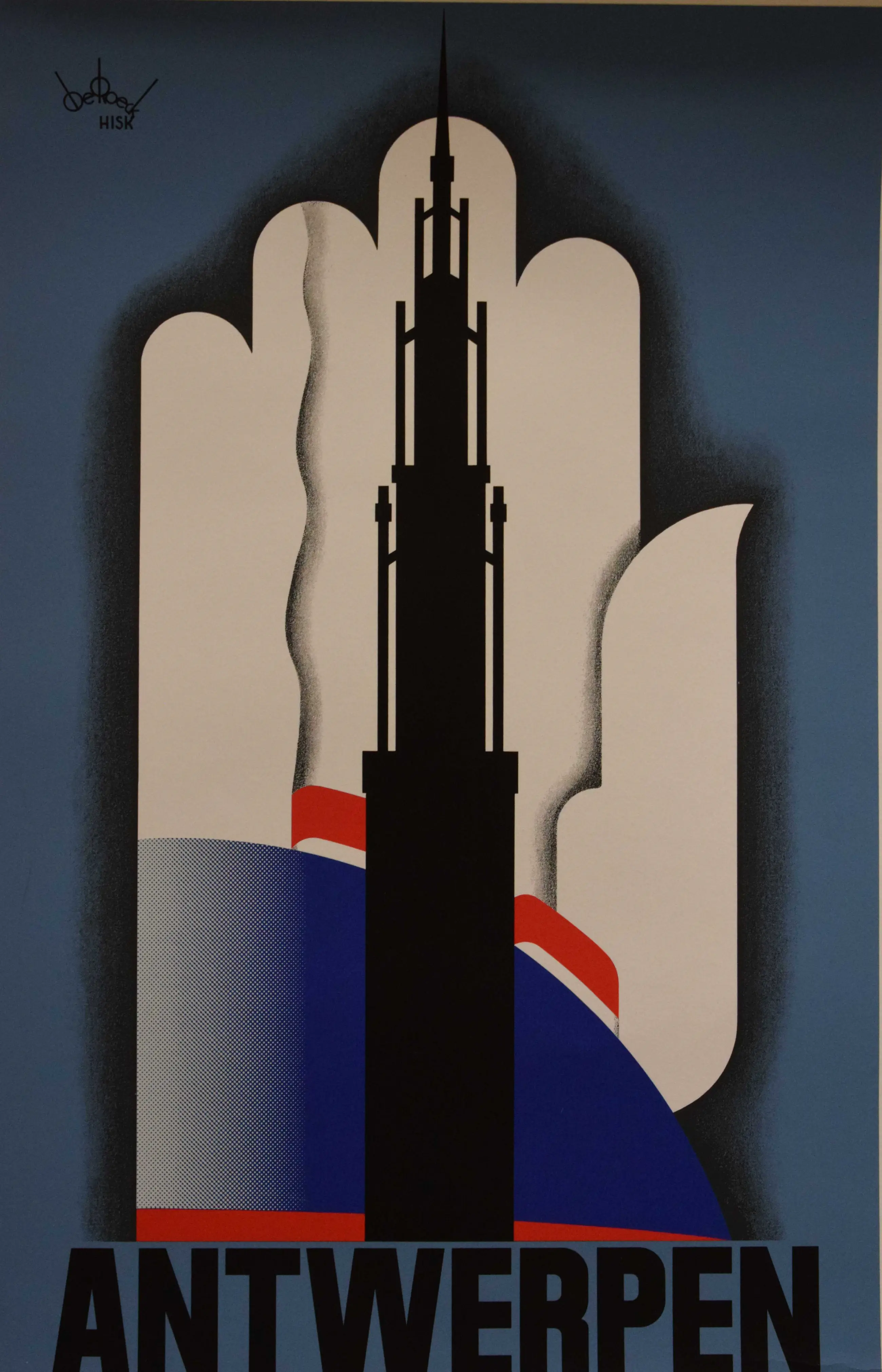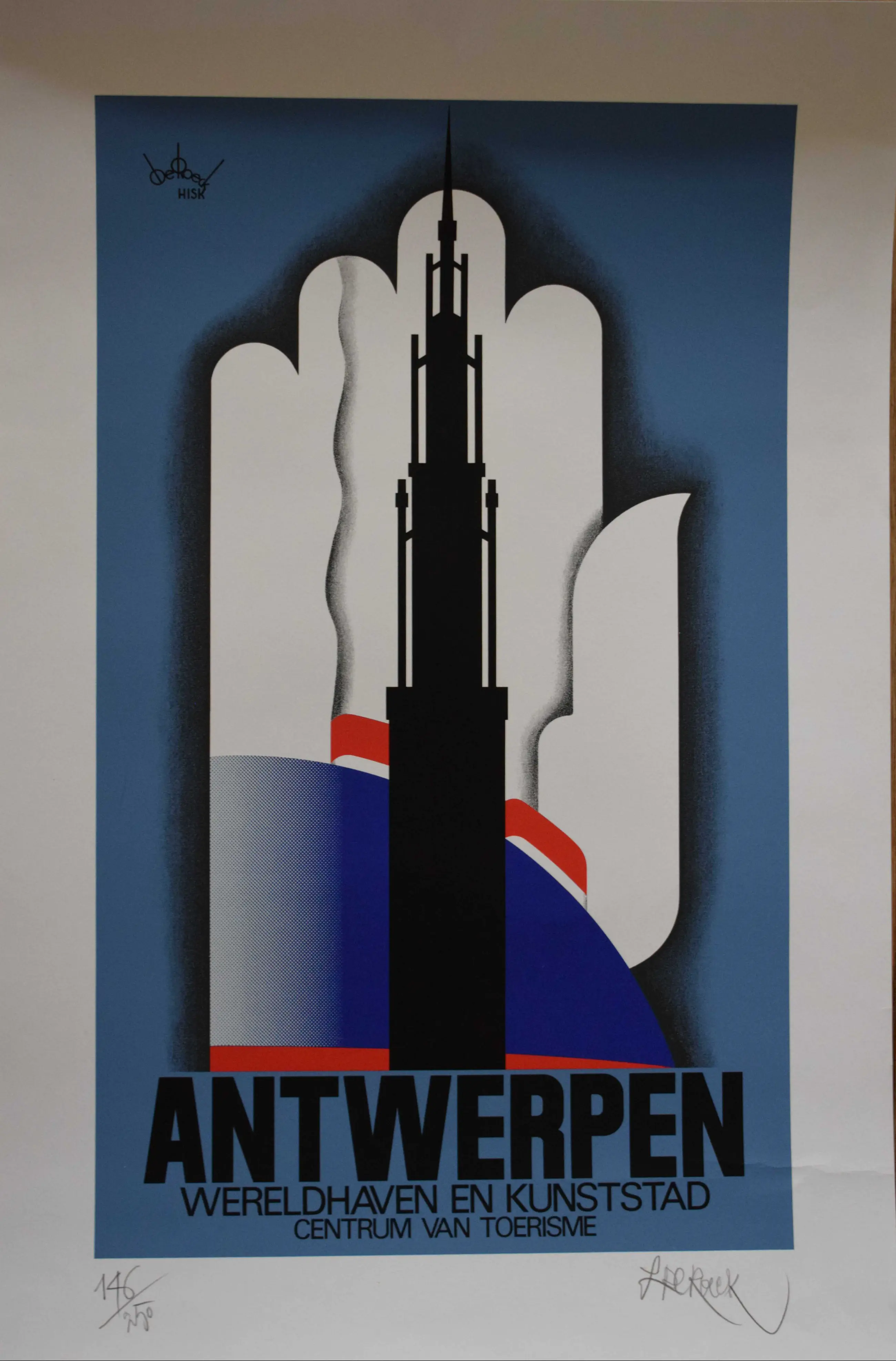 Heruitgave van een affiche uit 1934 ter promotie van de stad Antwerpen. Totale Afmeting: 70 x 43 Afbeelding : 55 x 33 cm.