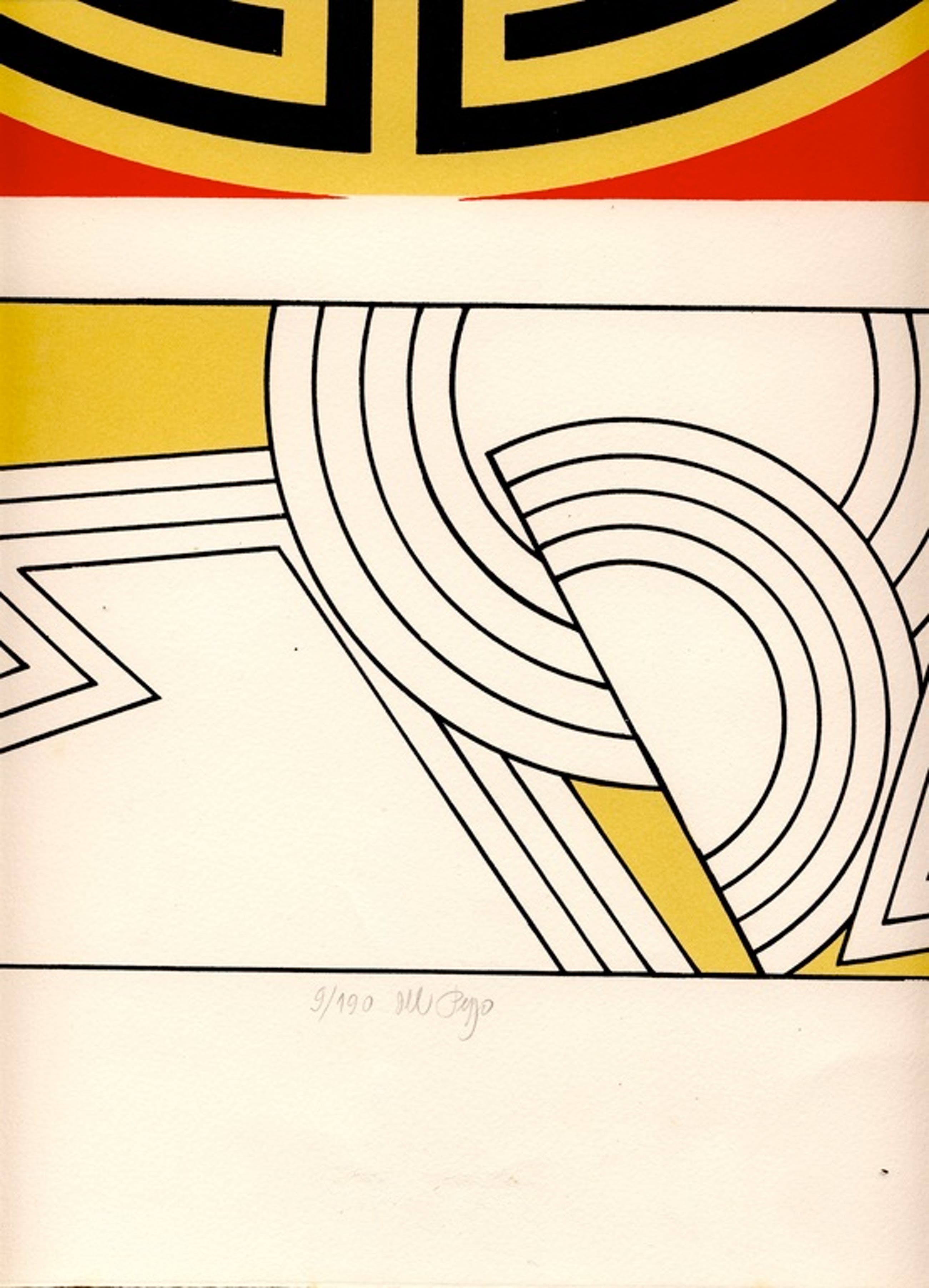 Del Pezzo is Italiaan en werkt in Parijs en Milaan. Dit werk wordt gerekend tot de stroming “Nieuwe Realisten” en is handgedrukt uit serie 6 van “Prent 190” uit 1970/71, door kunstenaar gesigneerd en voorzien van exemplaarnummer 9/190.