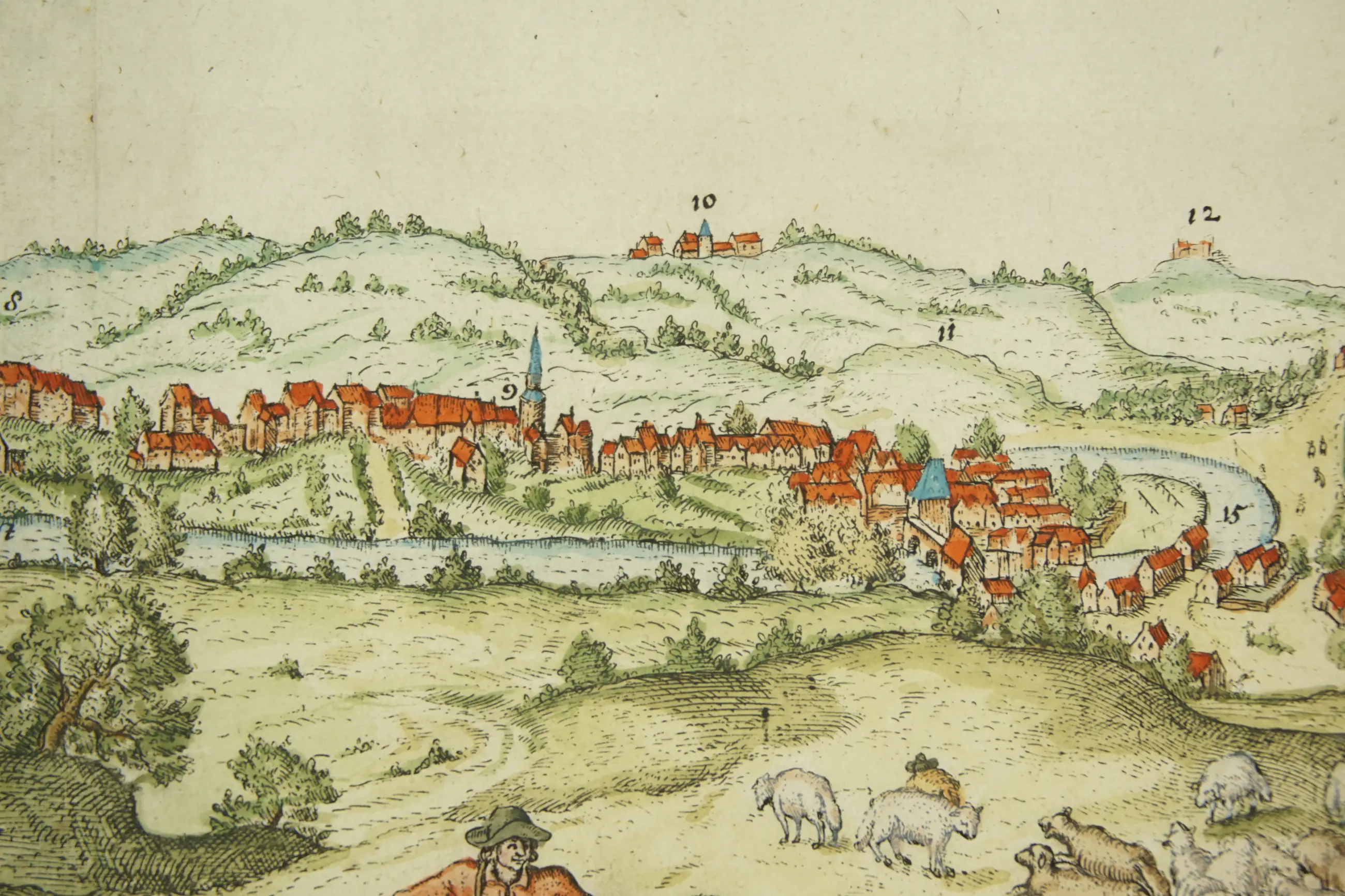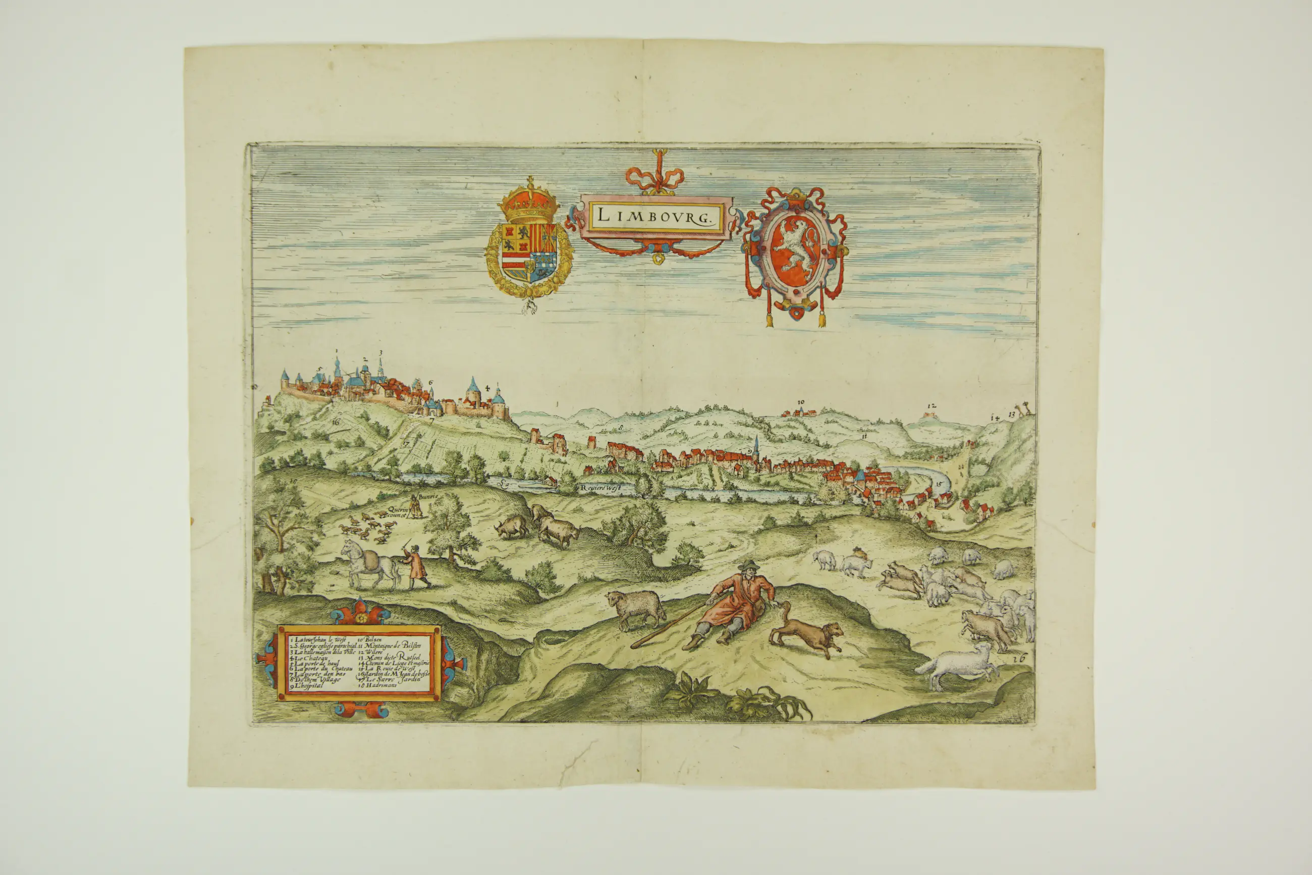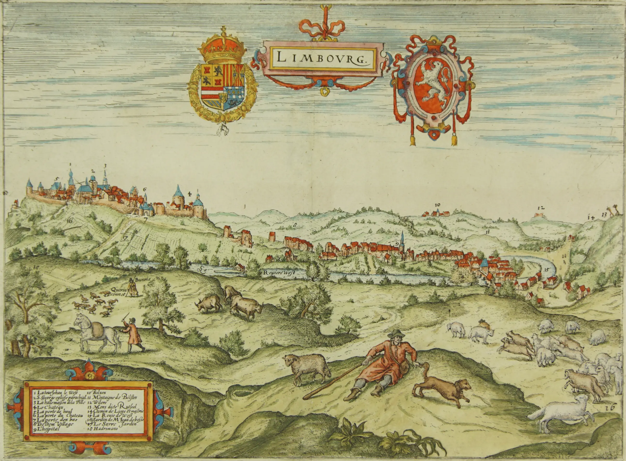 Profielaanzicht van de stad Limburg uit Lodovico Guicciardini's beschrijving van de Lage Landen. Uitgegeven door Willem Blaeu in 1612 te Amsterdam.