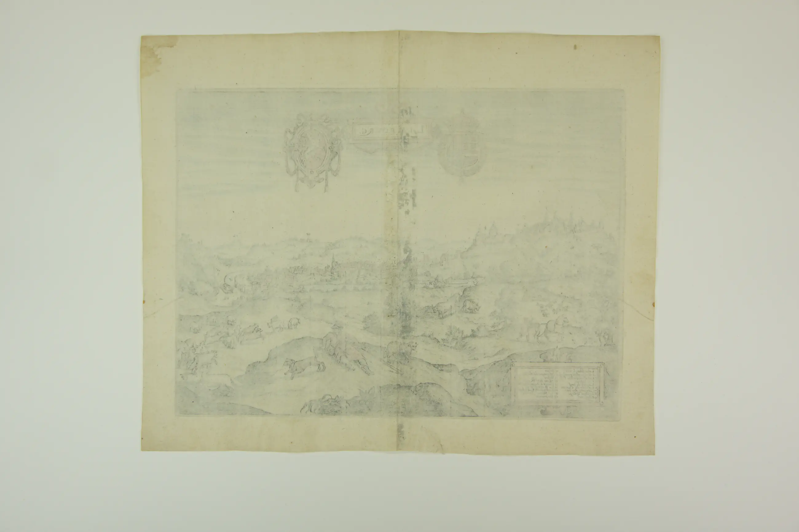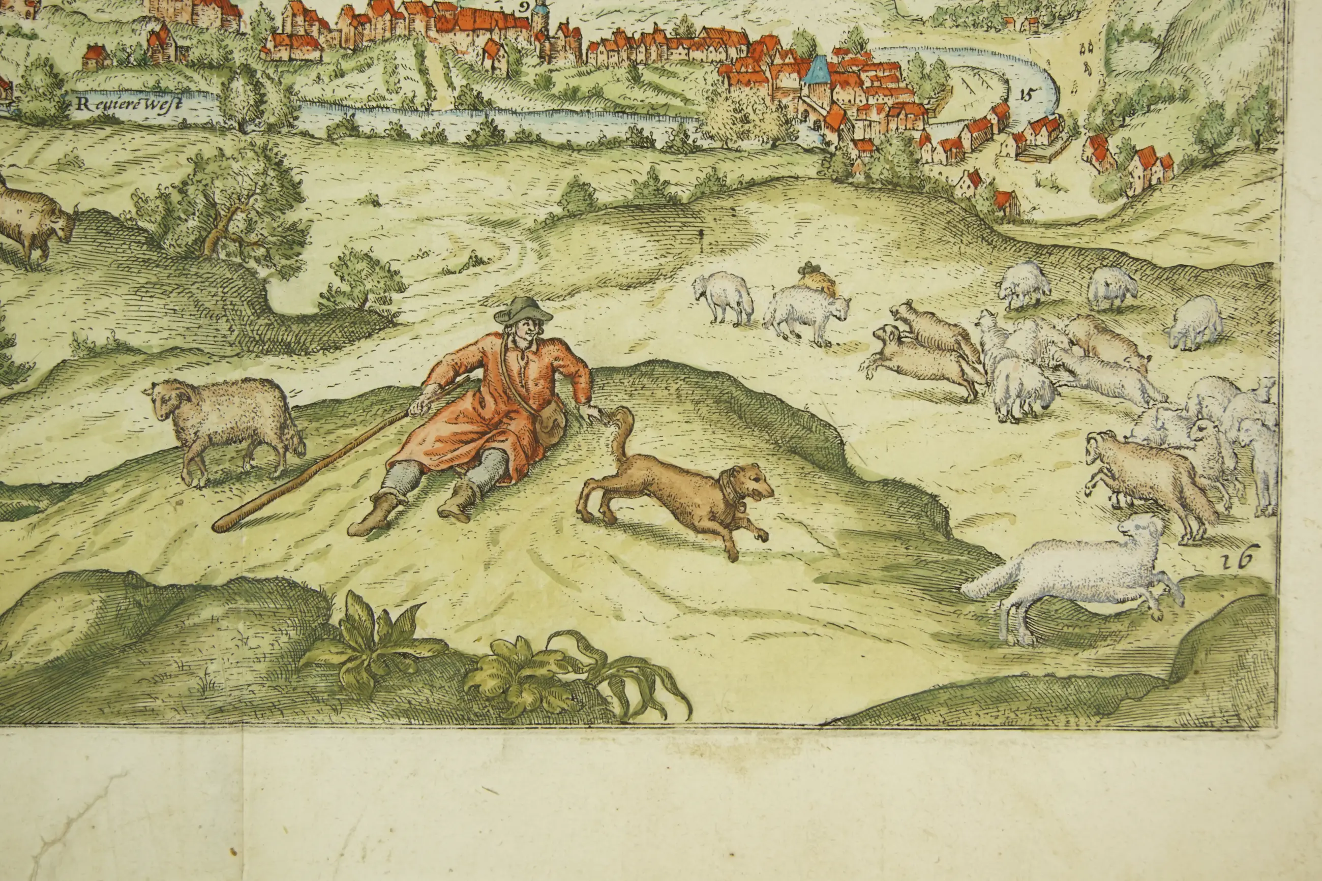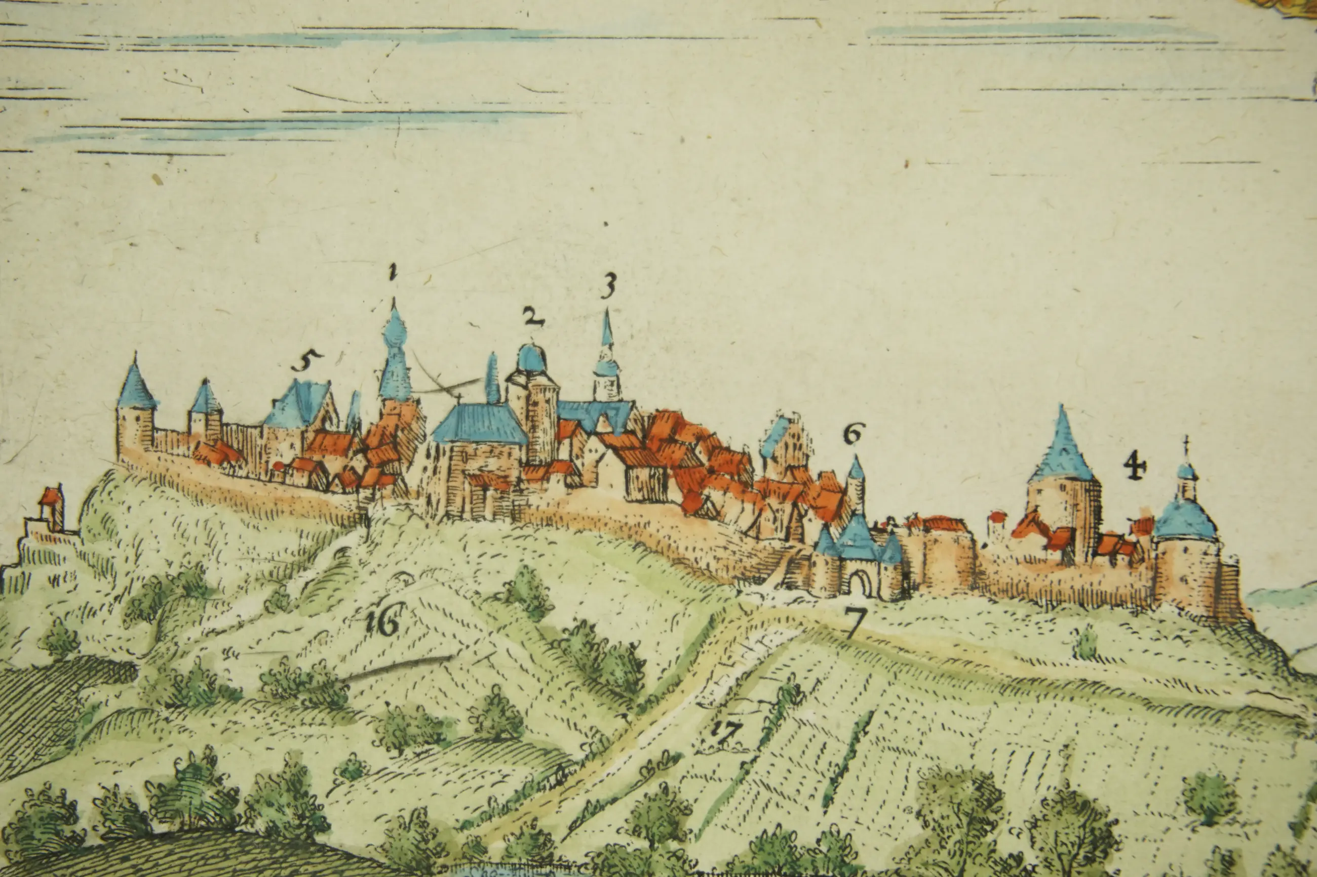 Profielaanzicht van de stad Limburg uit Lodovico Guicciardini's beschrijving van de Lage Landen. Uitgegeven door Willem Blaeu in 1612 te Amsterdam.