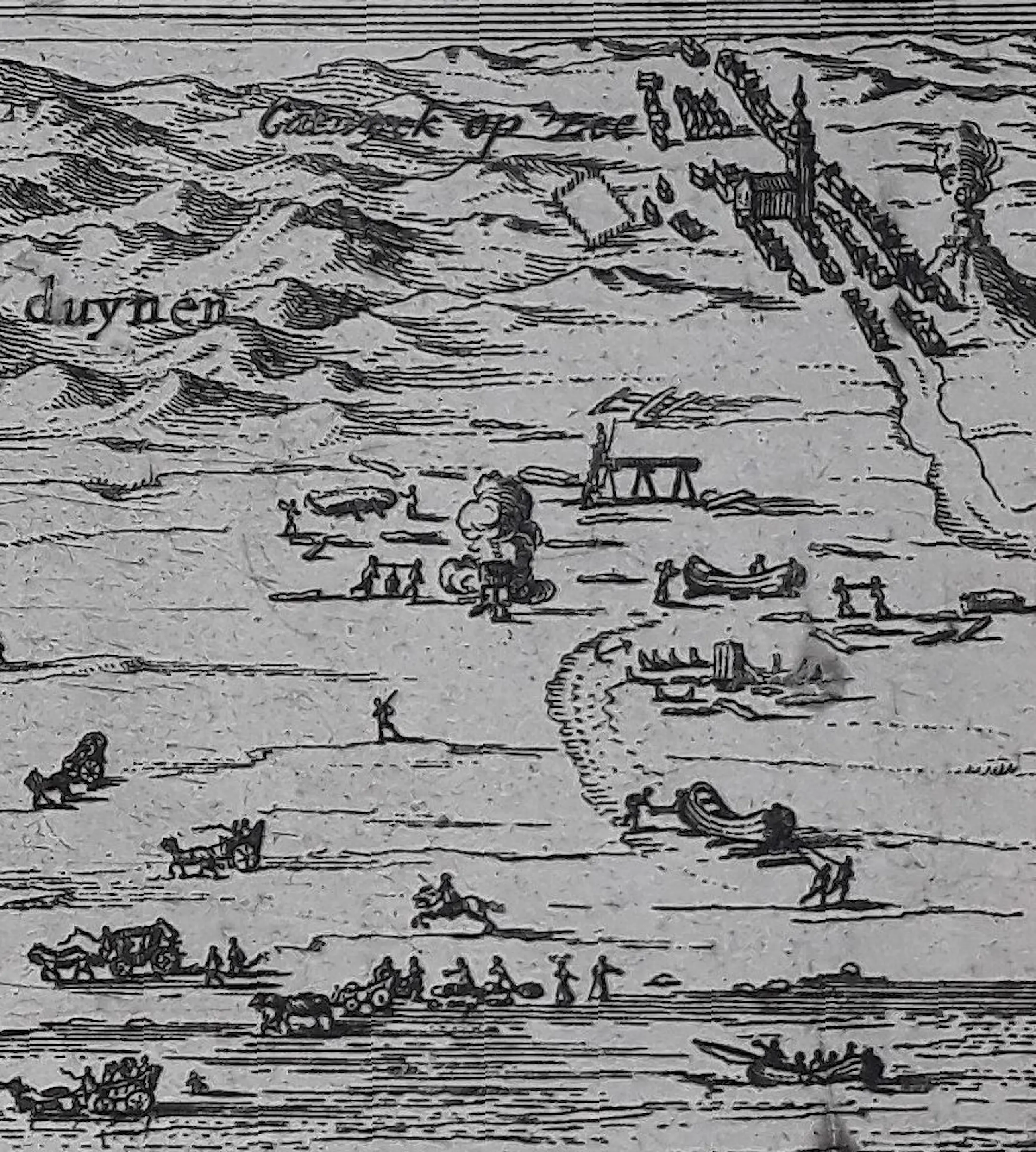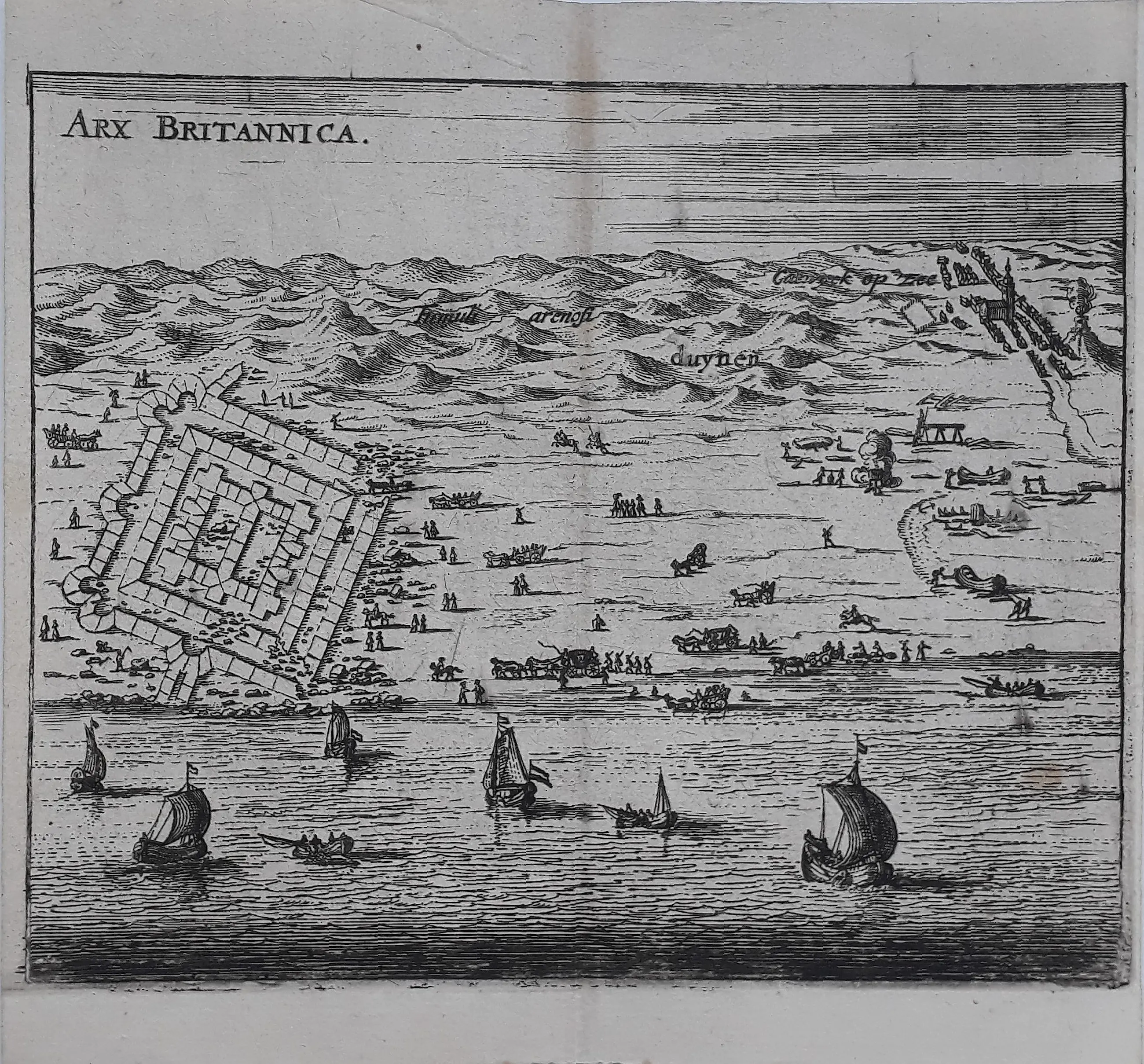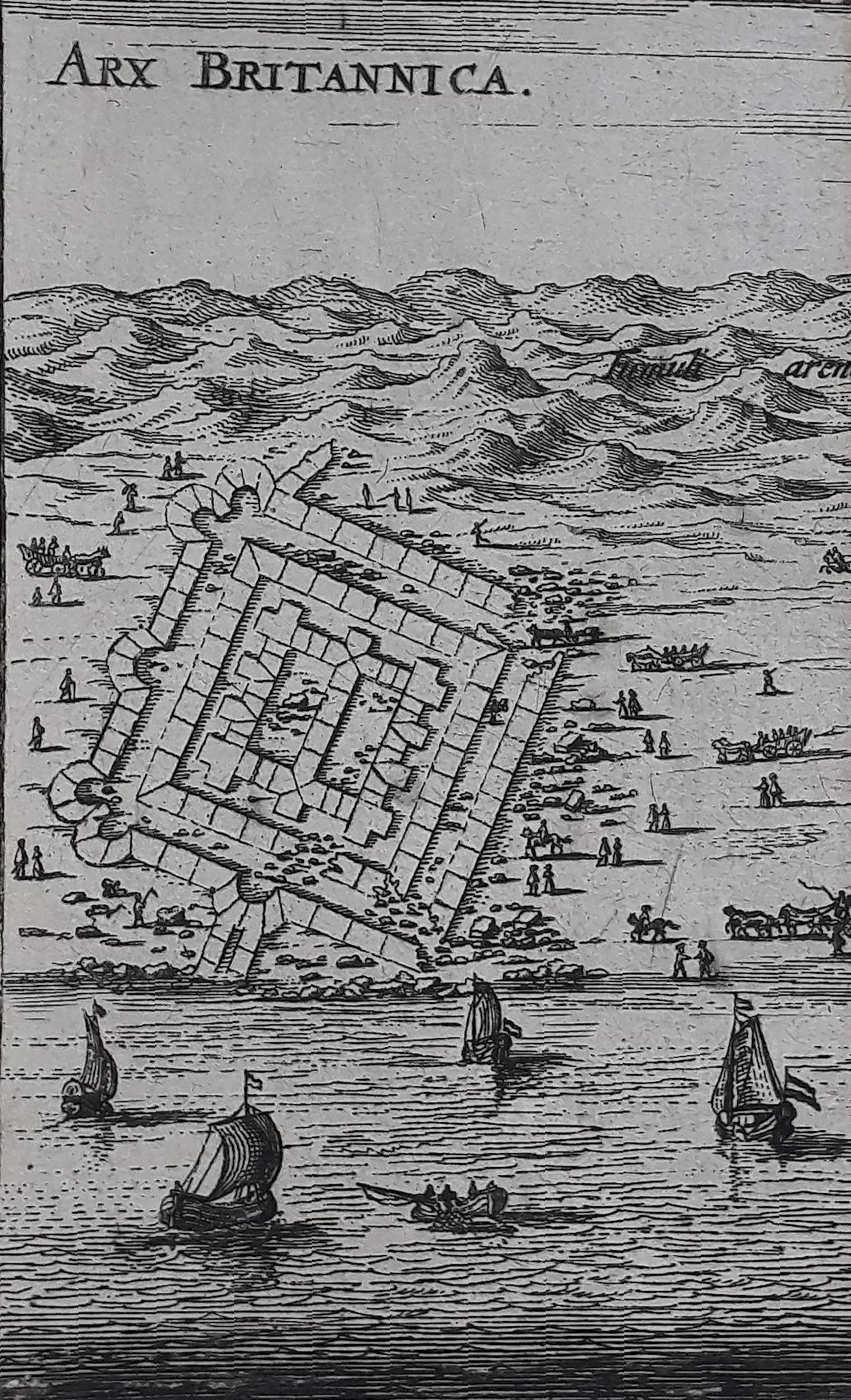 Kustlandschap nabij de Rijnmonding tussen Katwijk en Noordwijk. Vogelvlucht met een plattegrond van de fundamenten van Brittenburg. Op de voorgrond boten op zee.