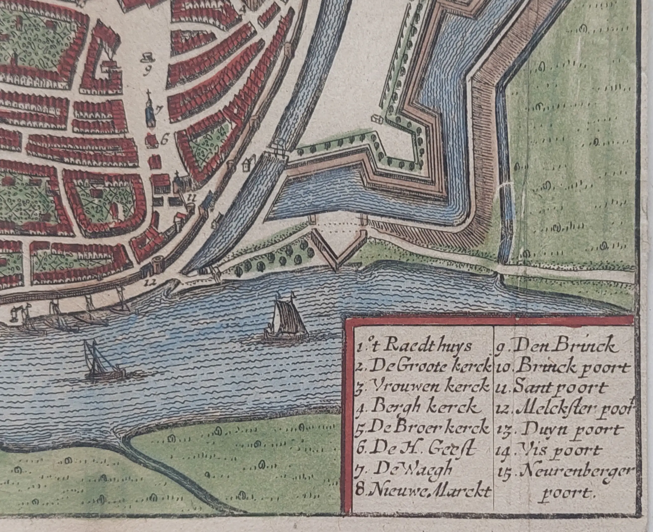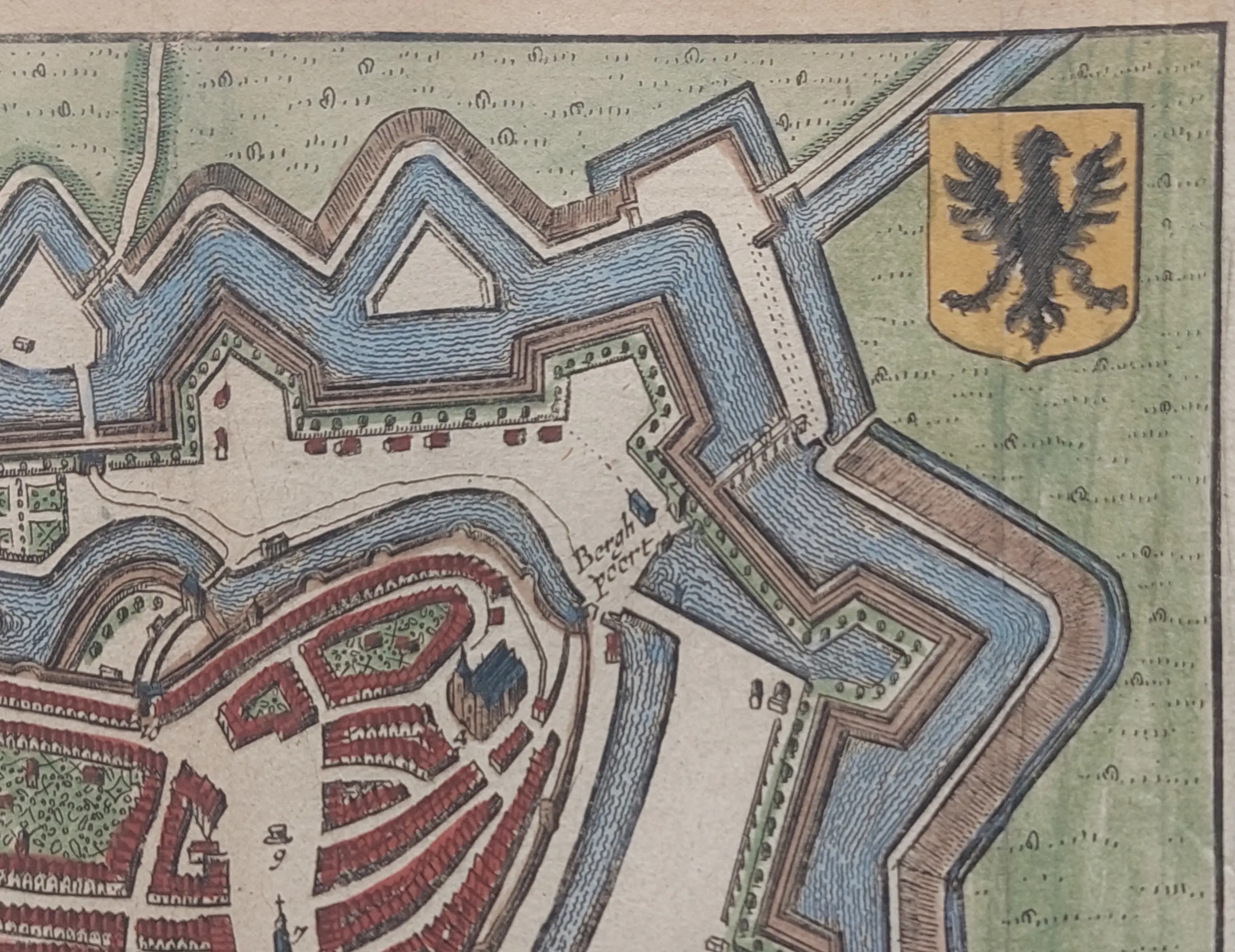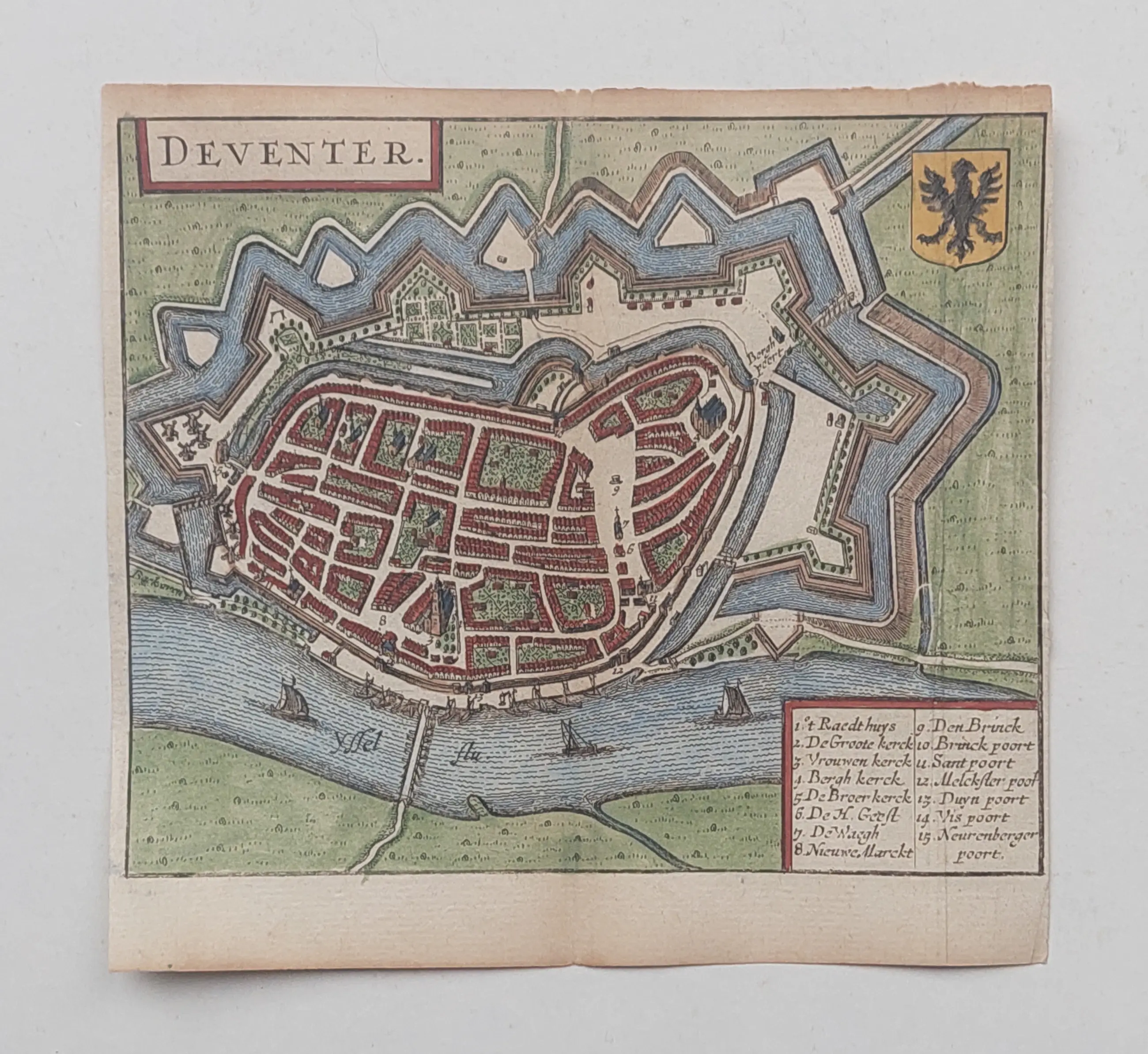 Prachtige handgekleurde klein formaat plattegrond, met titel, legenda en wapen.
