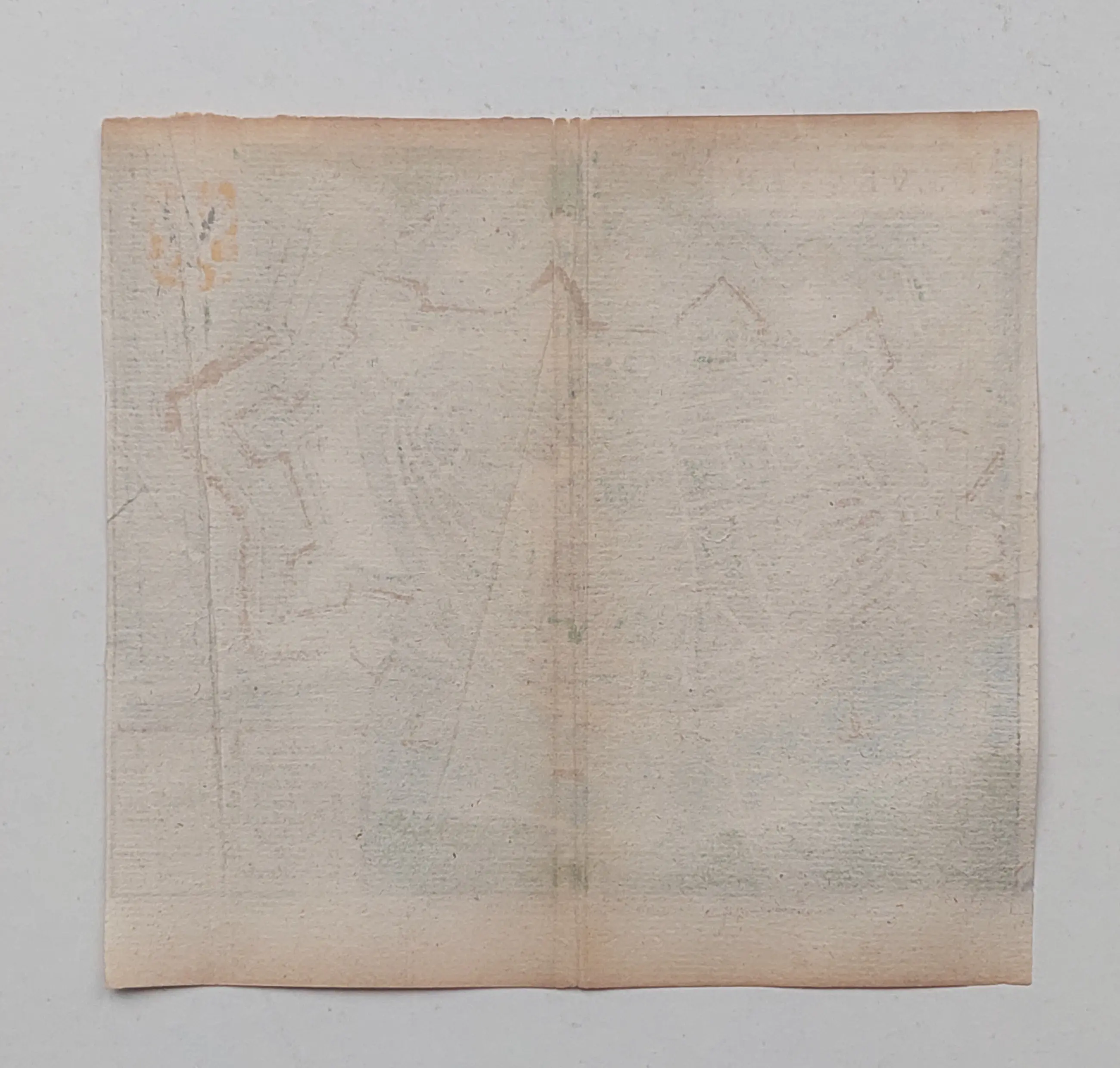 Conditie: zeer goed. Voldoende marges, rechts korter, maar originele marges. Middenvouw als uitgegeven. Verso: blank. Mooi handgekleurd.