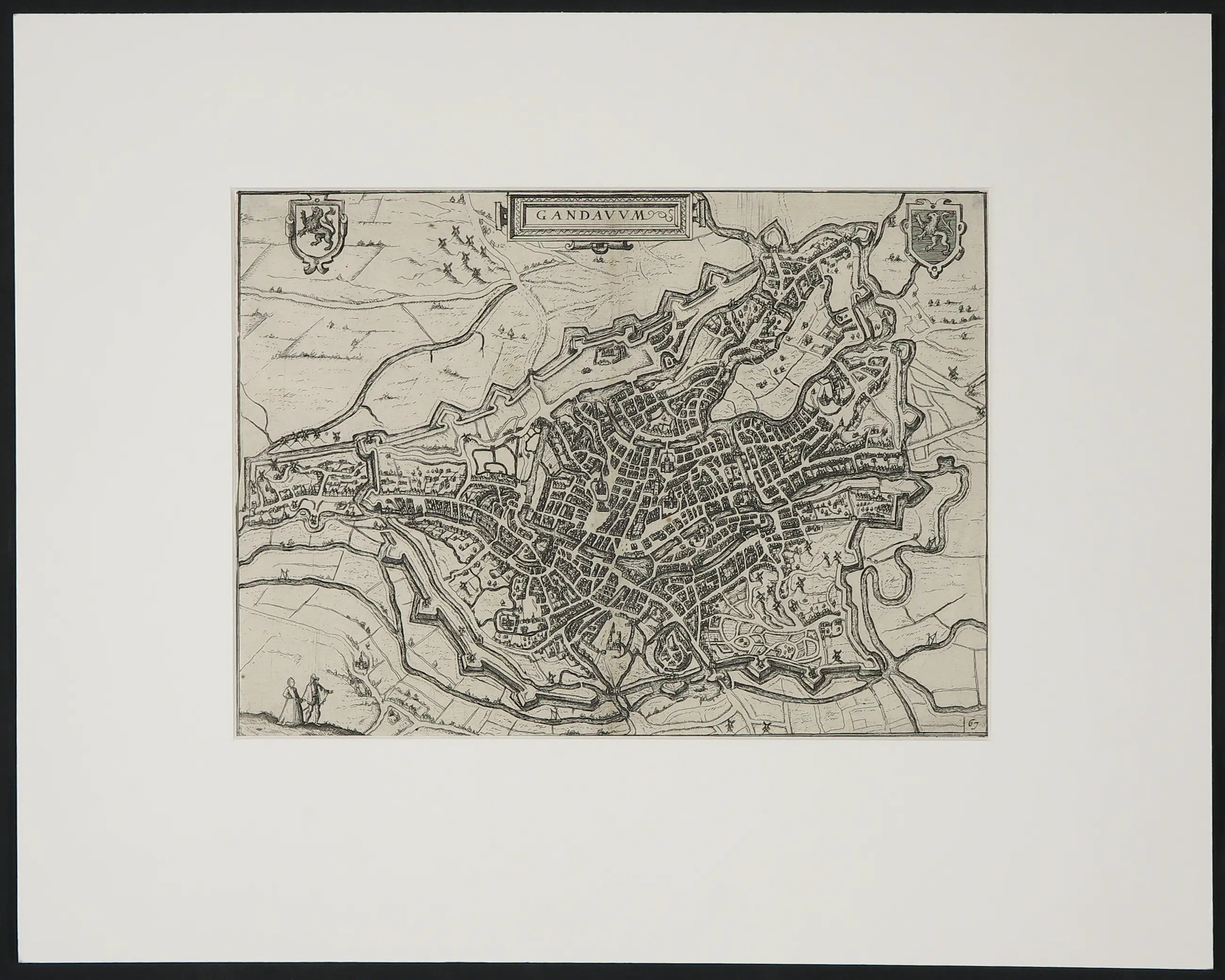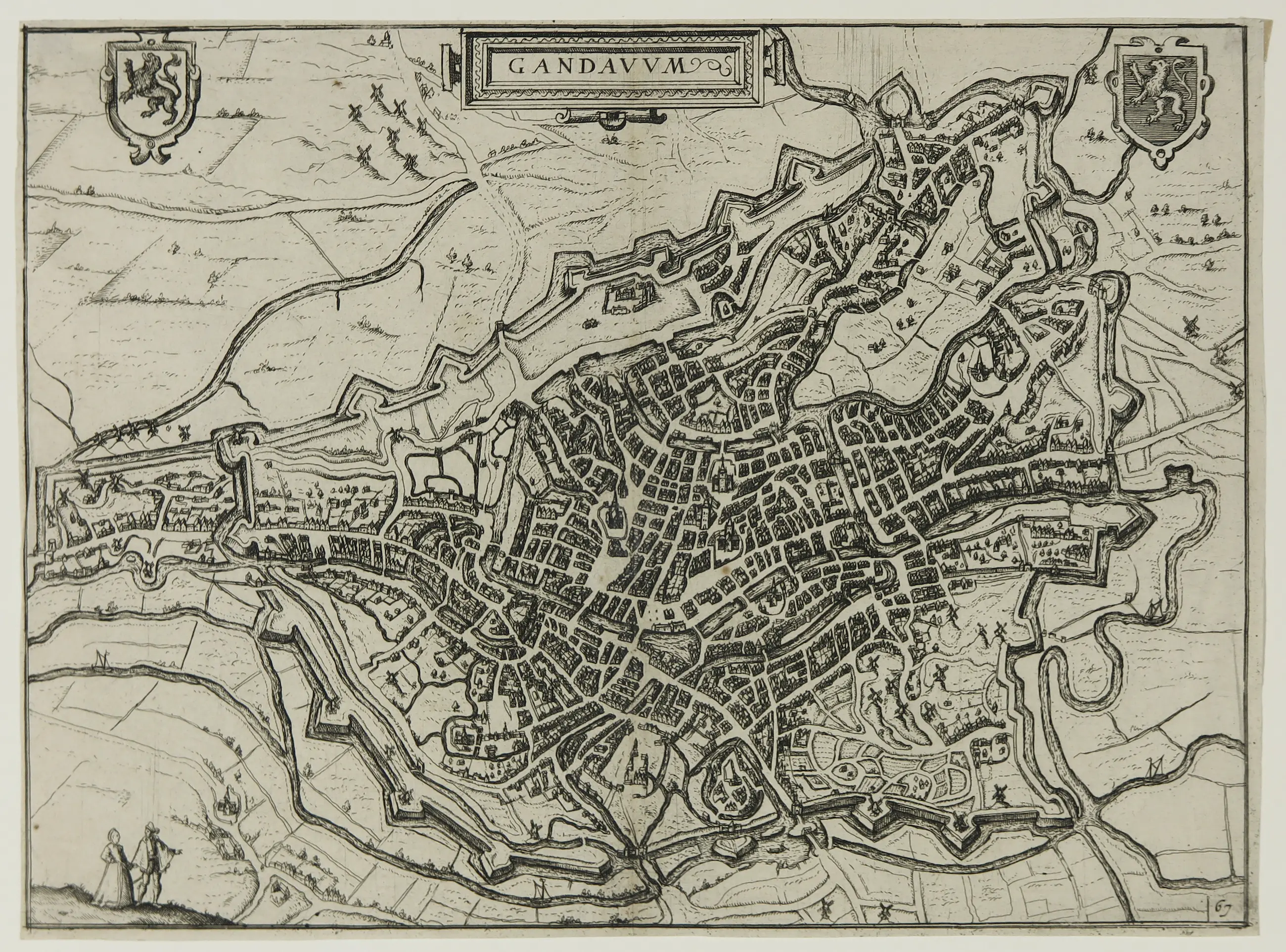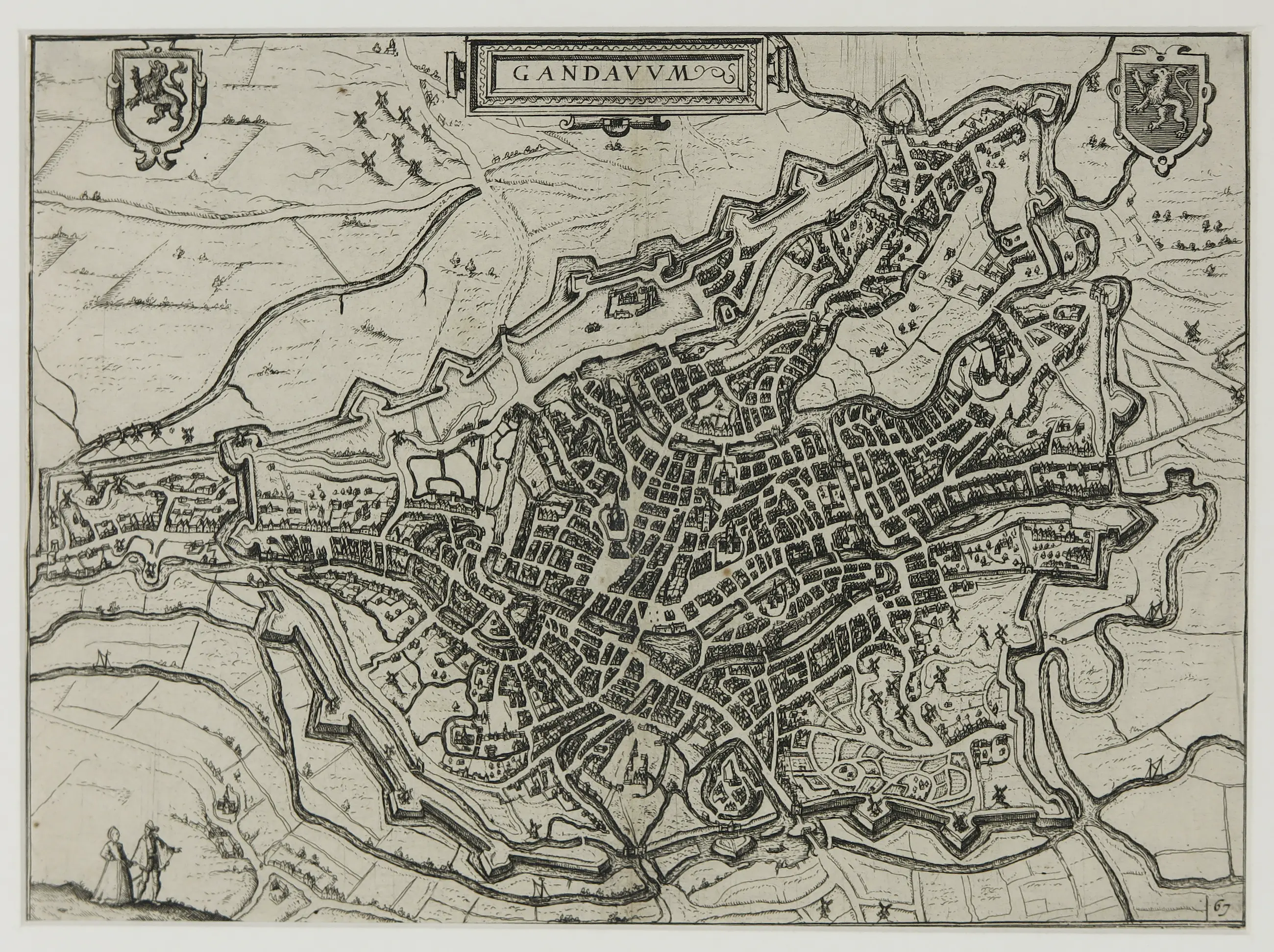 Kopergravure door de cartograaf Ludovico Guicciardini. Te zien is de stad Gent (Gandavum), omstreeks 1625. De gravure is onderdeel van Guicciardini's "Beschrijvinghe van alle de Nederlanden...", uitgegven door Plantin in 1582.