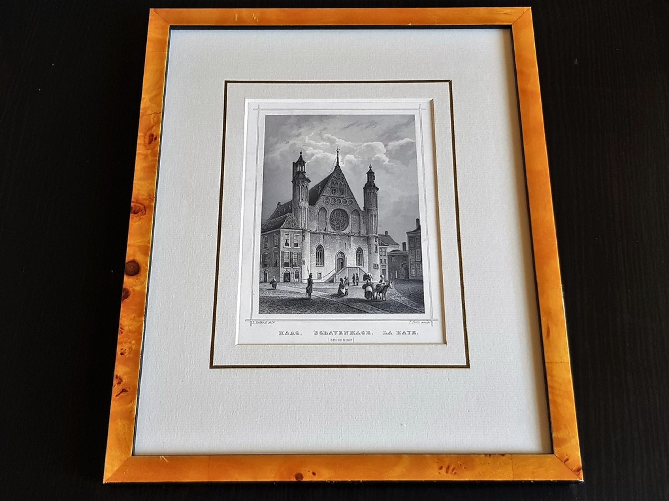 Staalgravure met de voorstelling van het Binnenhof, Den Haag. Tekenaar: L. Rohbock. delt. Graveur: F. Foltz. sculpt. Afm totaal: 32 x 26.5 cm. Beddlformaat: 17 x 12.5 cm. Inclusief: een heel mooi lijstje, glasplaat en ophangmogelijkheid. Het wordt extra goed ingepakt.