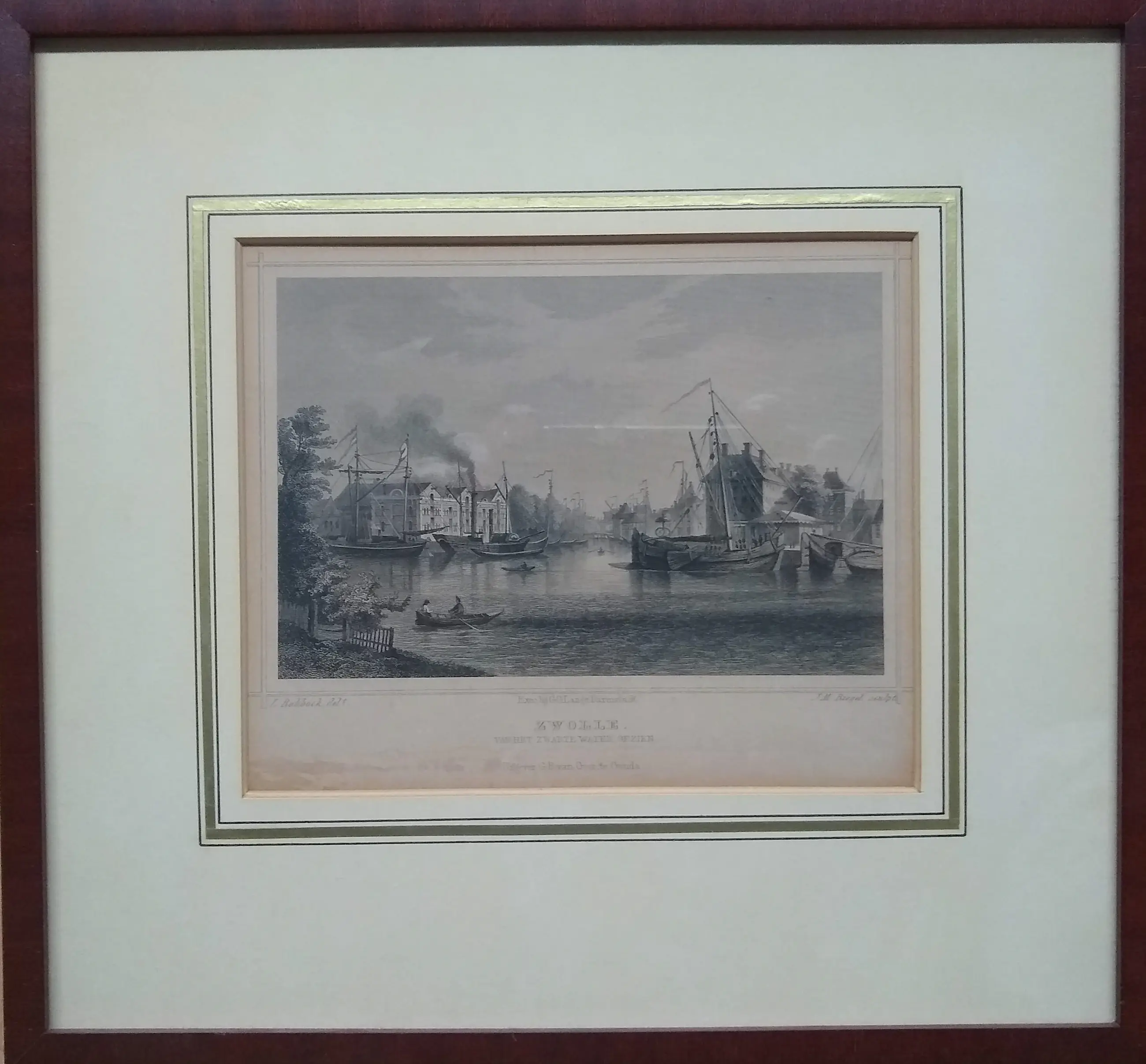 De gravuretekening zelf is in prima staat, randen van de omlijstig zijn enigzins verkleurd.