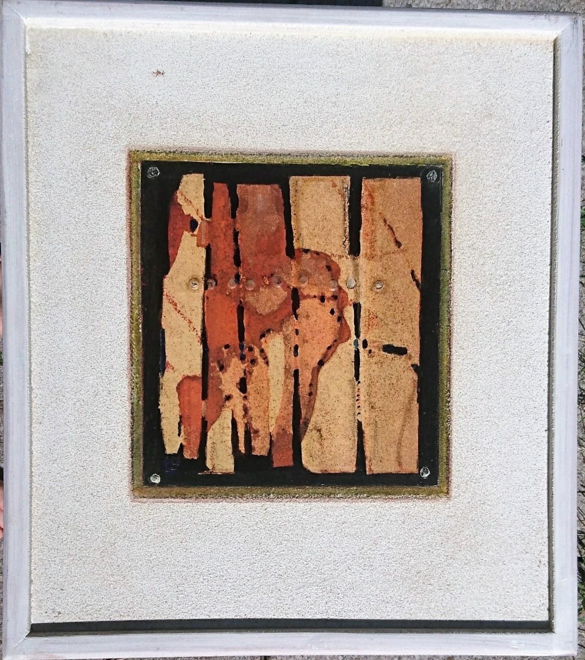Eine seltene Arbeit des Kasseler Malers Ludwig Uloth. Gestaltete Zinkplatte der Größe 24,5 cm mal 22,5 cm fest auf 48,5 cm mal 43 cm großer, mit Sand verputzter Holzplatte, gerahmt. Zustand gut. Rückseitig handsigniert.