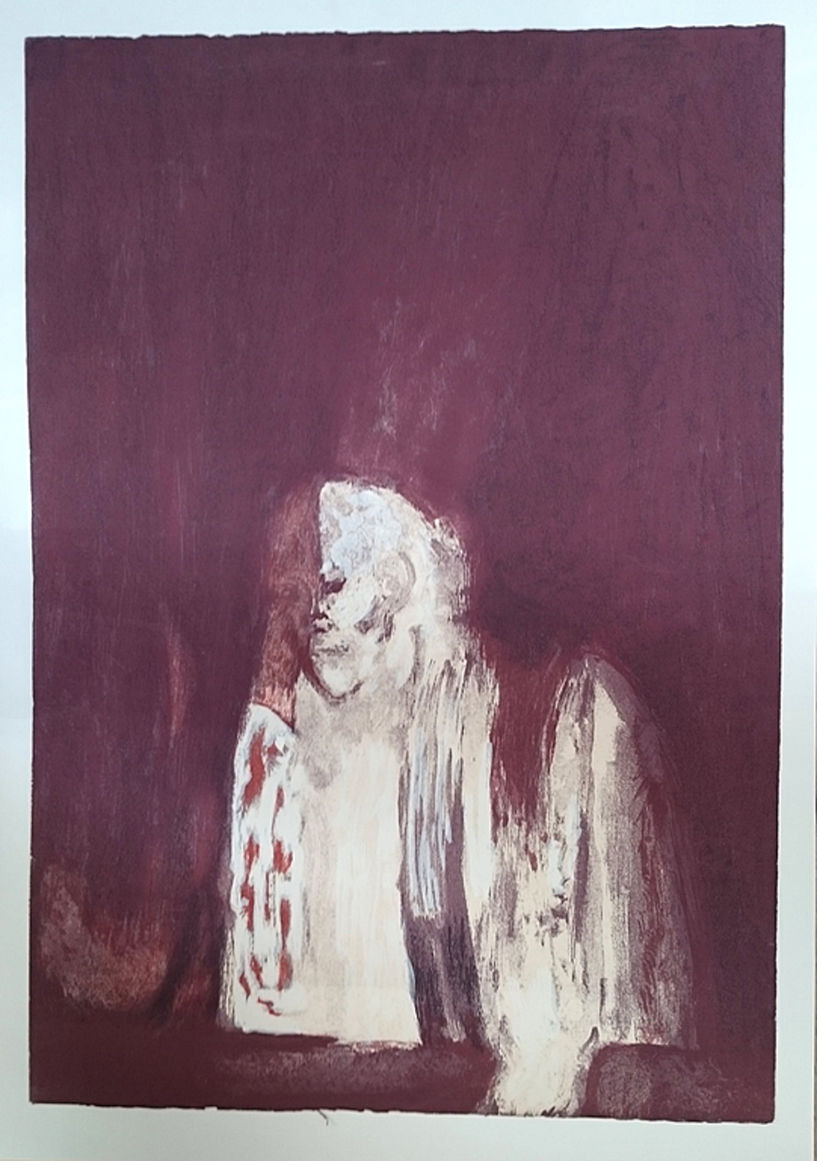 Zeefdruk van Luis Filcer met een voor hem bekend thema: De rechter en de veroordeelden.
