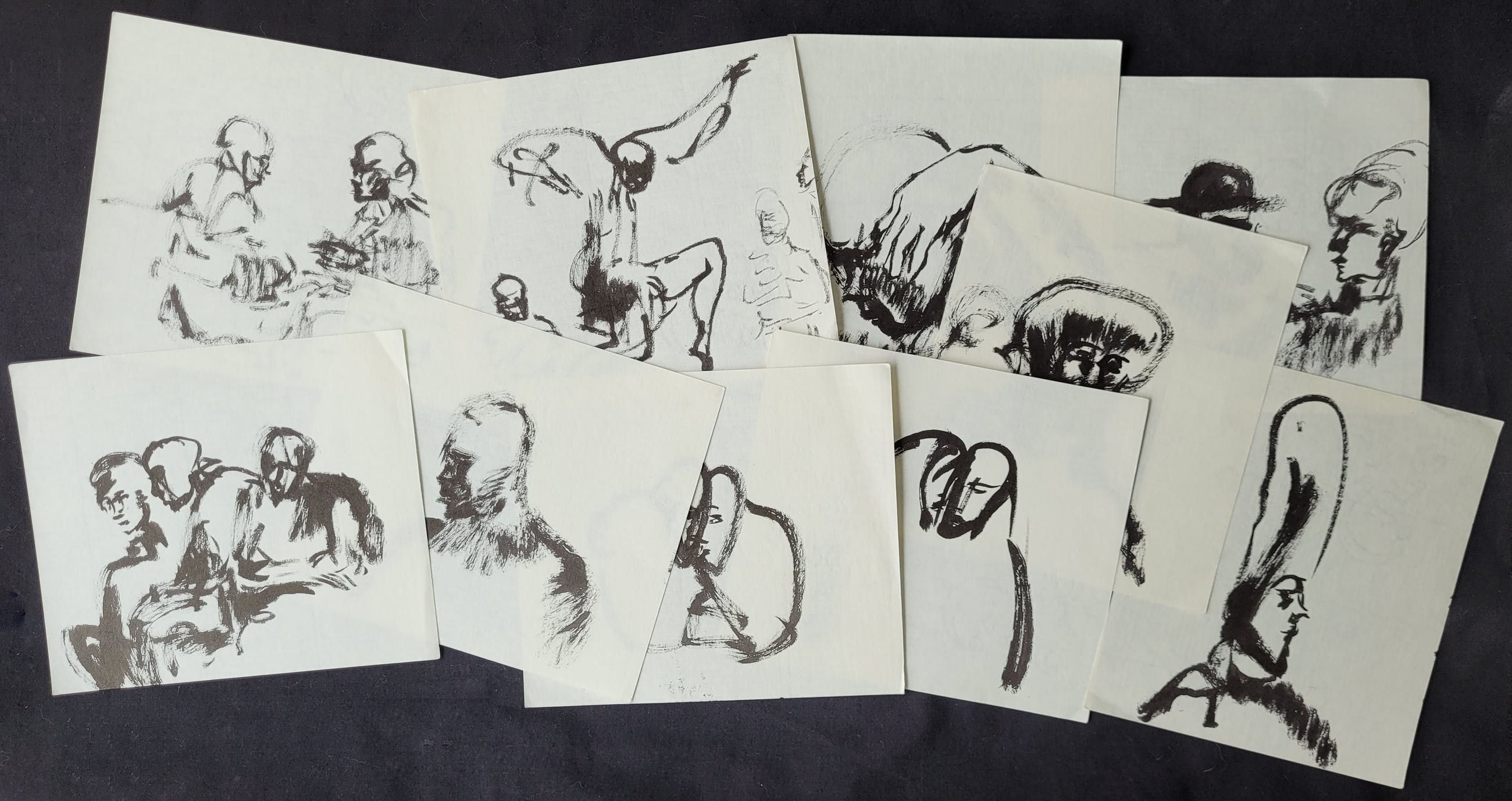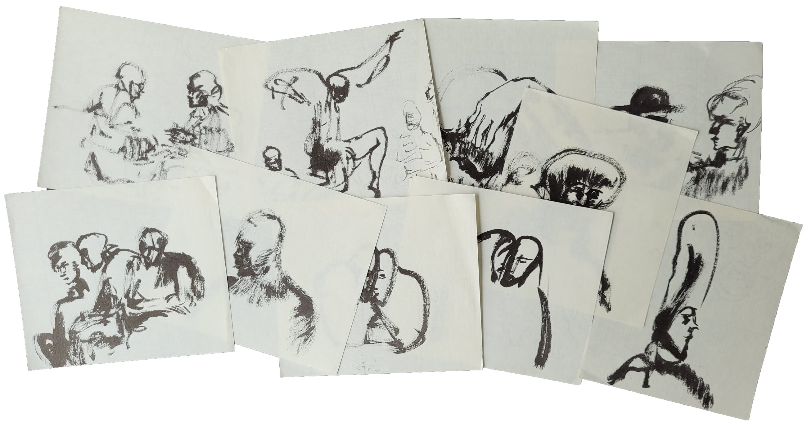 | De tekeningen zijn gemaakt op restjes papier of karton. Hierdoor kunnen de tekeningen kleine beschadigingen hebben aan de randen en hoeken (kleine scheurtjes of ezelsoortjes), of hebben ze schade (door bijvoorbeeld plakband), vlekjes of kreukeltjes. Zie hiervoor de foto. | |||||||||||