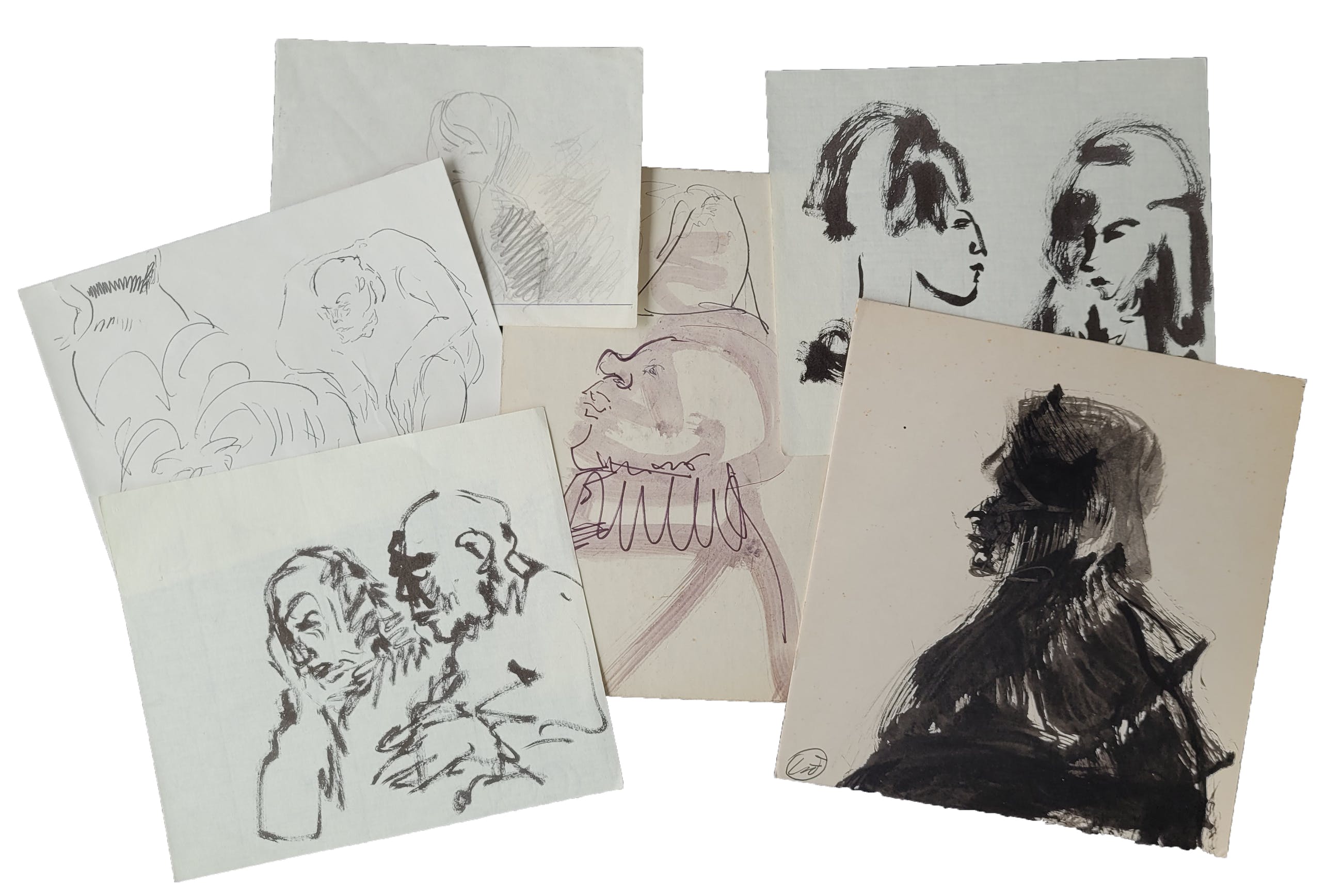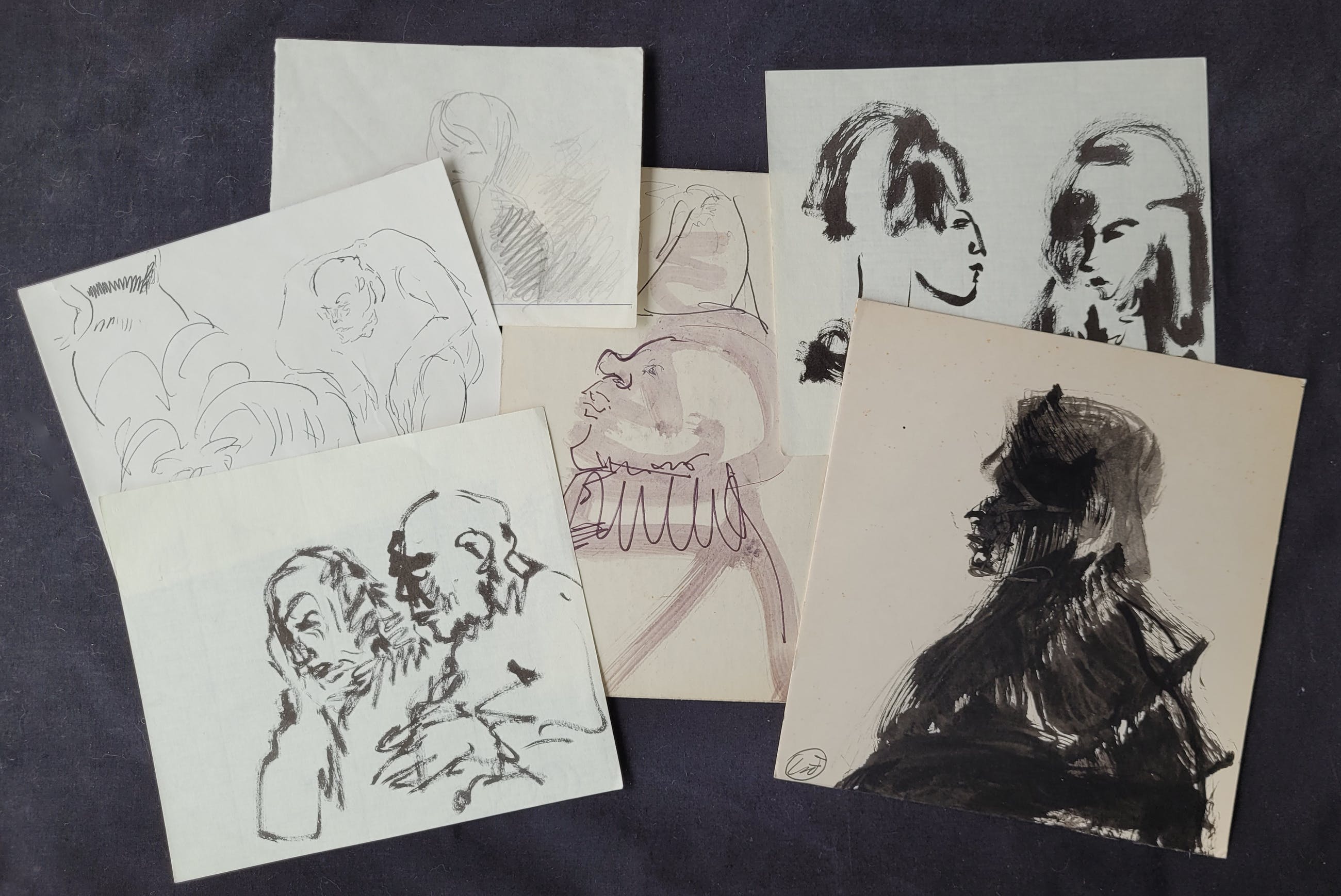 | De tekeningen zijn gemaakt op restjes papier of karton. Hierdoor kunnen de tekeningen kleine beschadigingen hebben aan de randen en hoeken (kleine scheurtjes of ezelsoortjes), of hebben ze schade (door bijvoorbeeld plakband), vlekjes of kreukeltjes. Zie hiervoor de foto. | |||||||||||