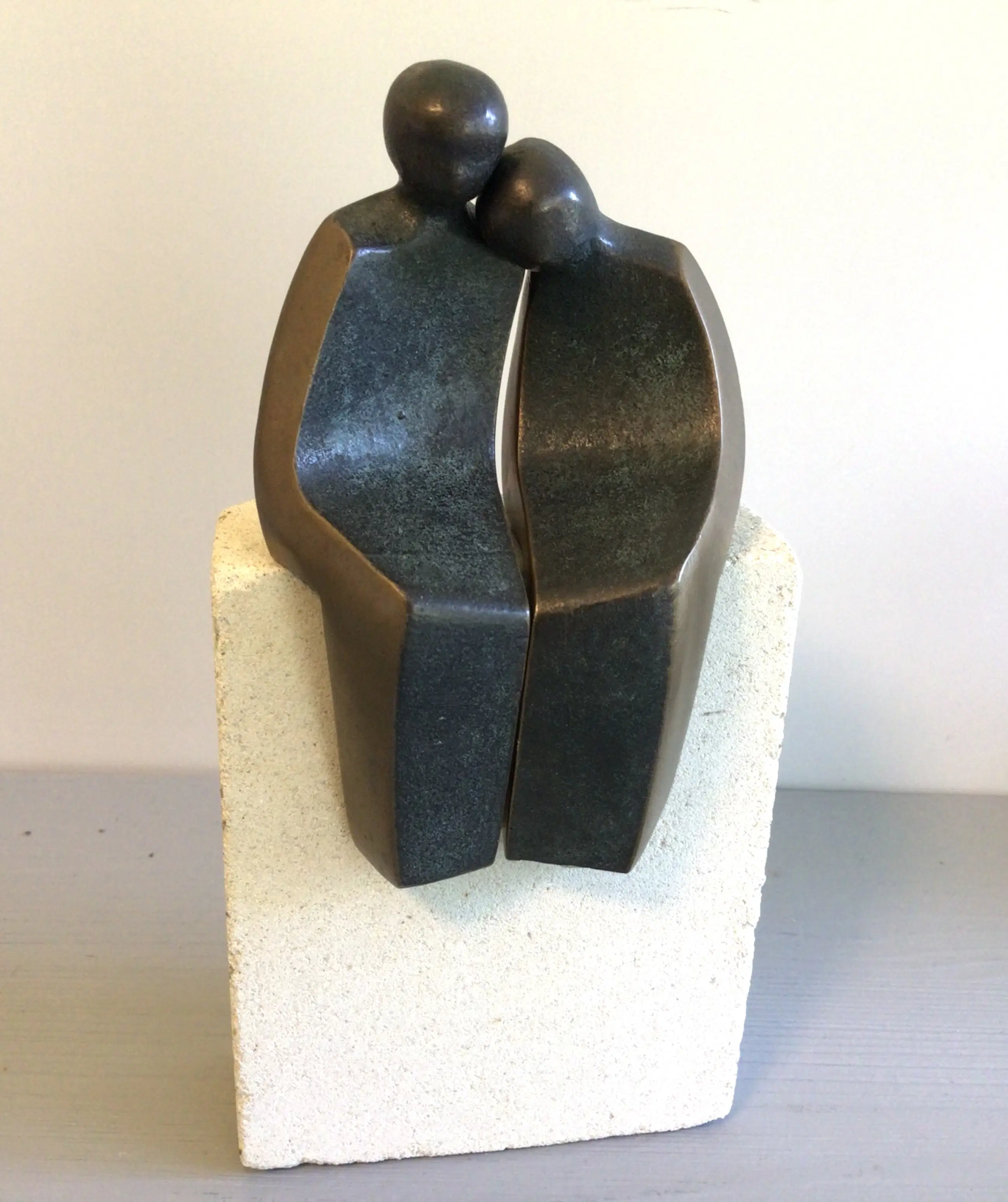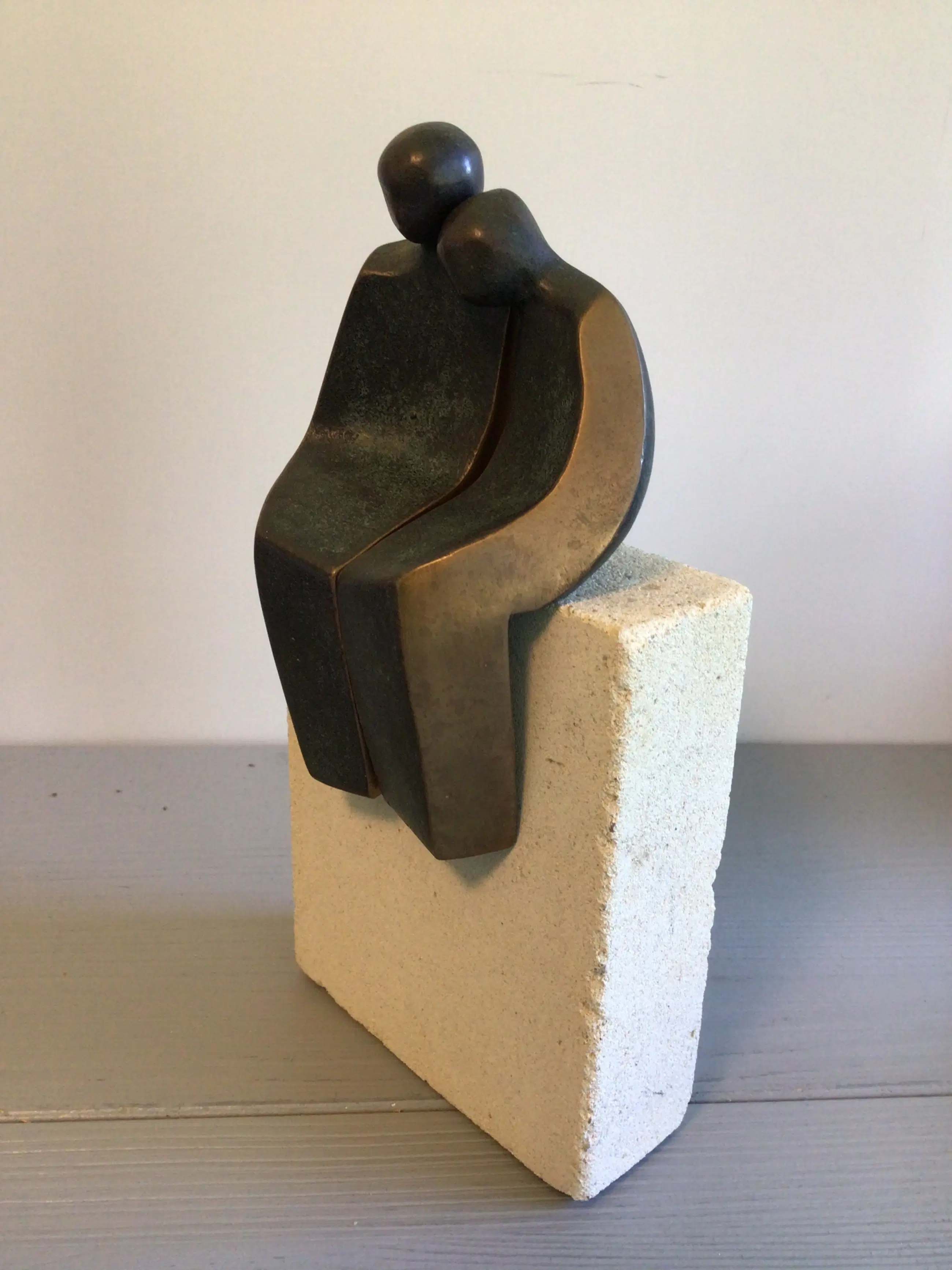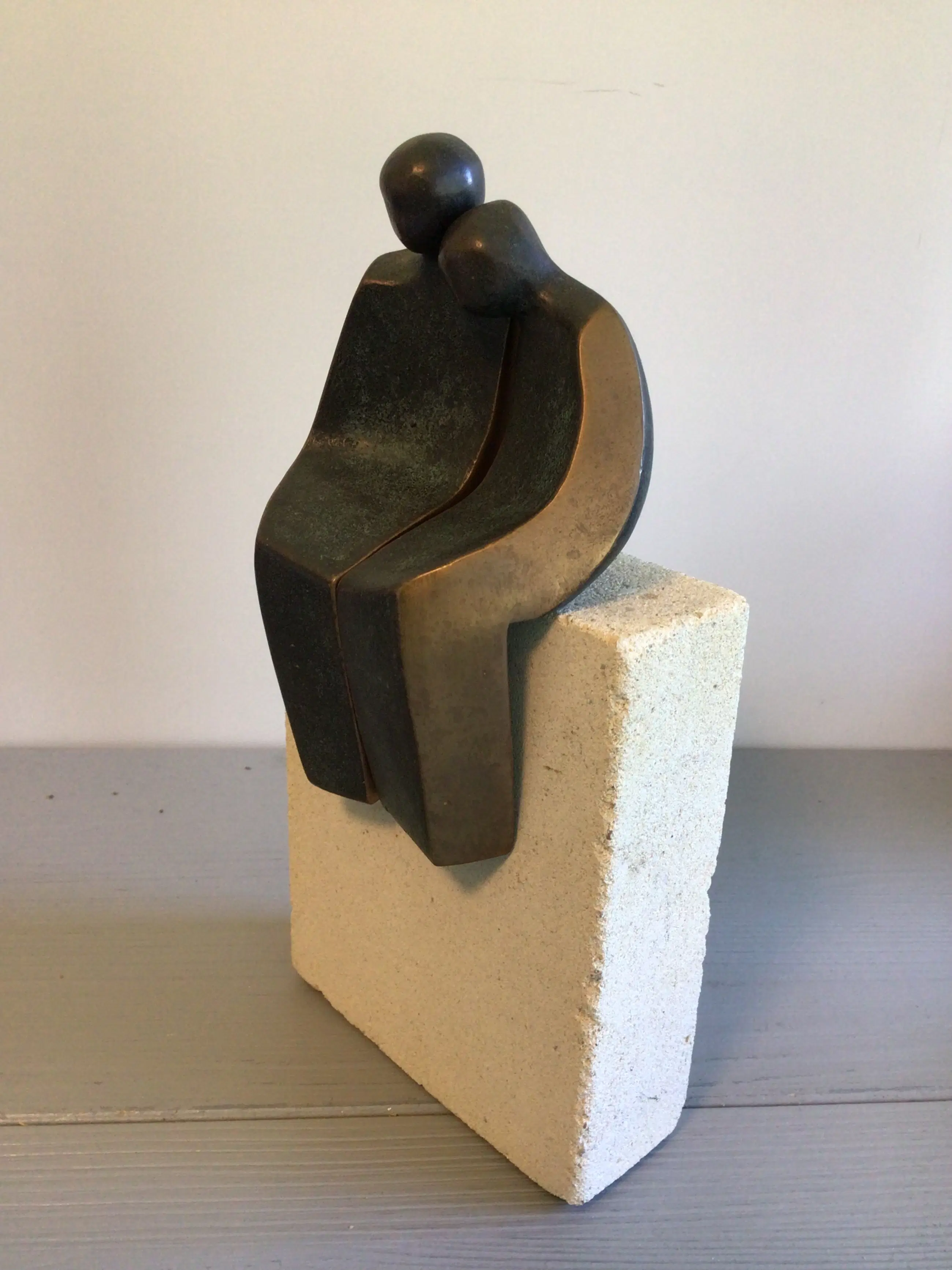 Zeer fraai vormgegeven vertederend sculptuur van twee geliefden , samen zittend op een bankje. Titel “ Geborgenheid “ Dit schitterende sculptuur is afgewerkt met fraaie goudkleurige belijningen, zoals we die kennen van haar prachtige werk. Onderop het sculptuur is een nummer te lezen, in beperkte oplage gemaakt Materiaal: brons en steen Kunstenares: Luise Kott - Gartner NB er mist een klein chipje achter uit de steen, totaal niet storend Het beeld verkeert in goede staat en wordt zorgvuldig verpakt verzonden