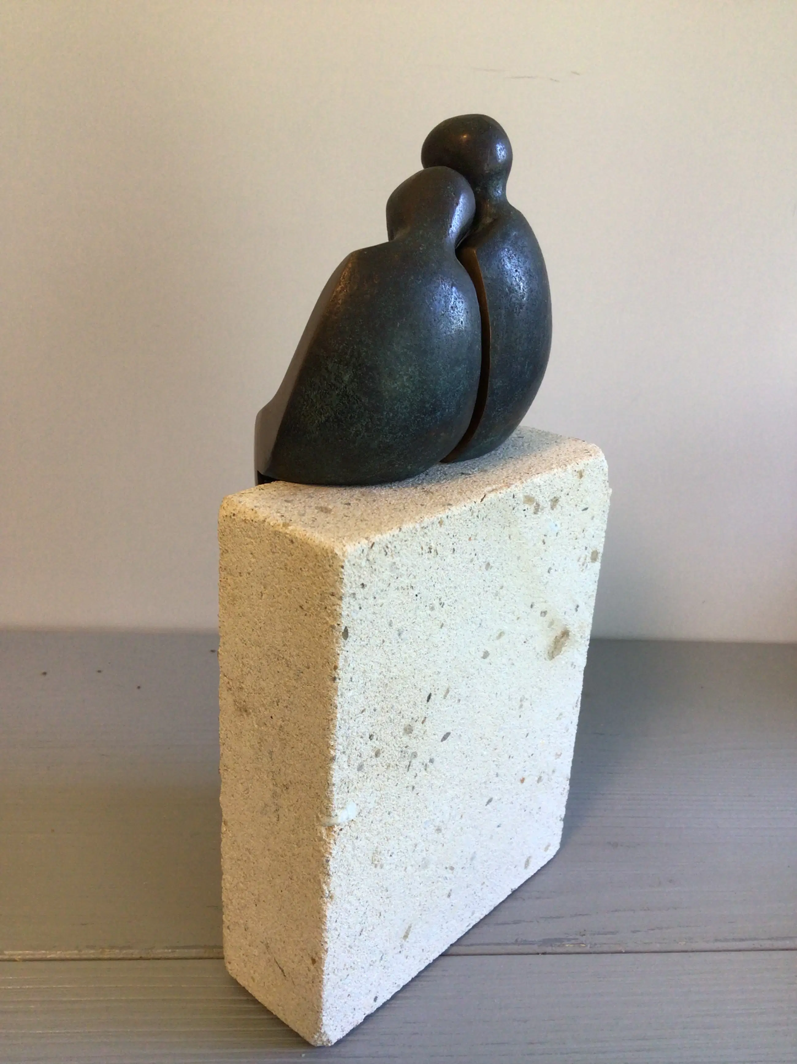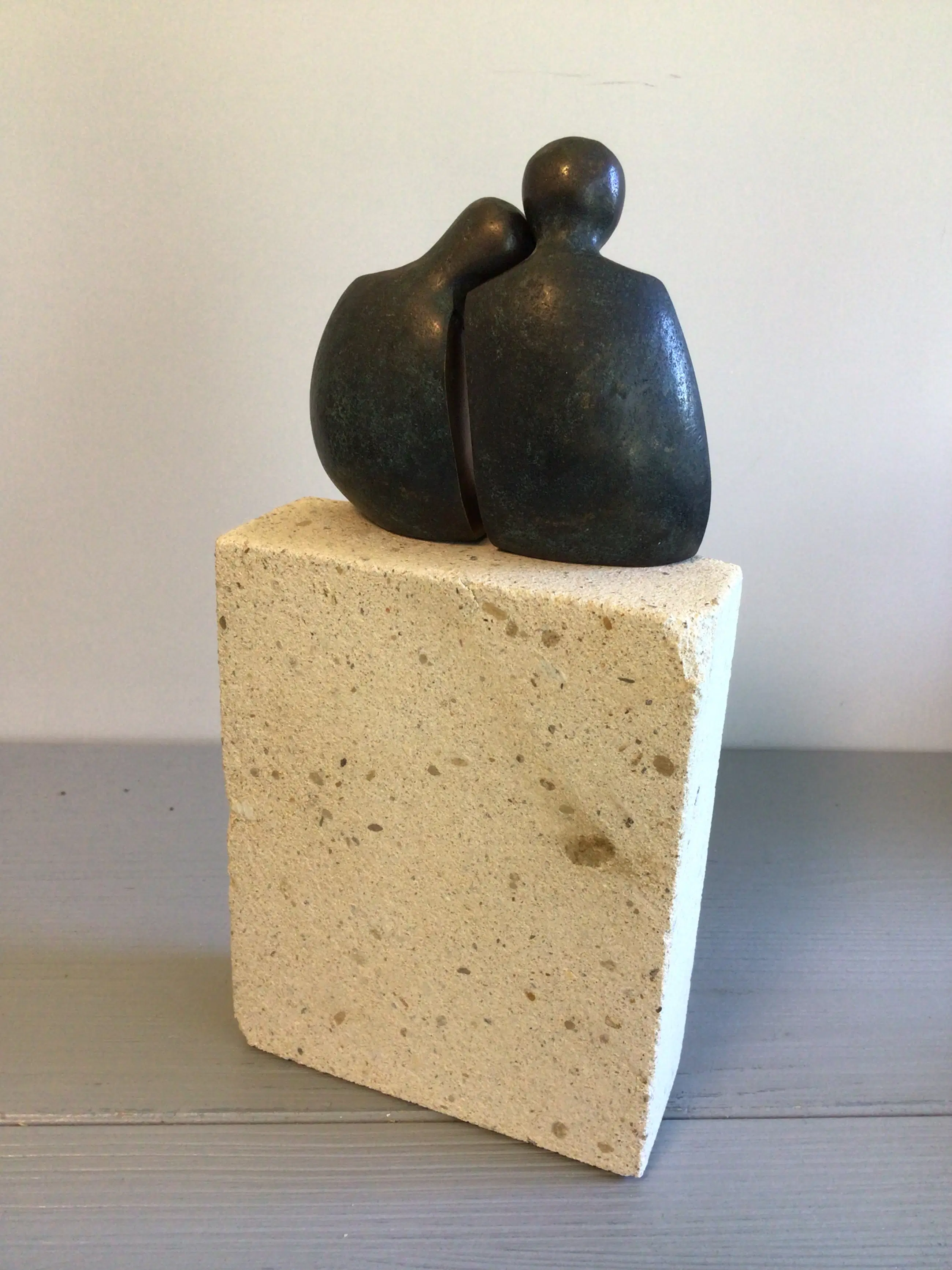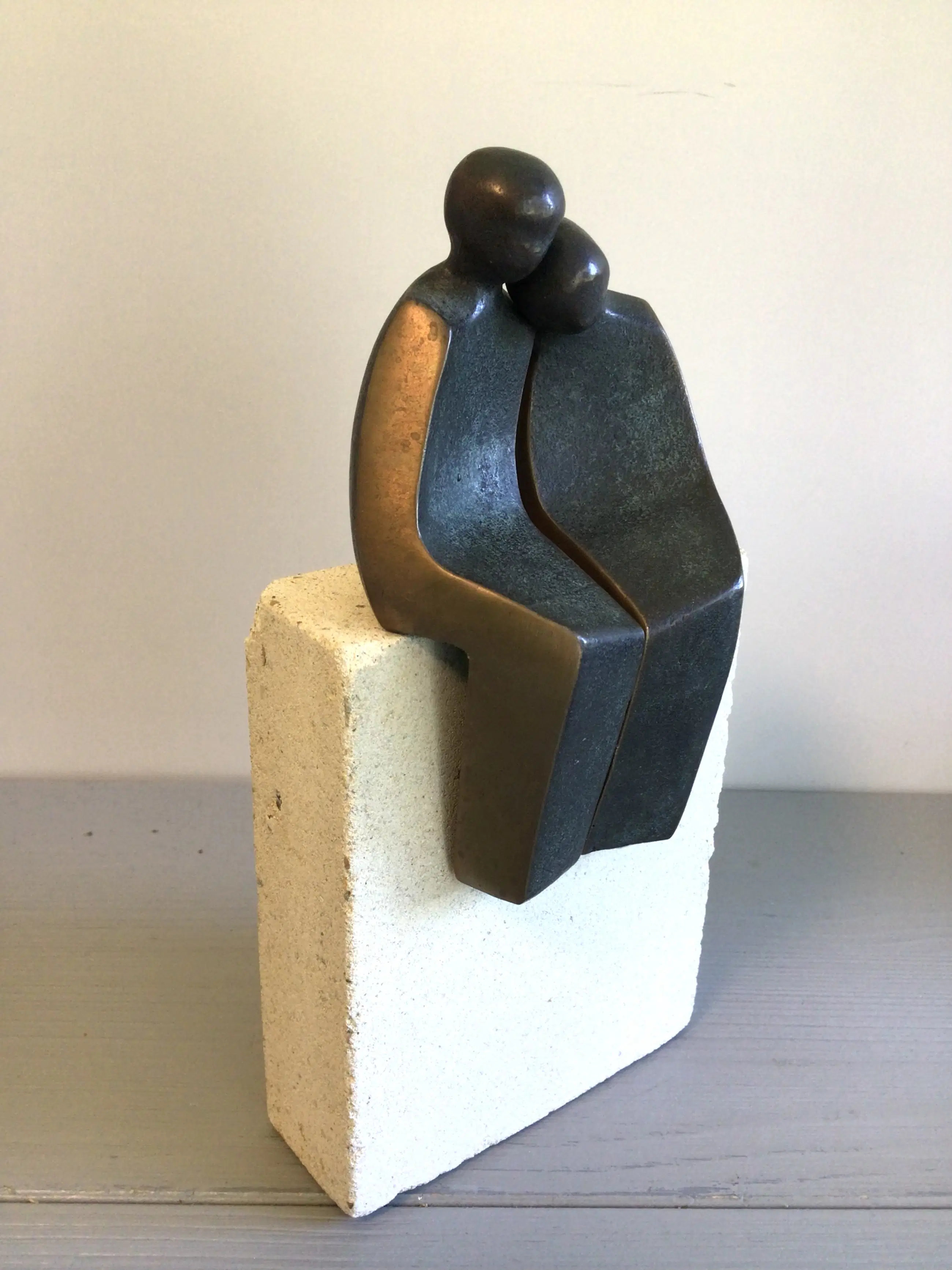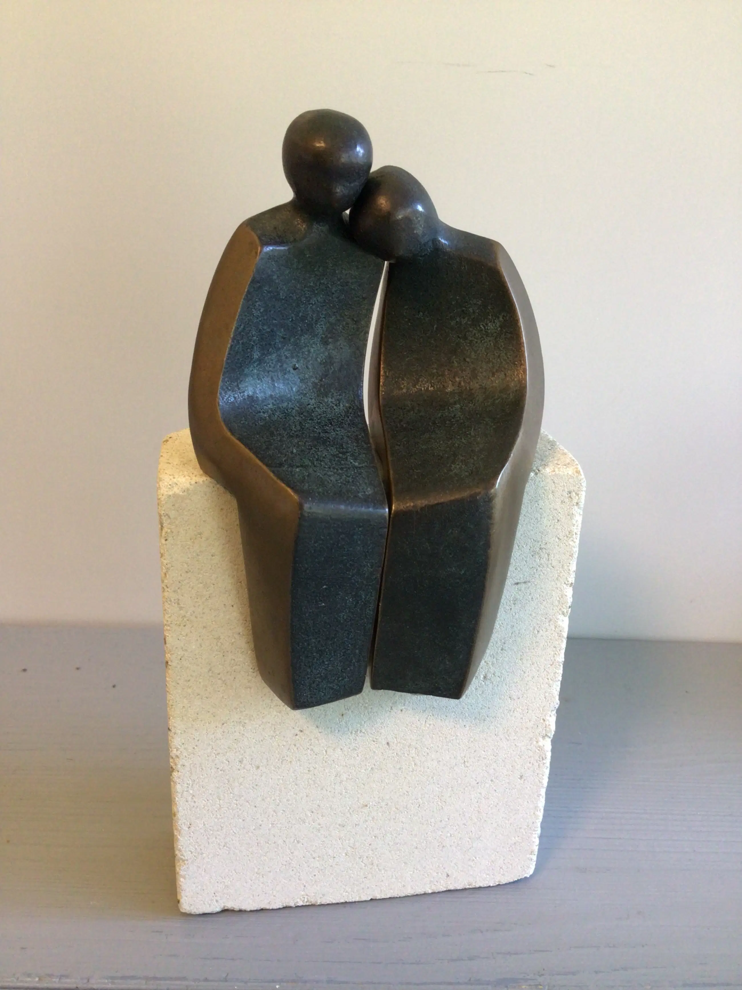 Zeer fraai vormgegeven vertederend sculptuur van twee geliefden , samen zittend op een bankje. Titel “ Geborgenheid “ Dit schitterende sculptuur is afgewerkt met fraaie goudkleurige belijningen, zoals we die kennen van haar prachtige werk. Onderop het sculptuur is een nummer te lezen, in beperkte oplage gemaakt Materiaal: brons en steen Kunstenares: Luise Kott - Gartner NB er mist een klein chipje achter uit de steen, totaal niet storend Het beeld verkeert in goede staat en wordt zorgvuldig verpakt verzonden