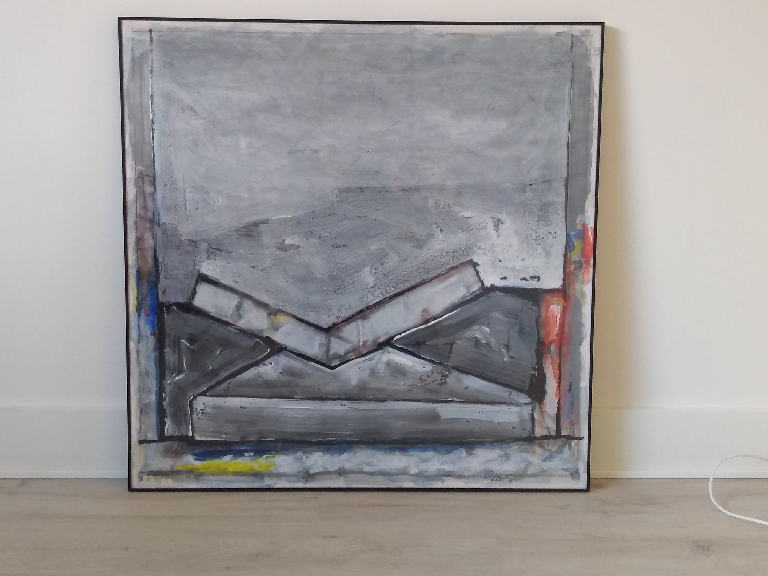 Kunstwerk op doek. De grijze periode Primaire kleuren blauw en rood.