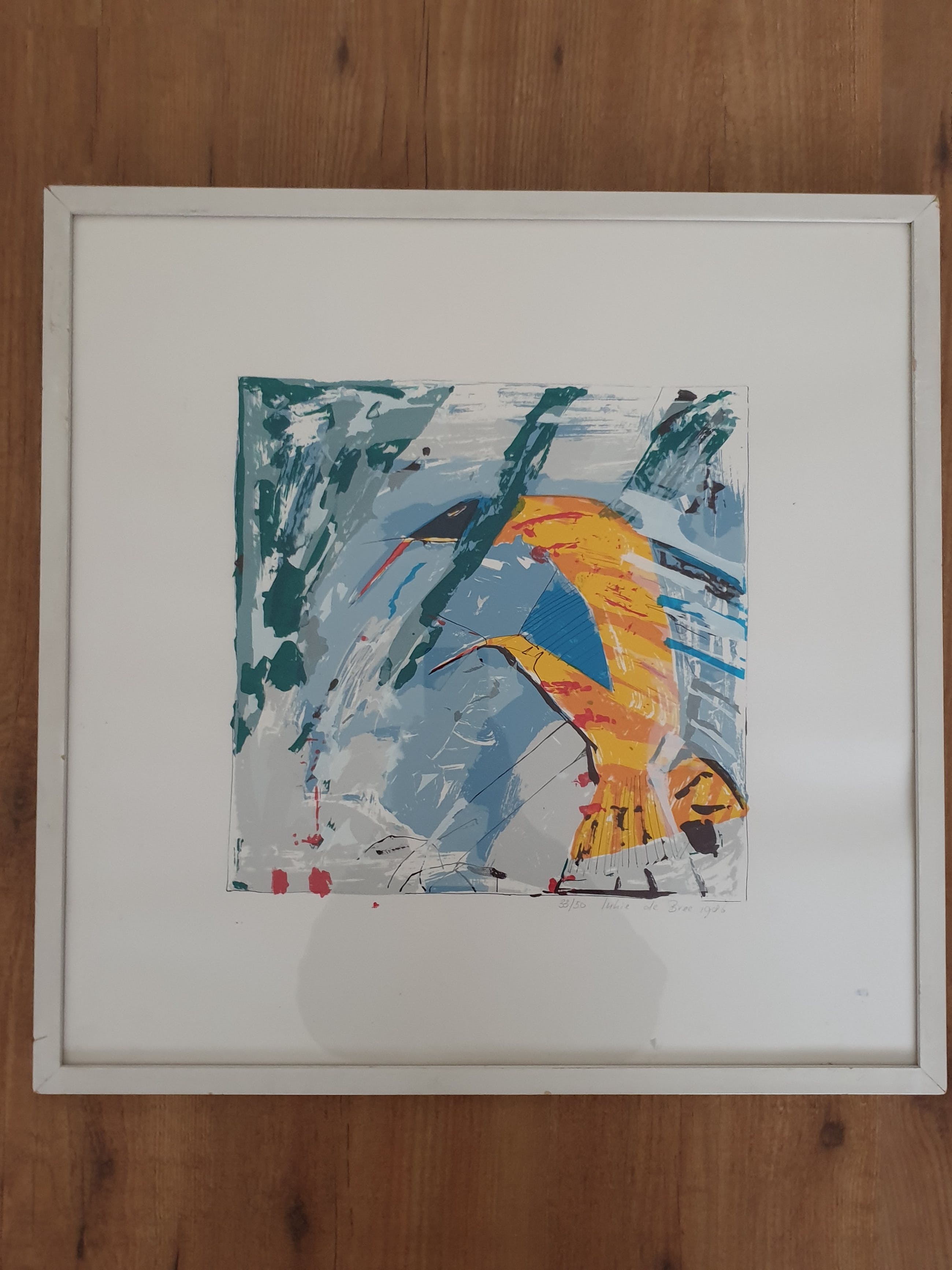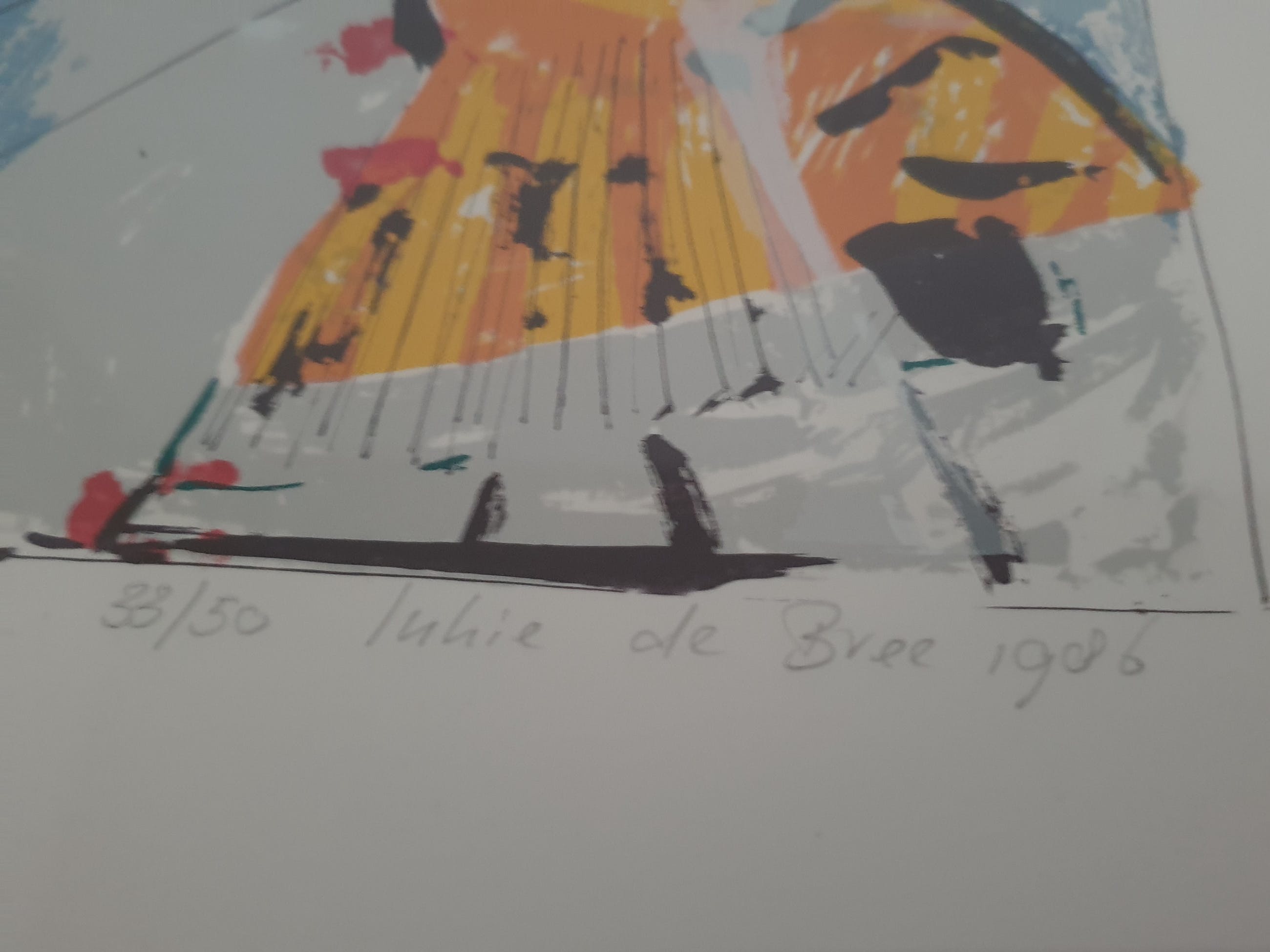 De mooie kleurrijke zeefdruk van Lukie de Bree is met potlood gesigneerd, gedateerd en genummerd. Het werk zit in een witte houten lijst.