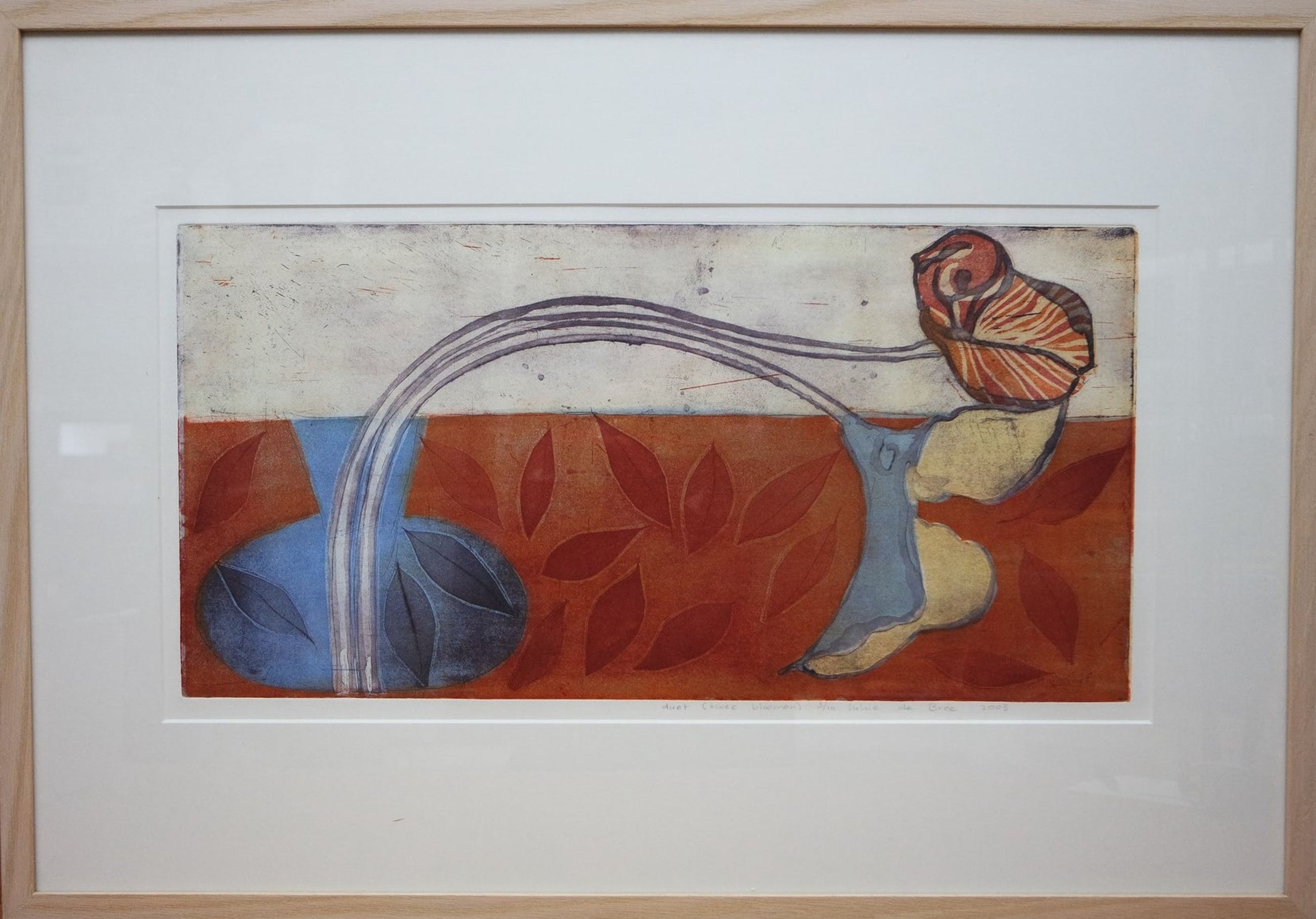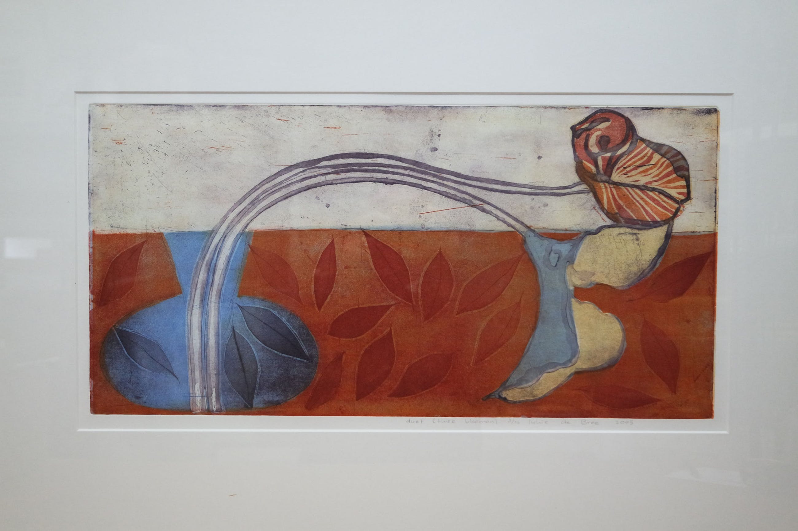 Een prachtig grafisch kunstwerk te koop ( "duet", kleuren-ets, 3/10 ) van de Nederlandse kunstenares Lukie de Bree (1953). In een moderne houten lijst van Barth met passe-partout. Gesigneerd rechts onder en gedateerd 2003. De afmetingen met lijst: 58 cm. x 83 cm. De beeldmaat is: 30 cm. x 60 cm. De conditie van het kunstwerk is heel goed. Het werk is te bezichtigen bij Kunsthandel Martins te Wolvega en wordt geleverd met een echtheidscertificaat