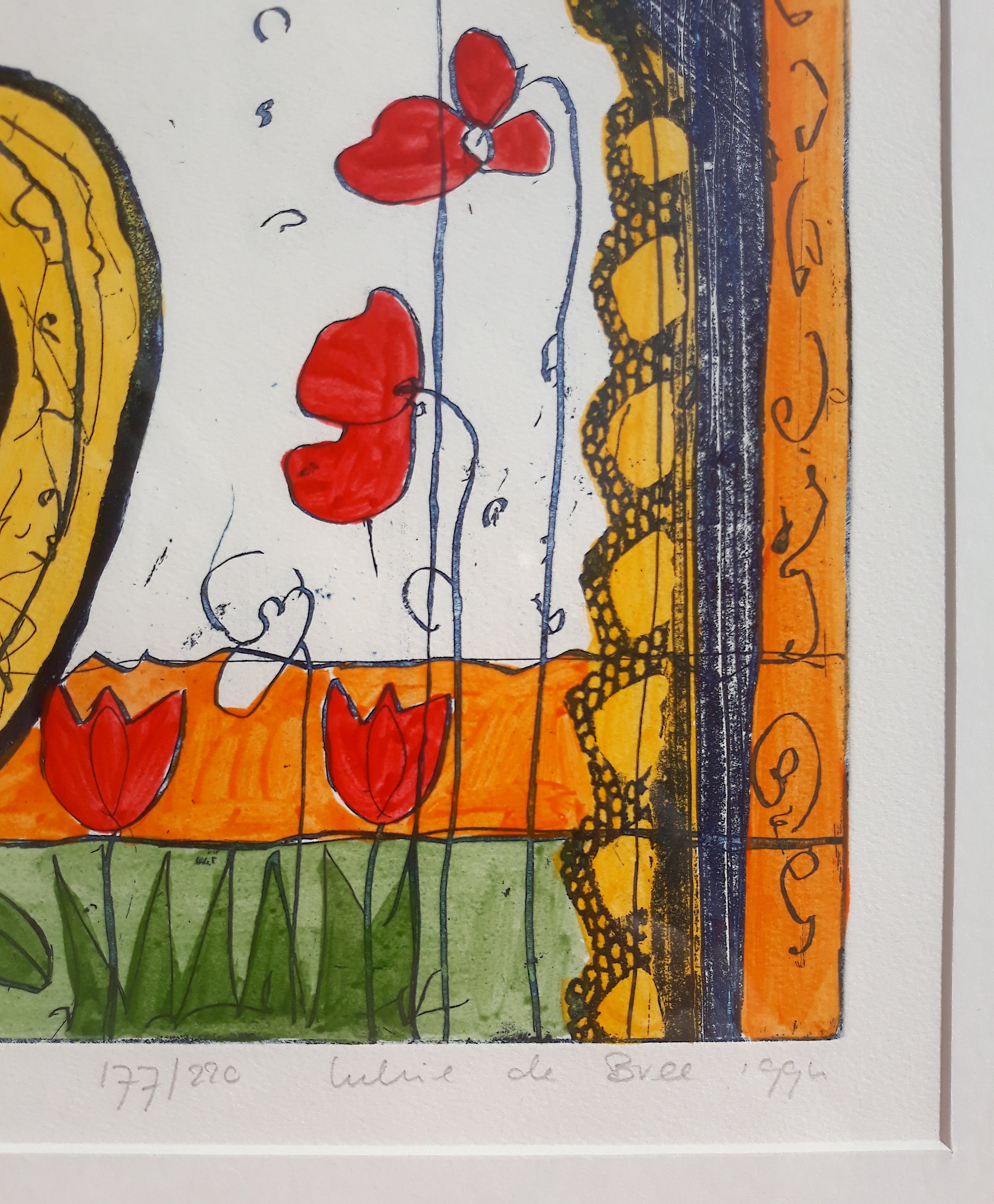 Mooi, herkenbaar werk van Lukie de Bree. Met de hand ingekleurde ets op papier, met potlood gesigneerd, gedateerd (1994) en genummerd (177/220). In nette aluminium lijst, achter glas en met smetteloos, zuurvrij passe-partout. Alles in uitstekende conditie.