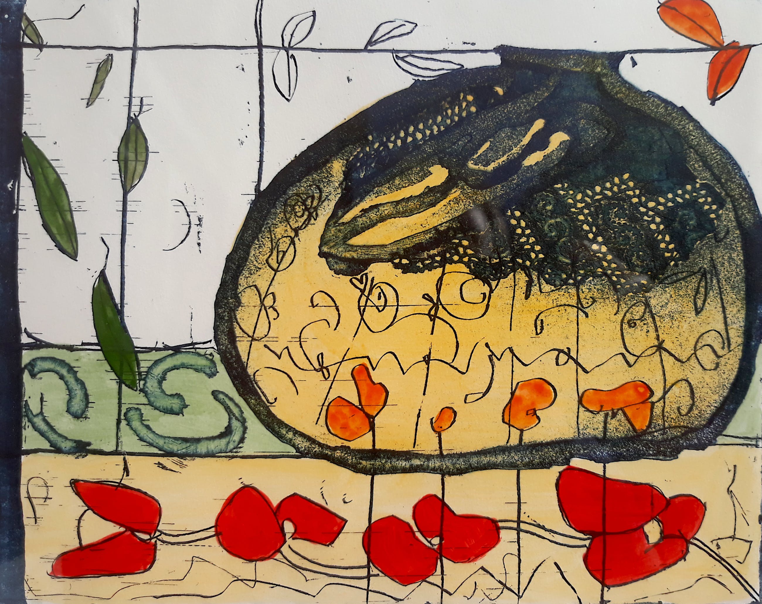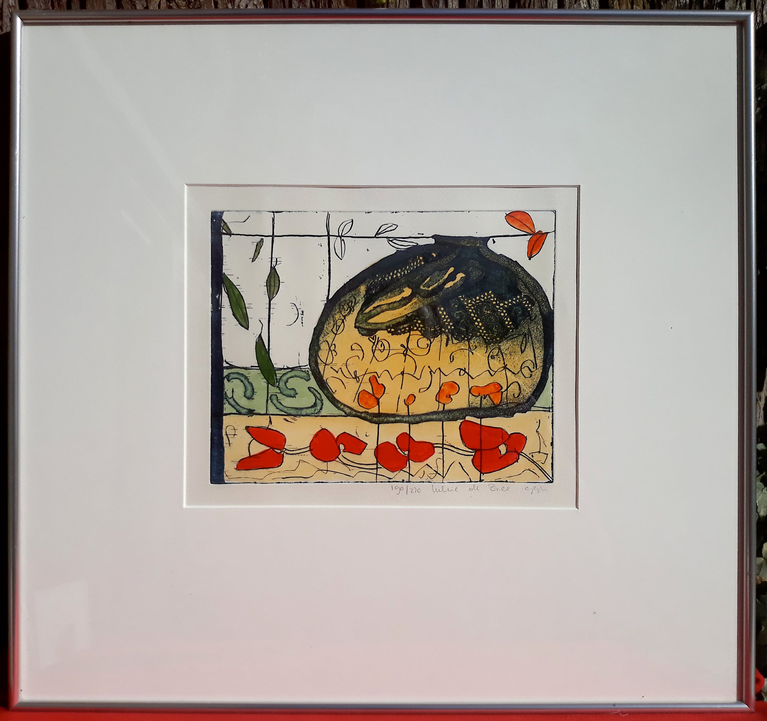Mooi, herkenbaar werk van Lukie de Bree. Met de hand ingekleurde ets op papier, met potlood gesigneerd, gedateerd (1994) en genummerd (190/220). In nette aluminium lijst, achter glas en met smetteloos, zuurvrij passe-partout. Alles in uitstekende conditie.