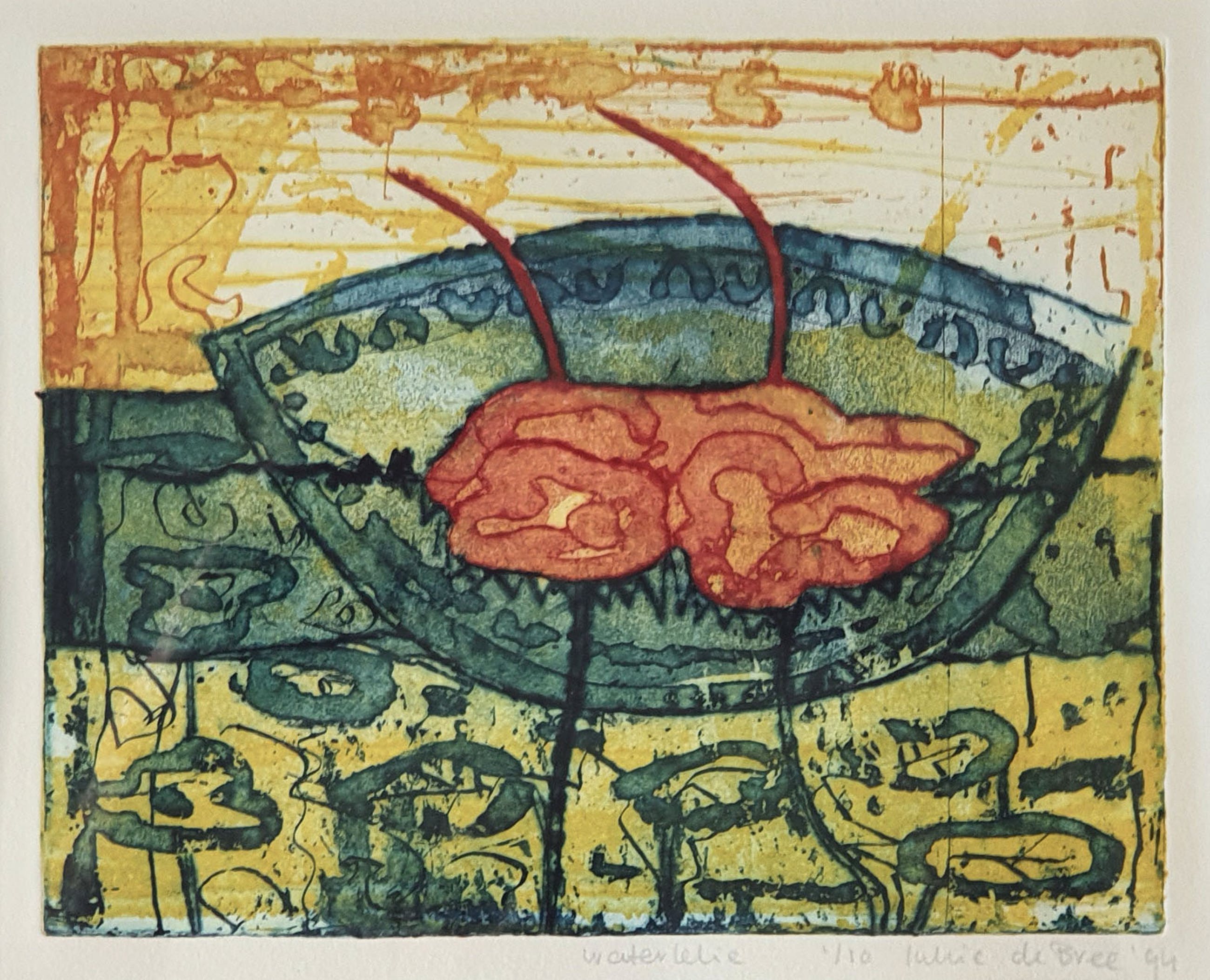Kleurenets van Lukie de Bree (1953), r.o. gesigneerd en gedateerd 1994 in potlood en genummerd 1/10. Titel: "Waterlelie"