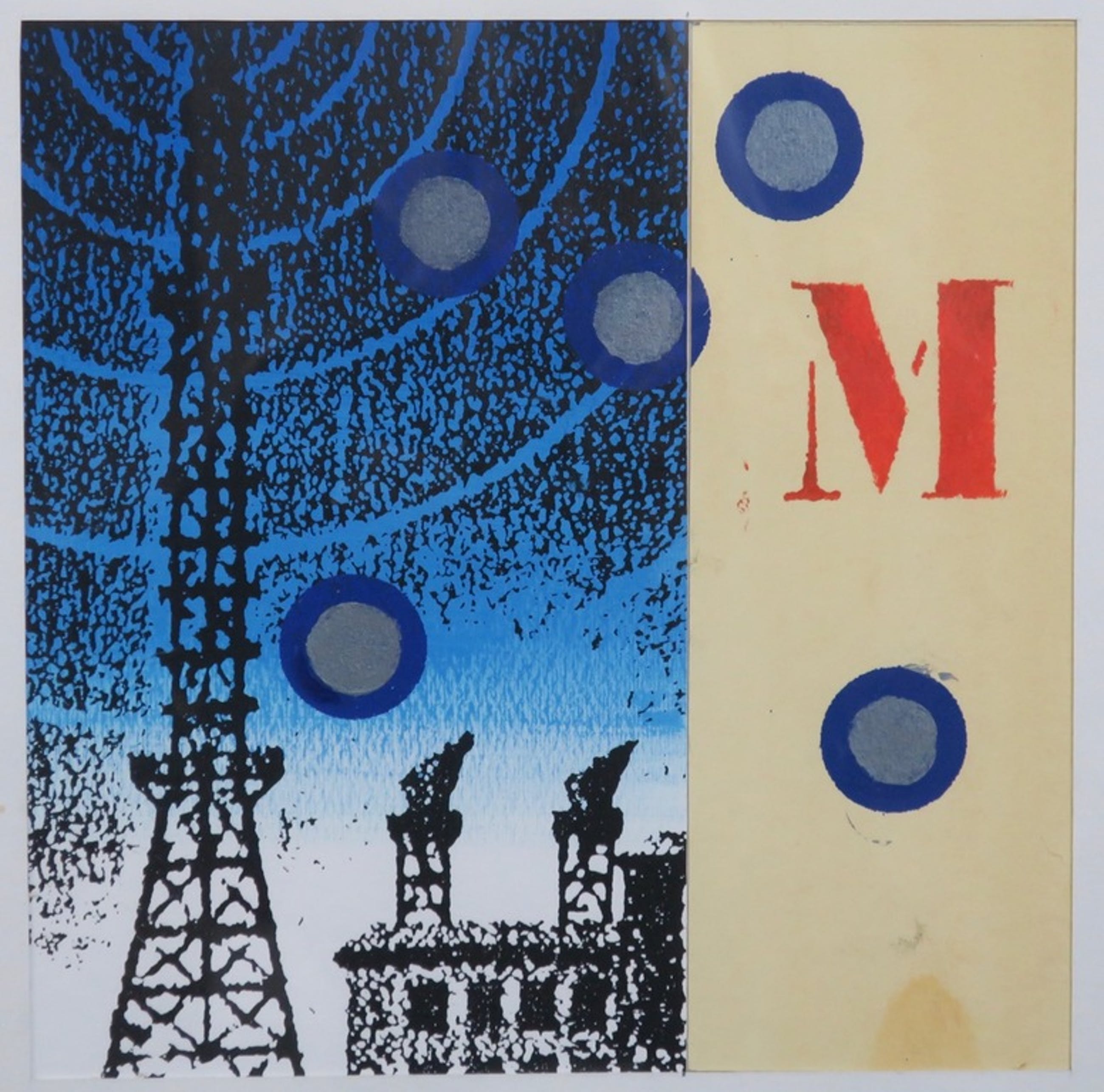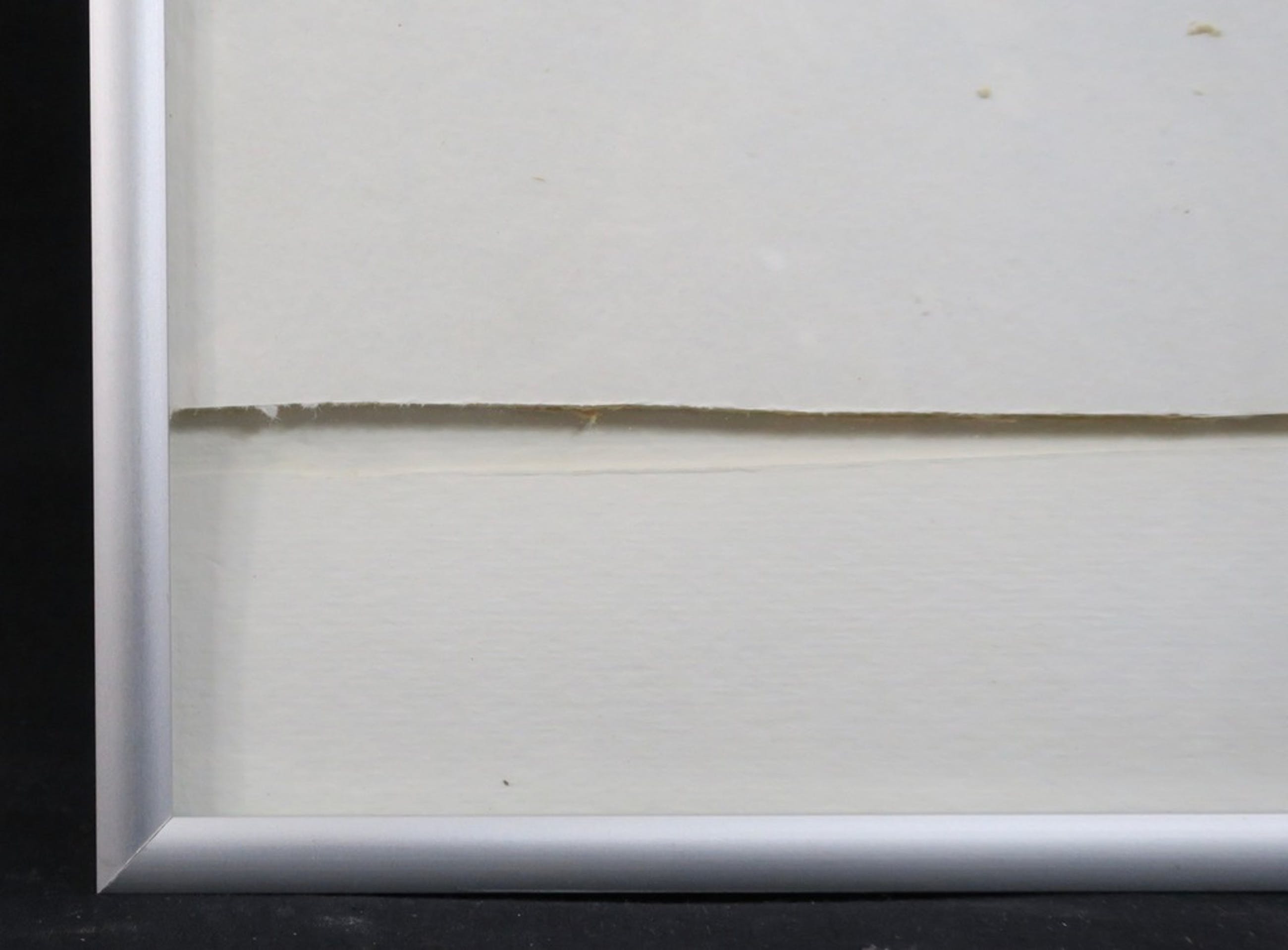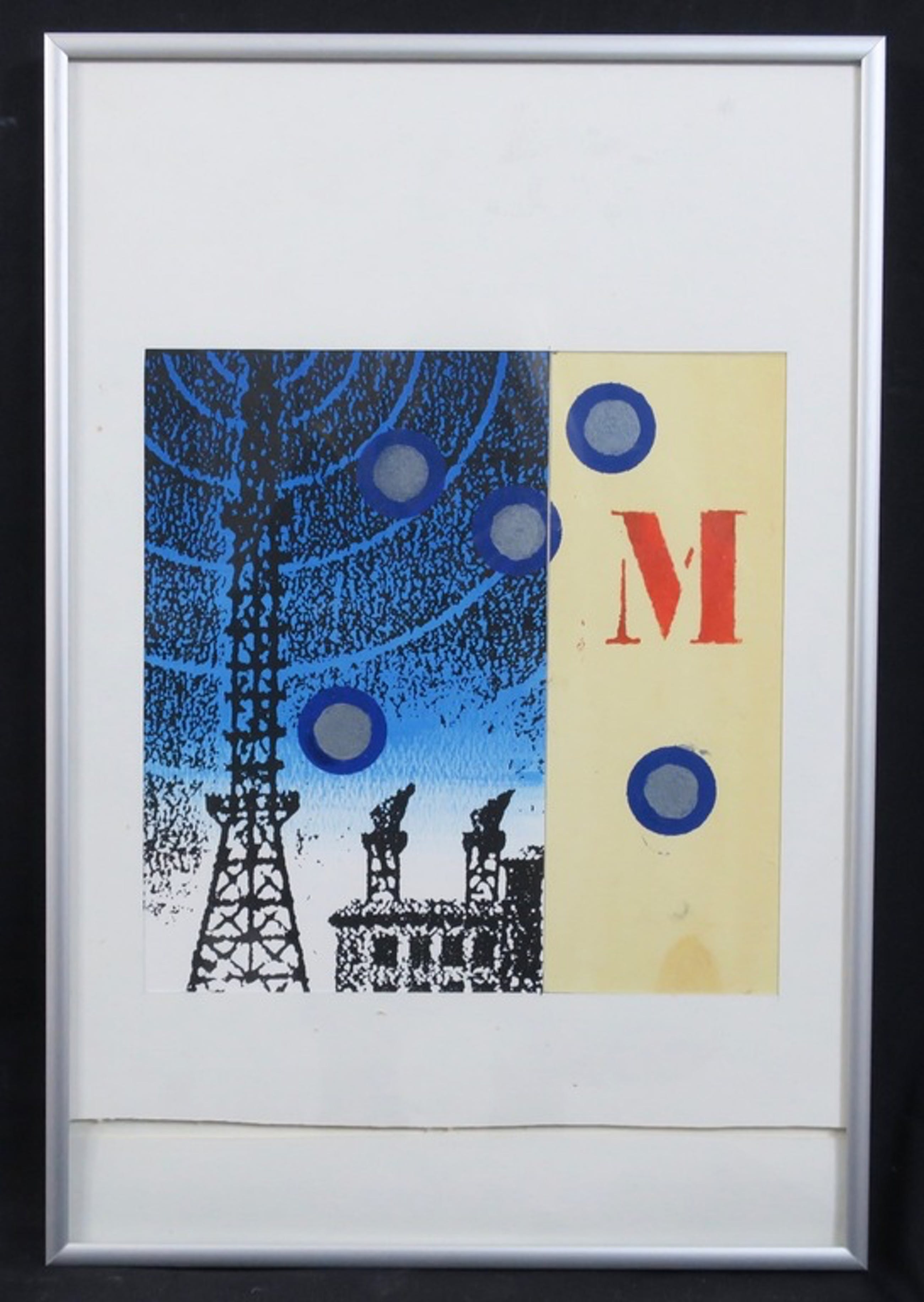 Conditie: let op: ontwerp voor zeefdruk, passepartout is niet netjes gesneden en past niet in de lijst. In het werk enkele vlekken/oneffenheden.