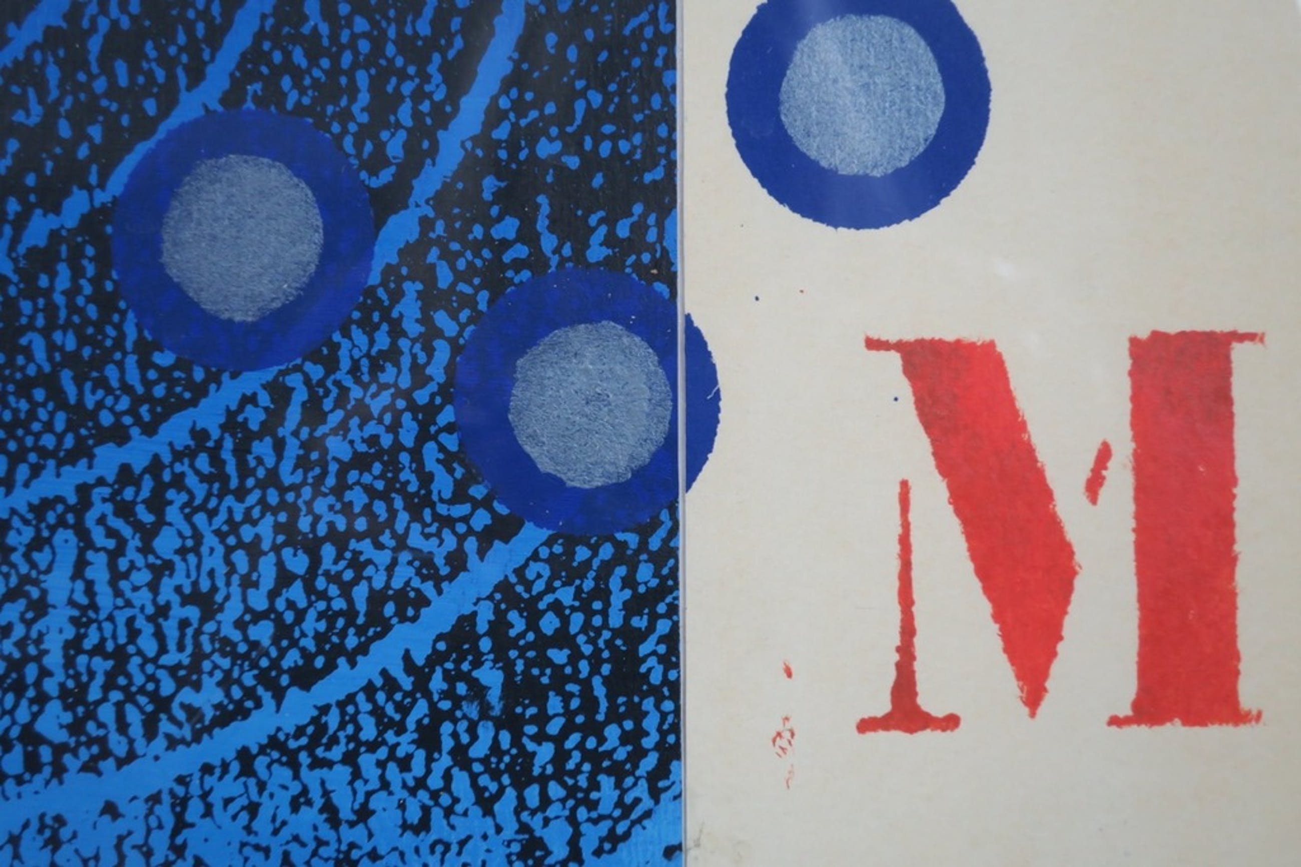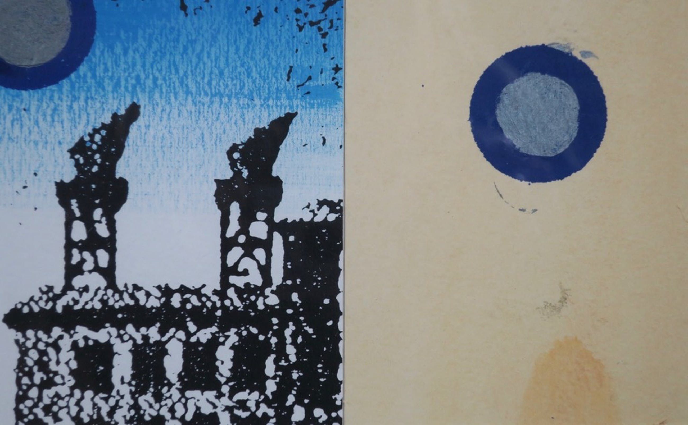 Materiaal: Sjabloondruk, collage en acryl op papier