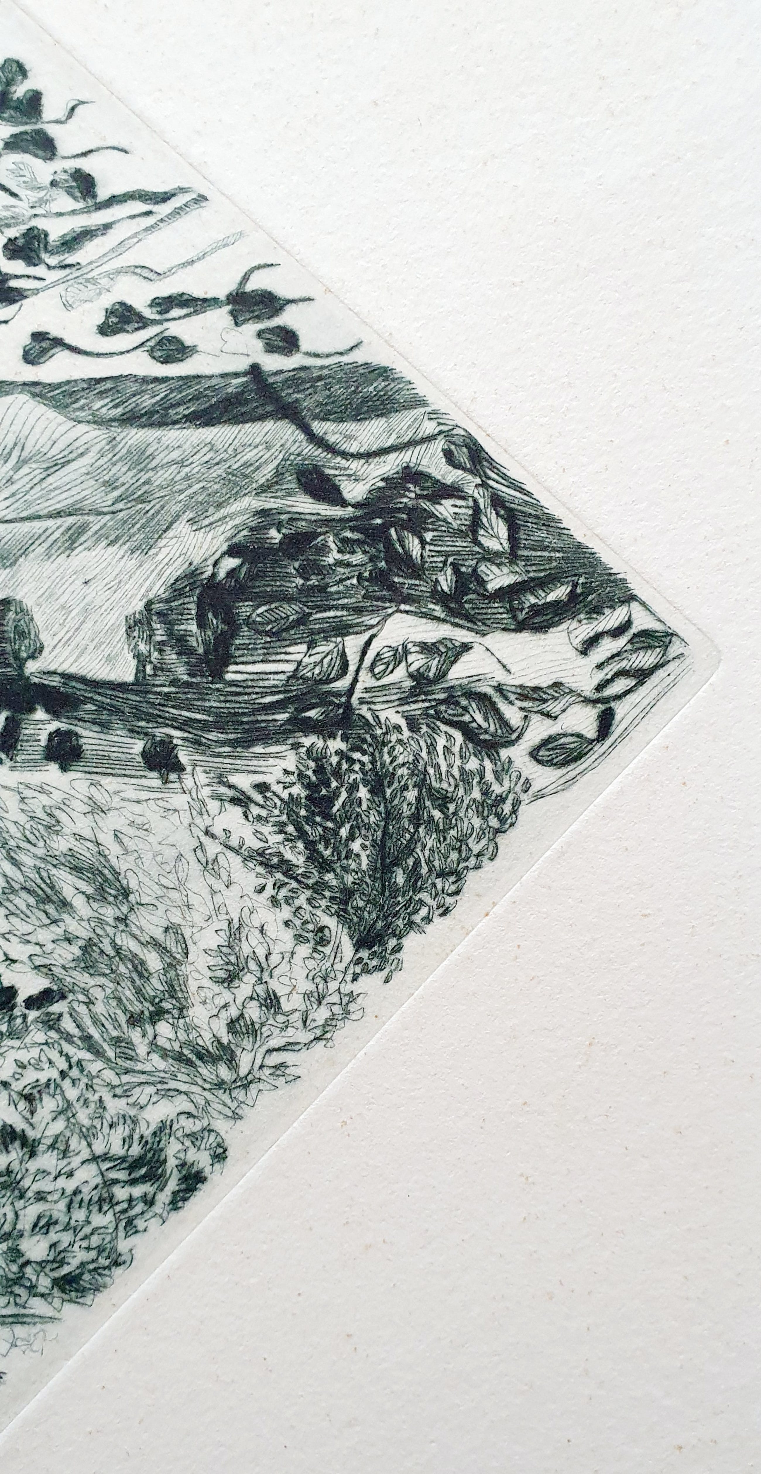 Het papier waarop de ets is afgedukt is schoon en zonder kreuk.