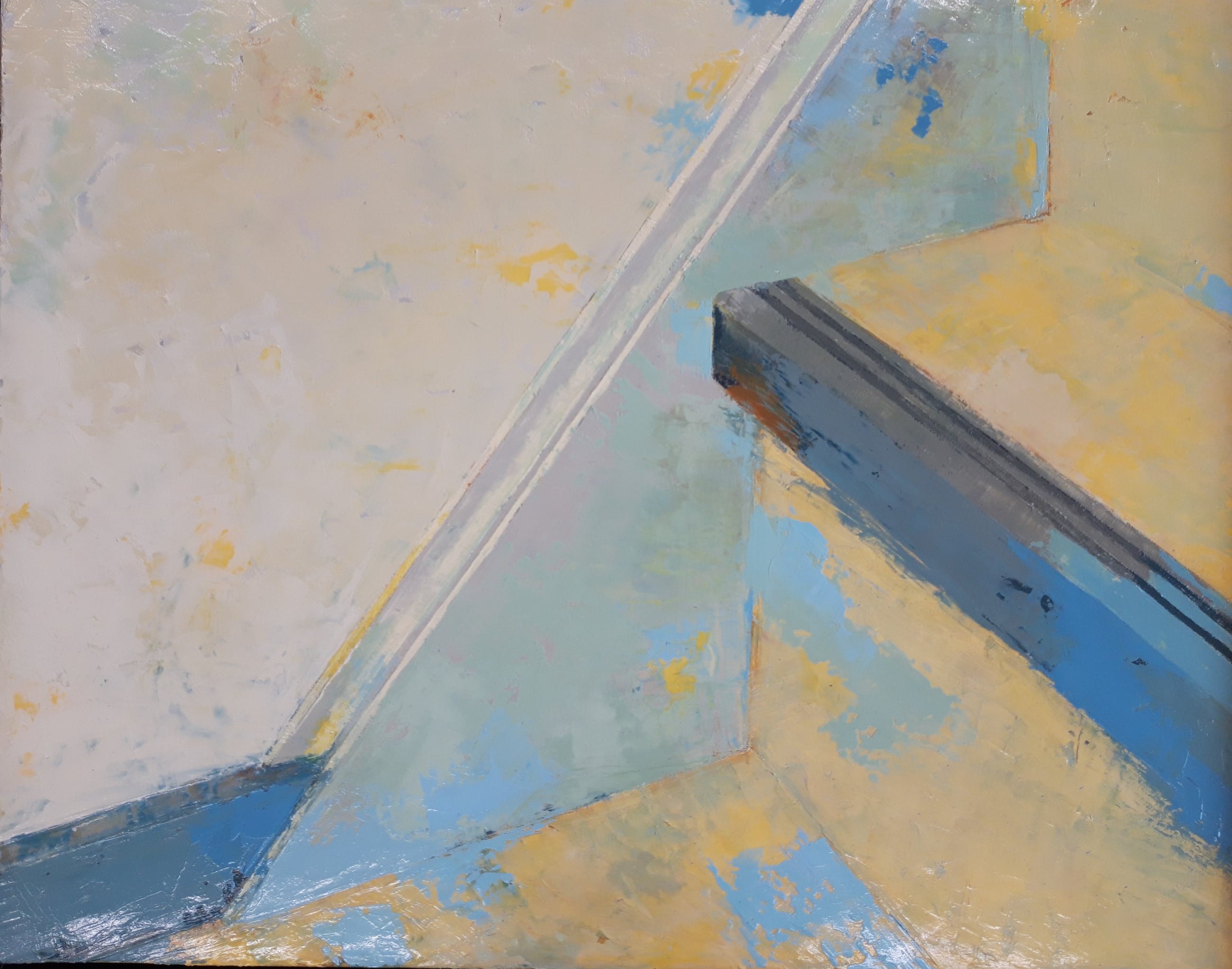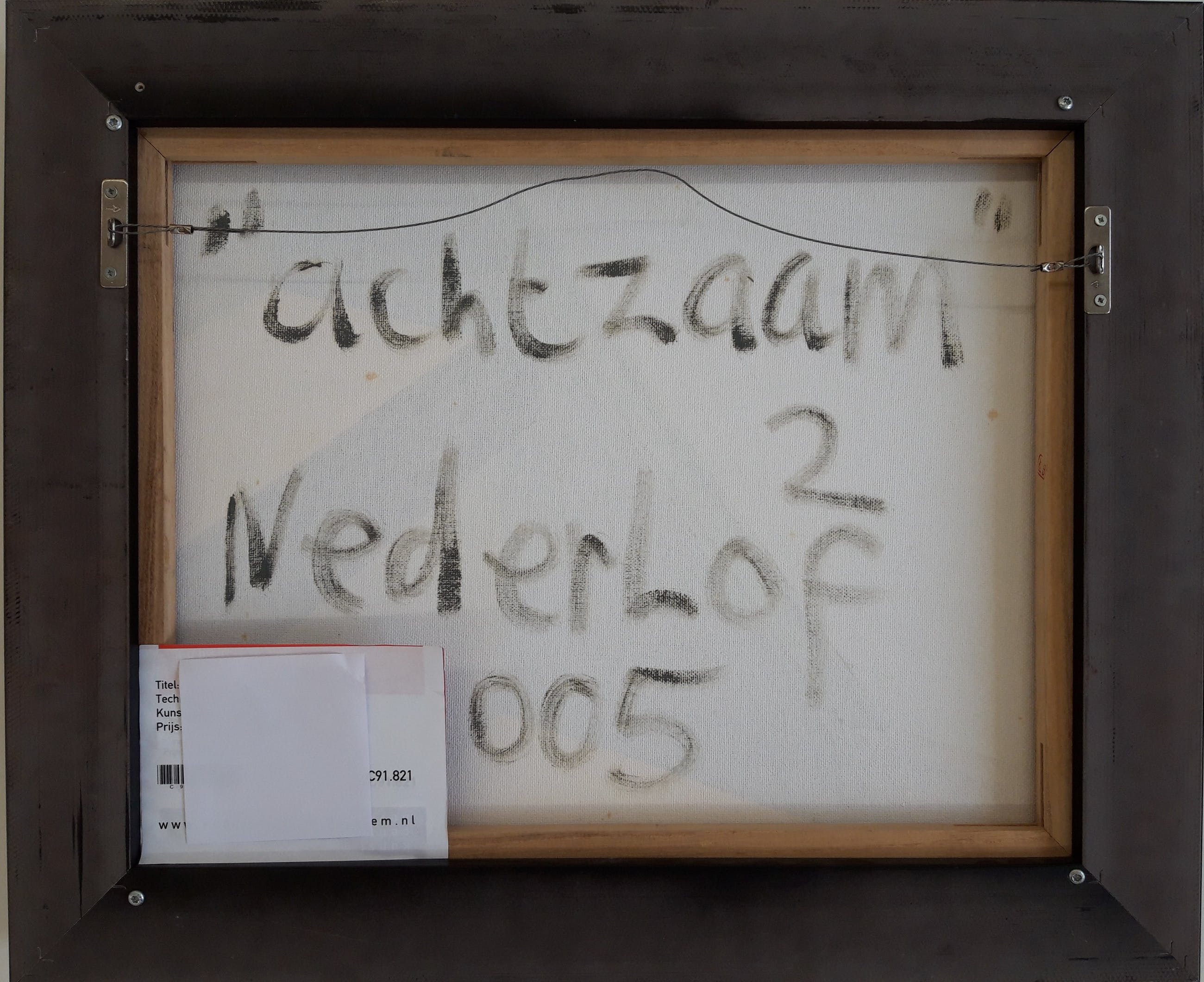 Lydia Nederlof (Den Haag 1958) schildert met olieverf op doek of papier. Zij gebruikt bij voorkeur paletmessen waardoor een krachtige beeldtaal ontstaat. Haar aanvankelijke opleiding tot beeldhouwer verraadt zich in de pasteuze manier van schilderen. Lydia zet haar schilderijen in lagen op, dan kast en schraapt ze verder. Dit werk ademt de de sfeer van de kust; grijsblauwe, grijsgroene, de kleuren van zand.
