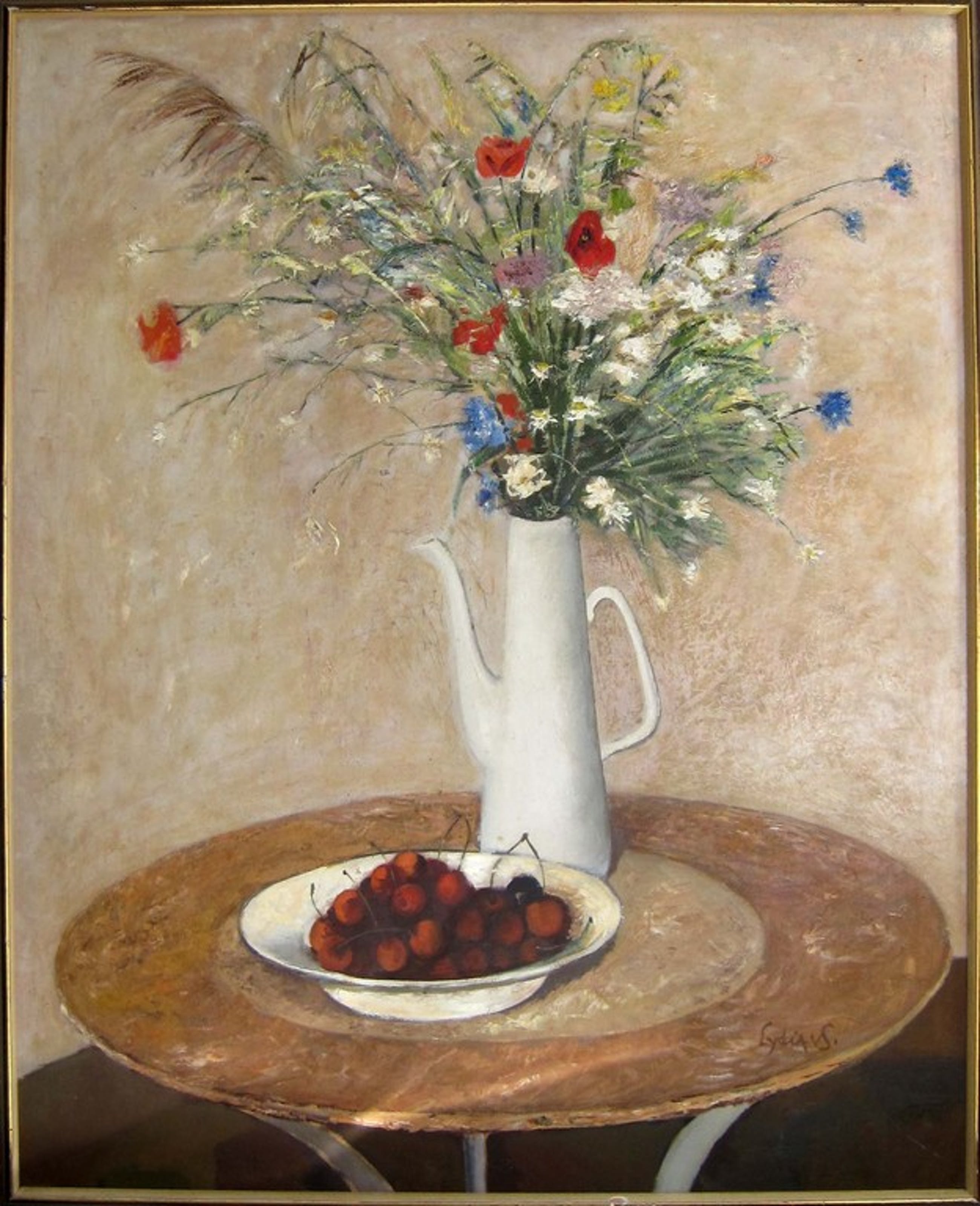 Afmeting ca 60x70 in oorspronkelijke lijst, ca. 1958, gesigneerd onderaan rechts op tafelblad