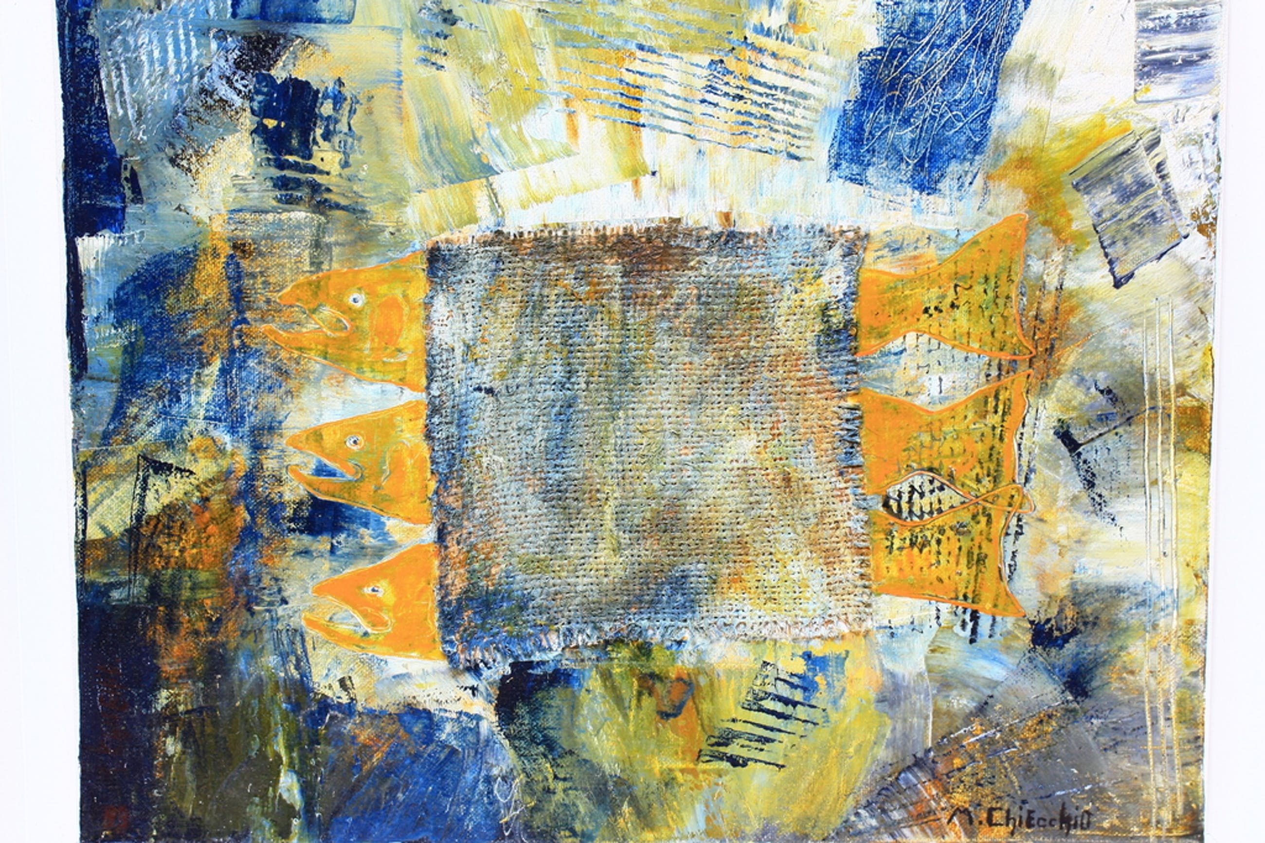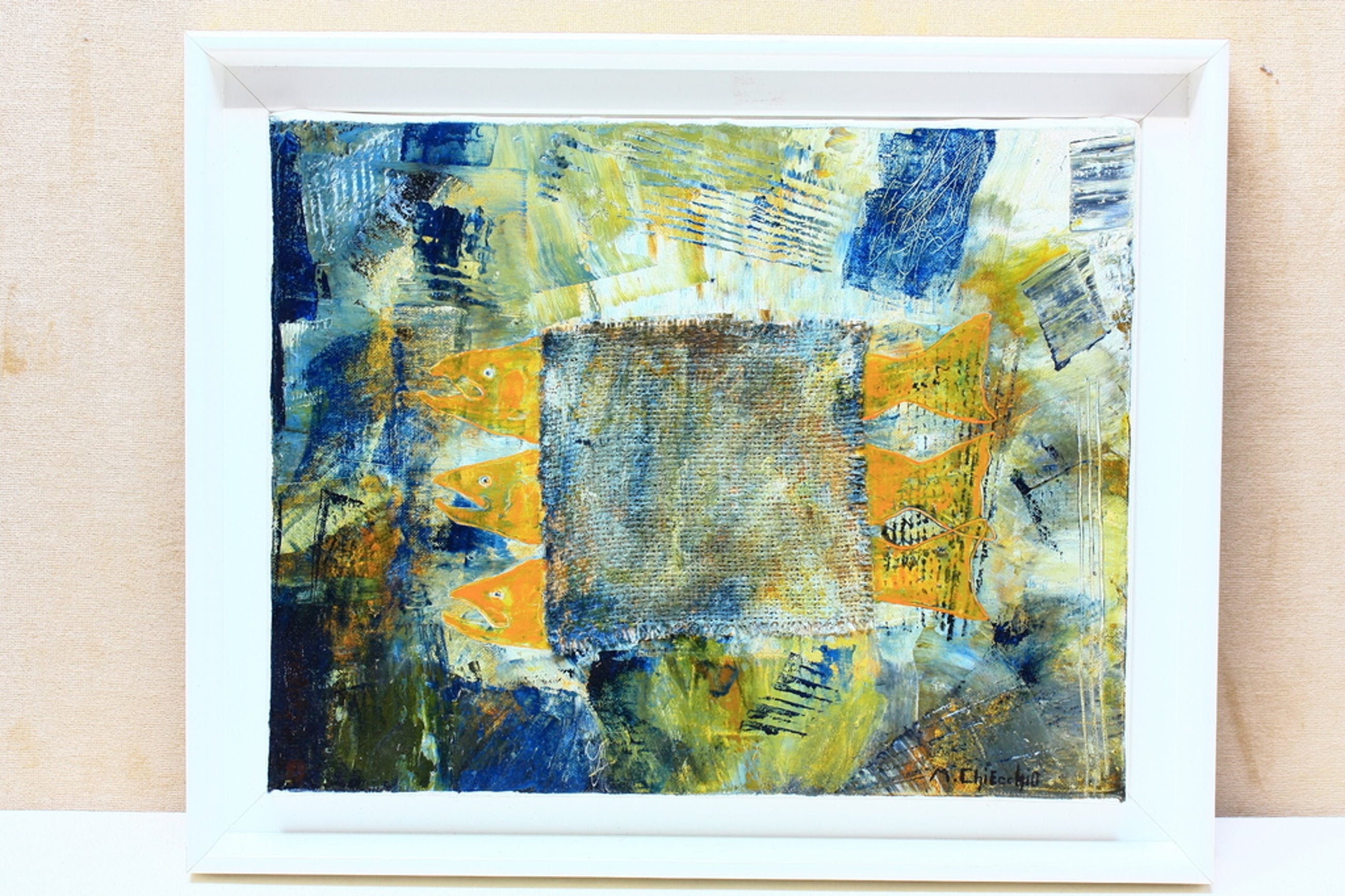 Gemende techniek van olieverf en stof (jute) in lijst.