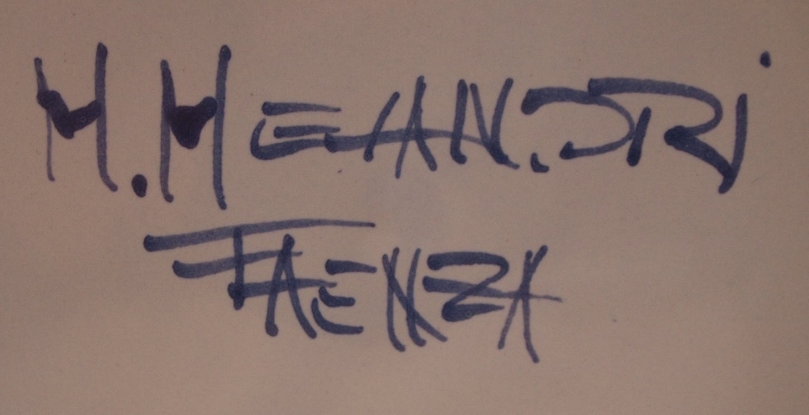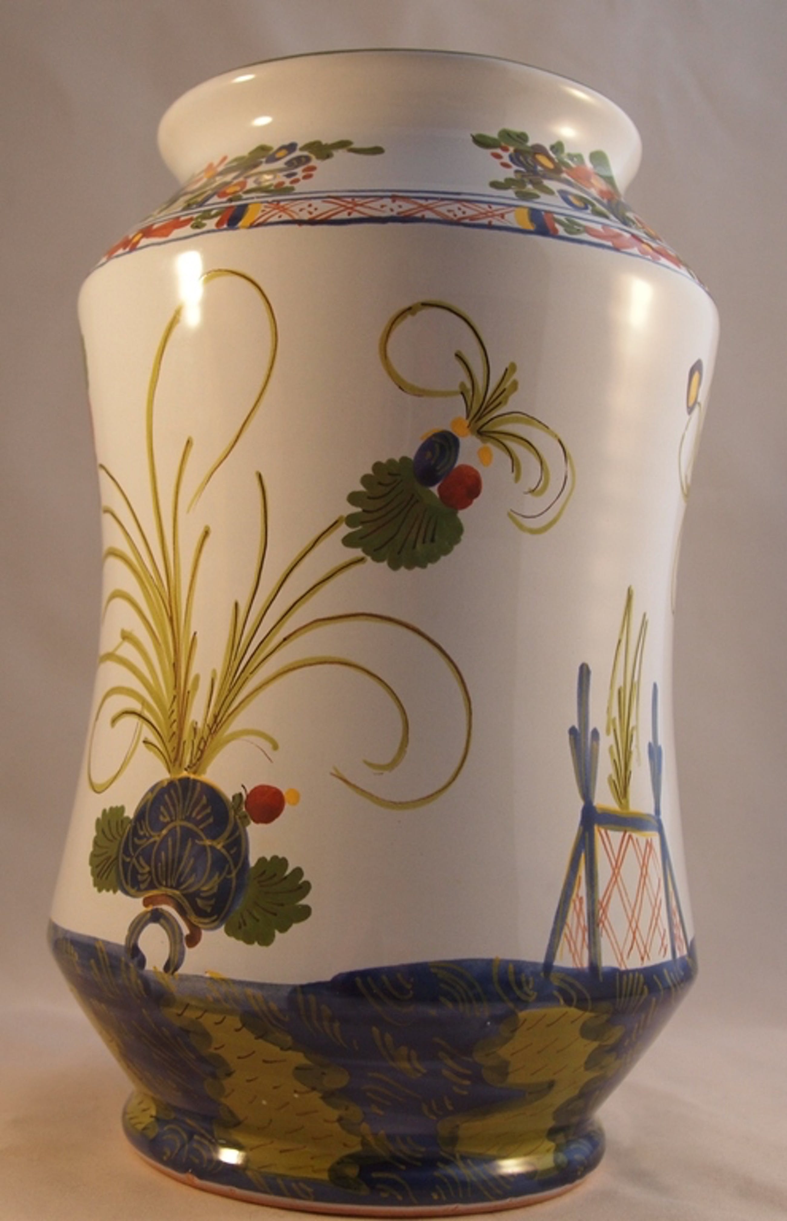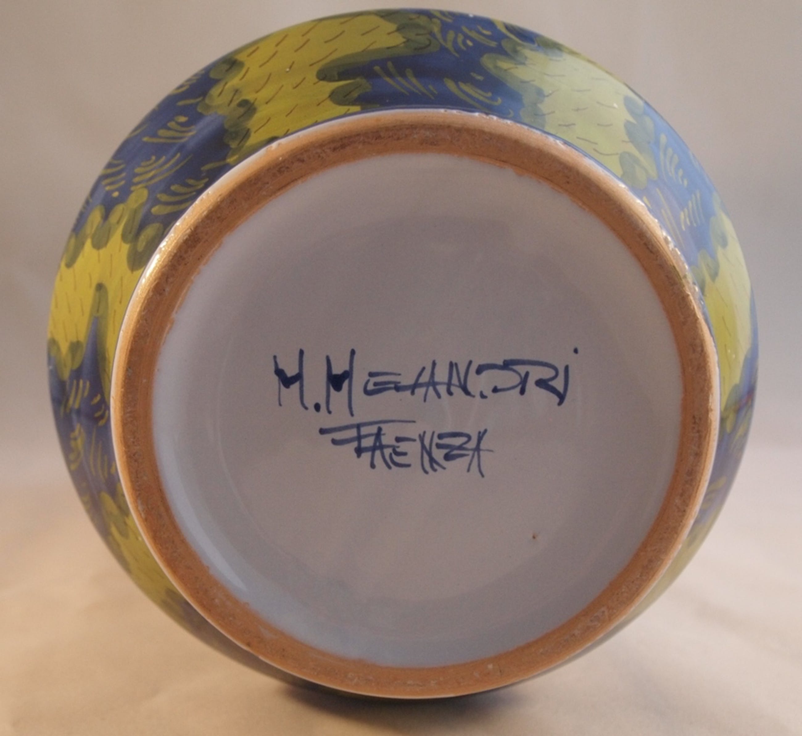 Prachtige handbeschilderde Majolica vaas van studio Melandri voorzien van een traditioneel decor. In prima onbeschadigde conditie. Aan de onderzijde met de hand gesigneerd: M. Melandri, Faenza.