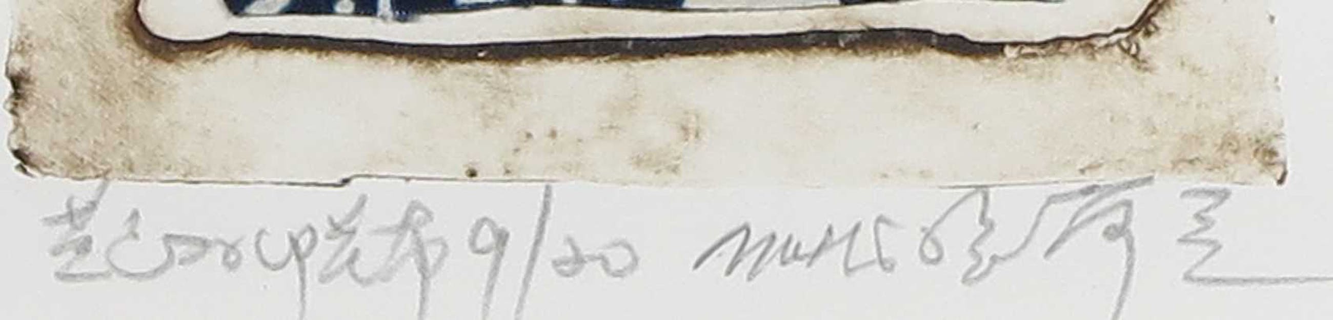 Het betreft een ets met daarop een stukje bedrukt textiel bevestigd, in oplage, nummer 9/20.