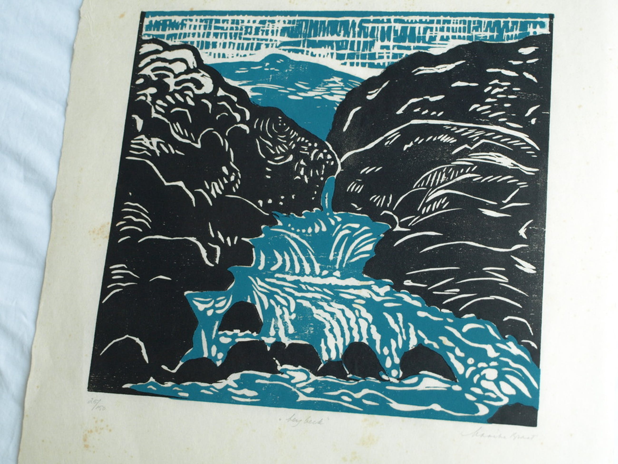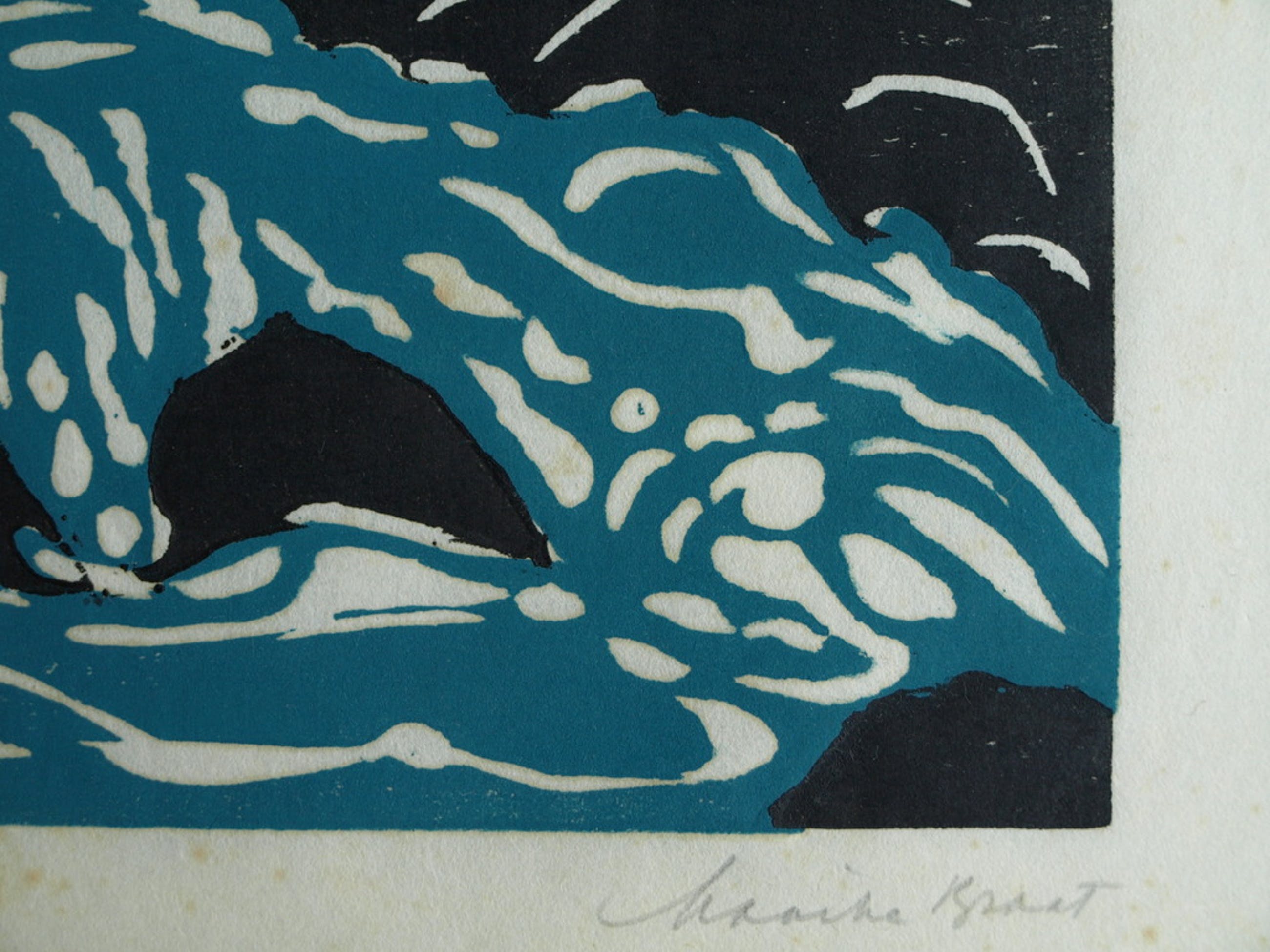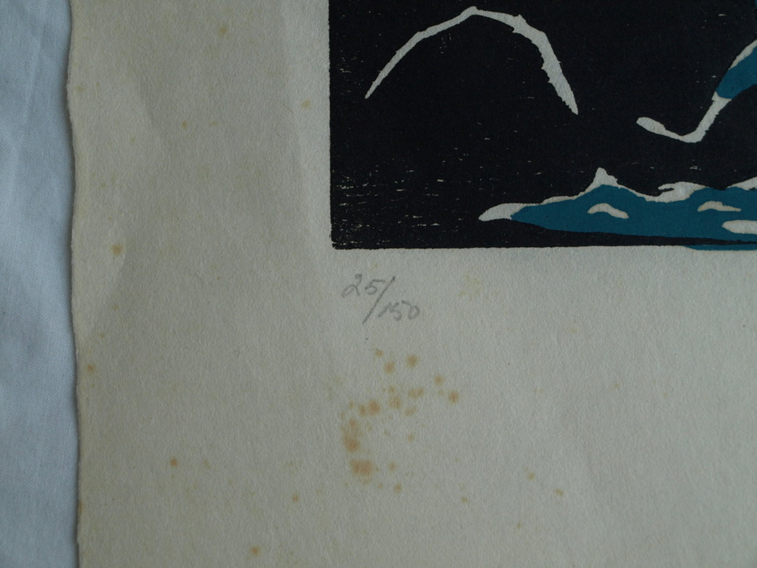 Techniek: Linosnede afgedrukt op rijstpapier.