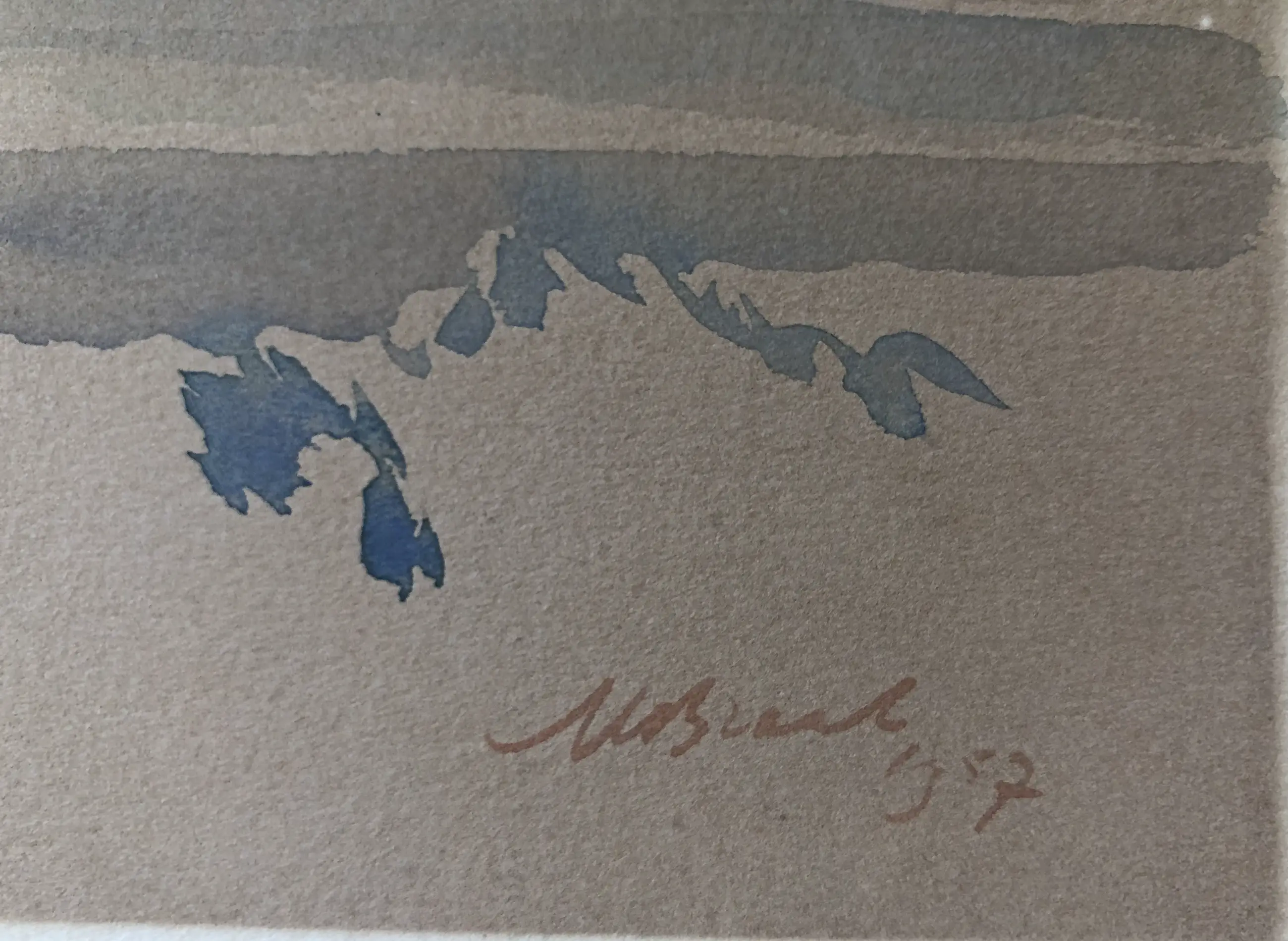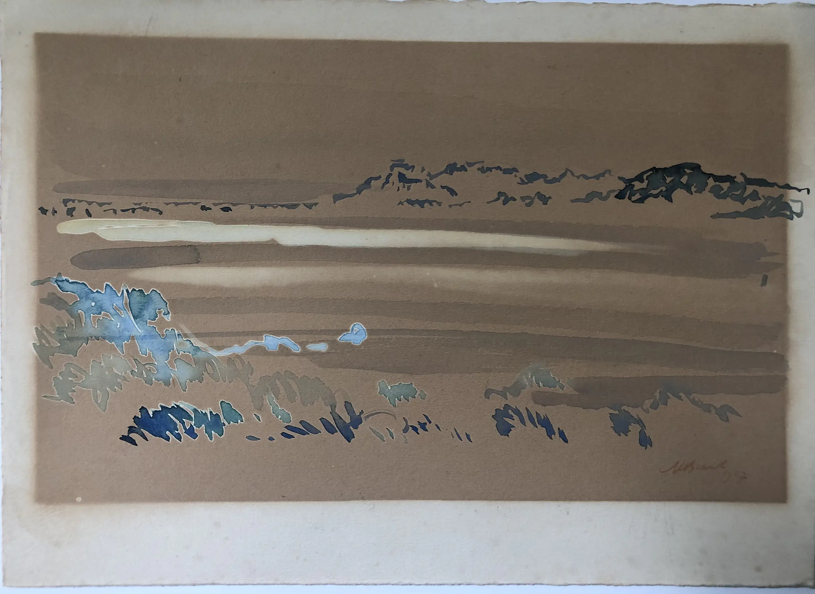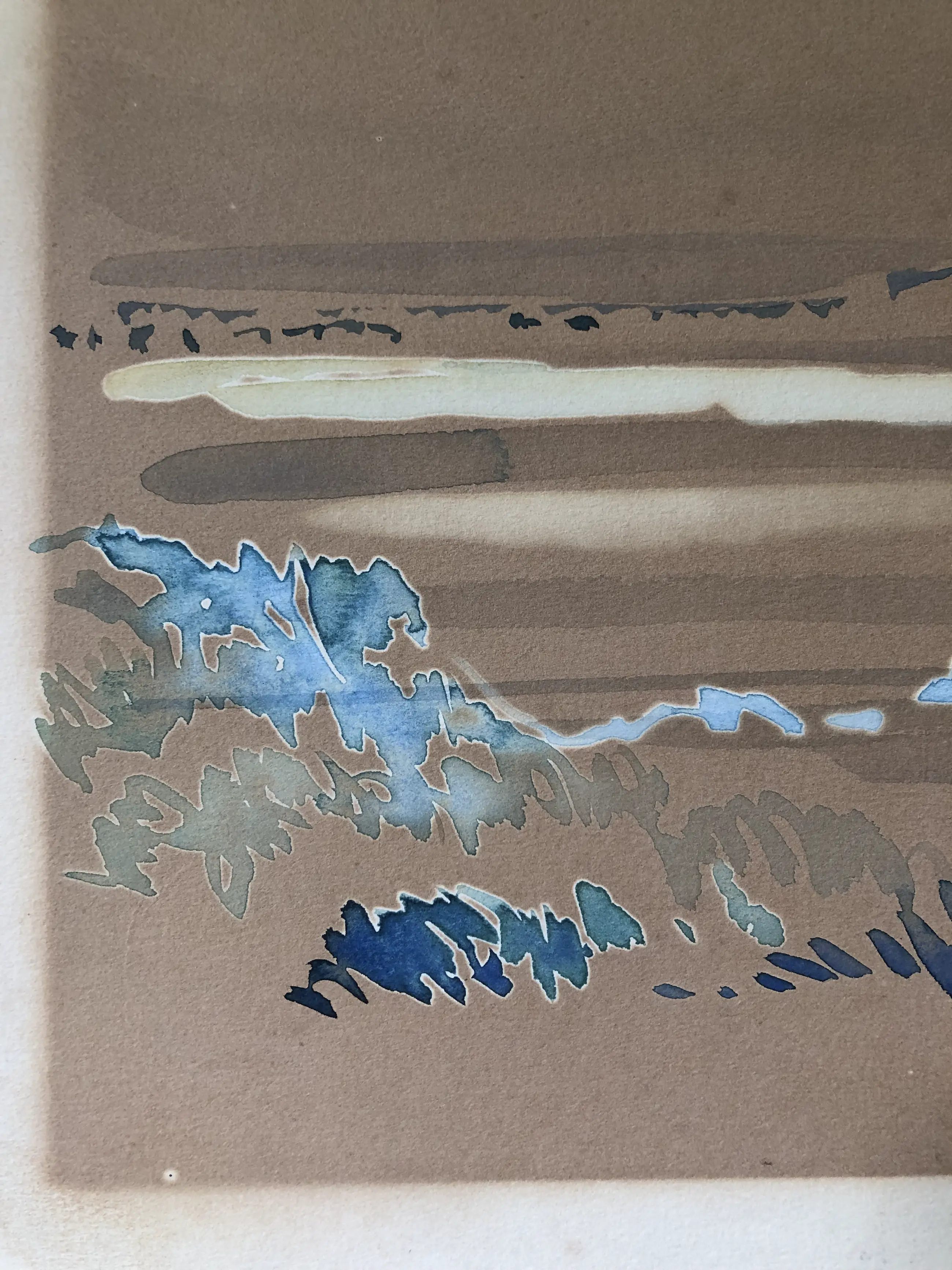 Aquarel: 27-38 cm Duinen en de zee. Werk verkleurd. Wellicht klusje voor papierrestaurateur.