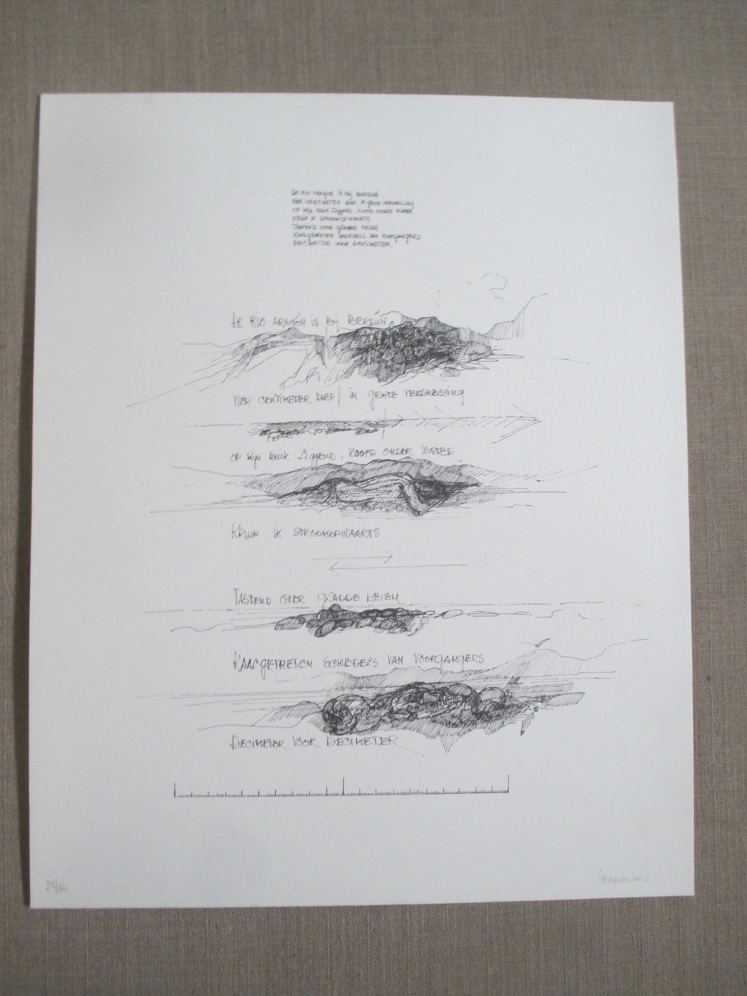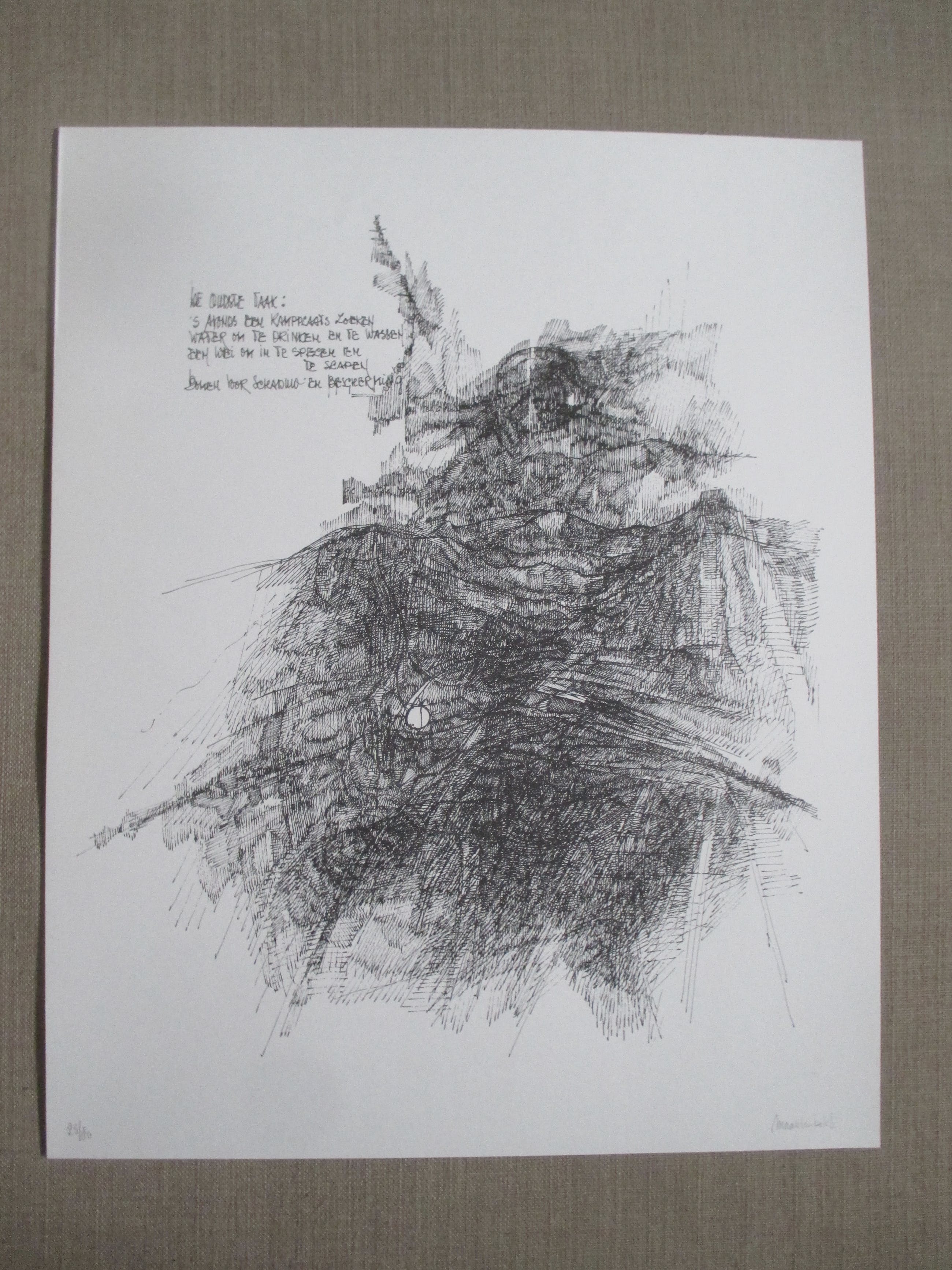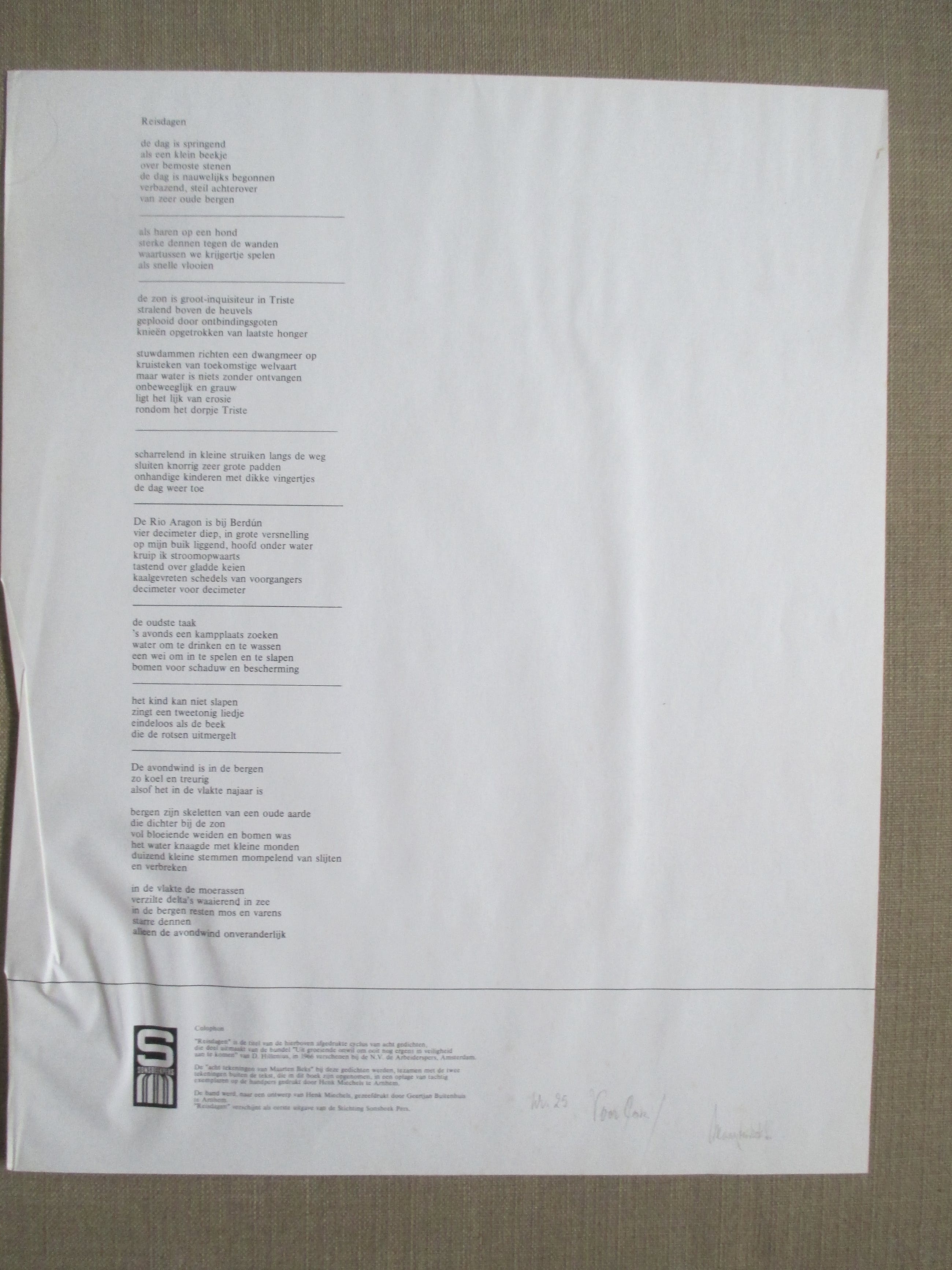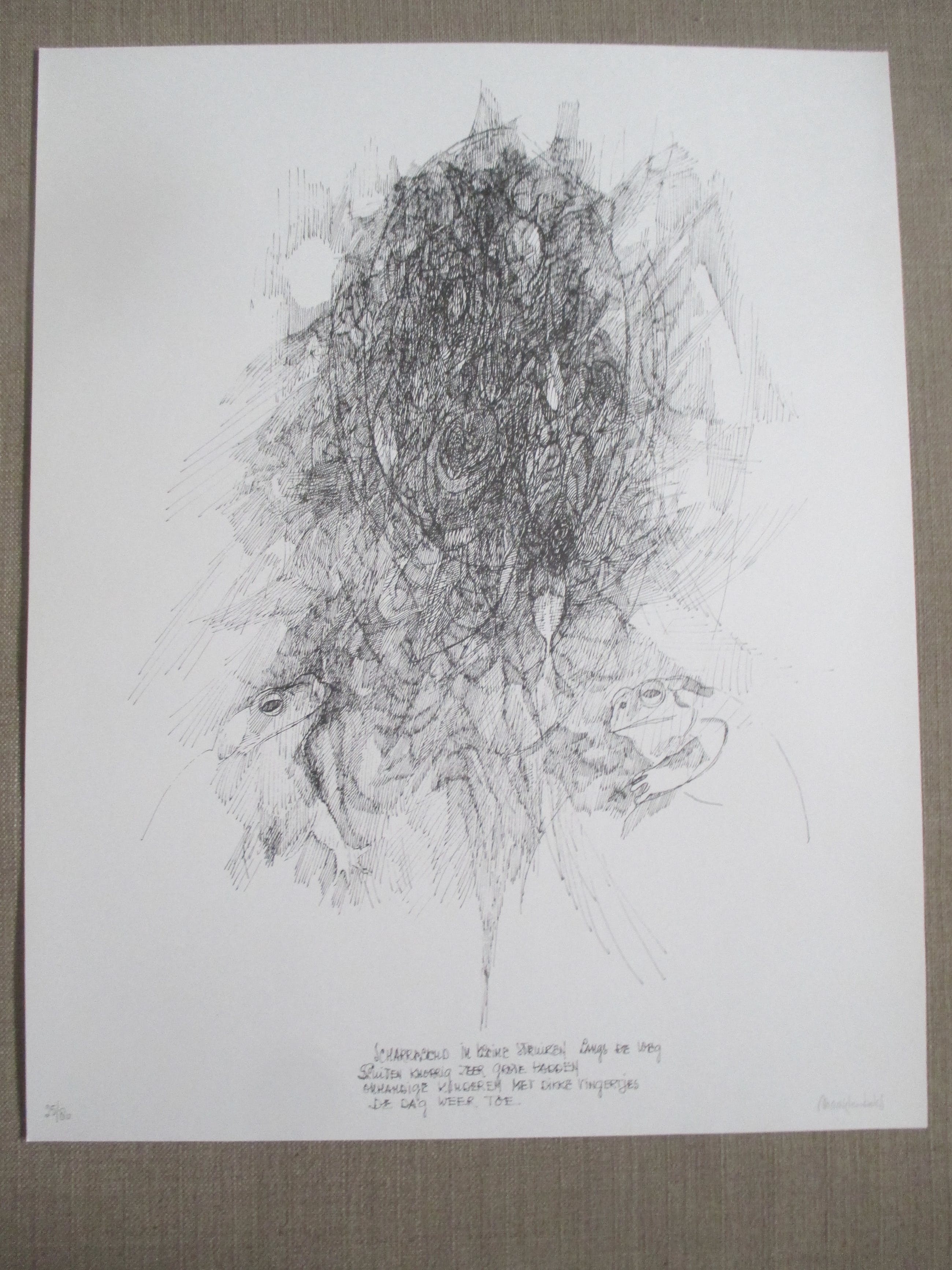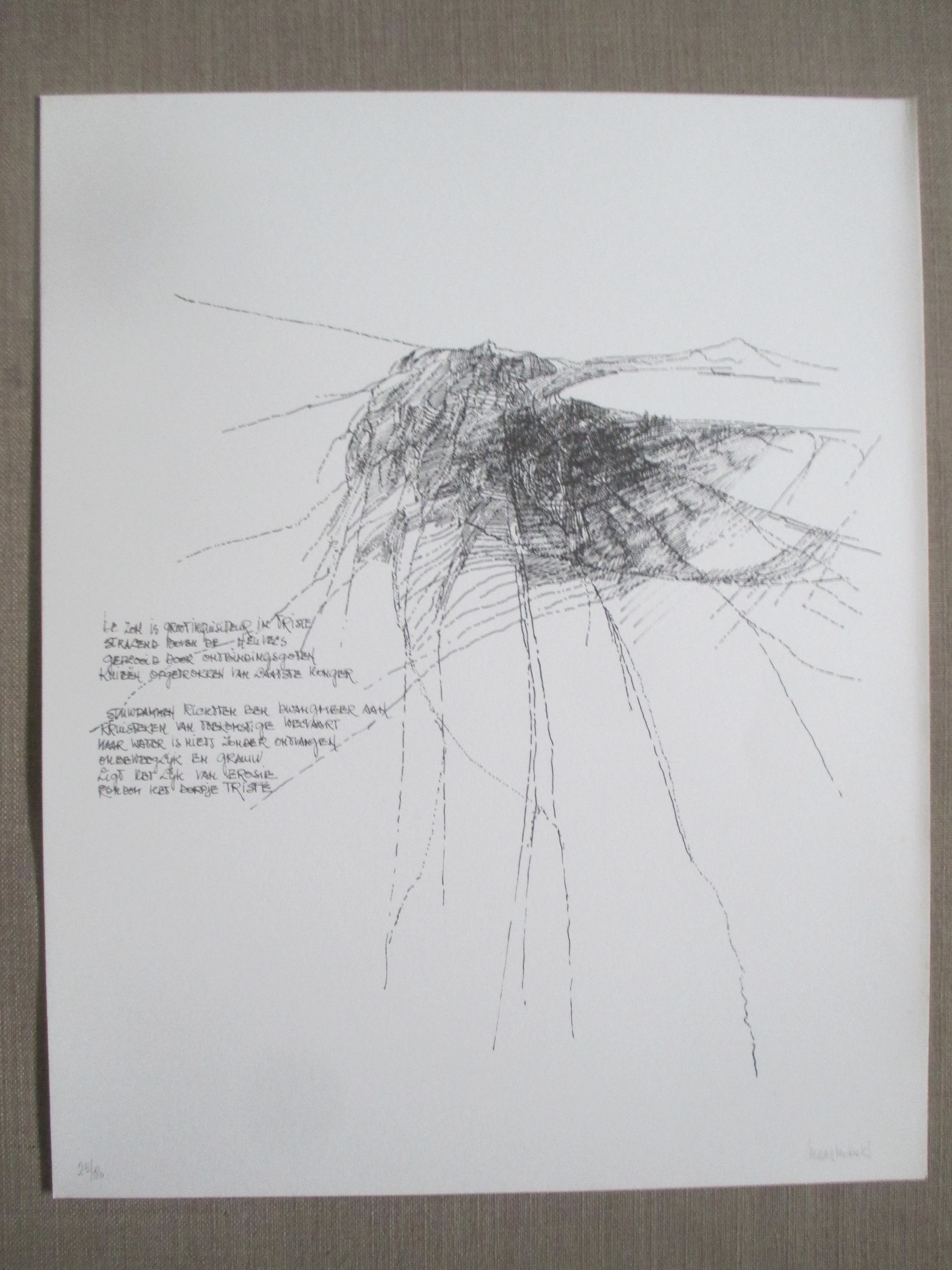 Map met tien litho's (gedrukte tekeningen) van maarten Beks, elk gesigneerd en genummerd in potlood. Op de colofon pagina tevens gesigneerd en genummerd en met opdracht.