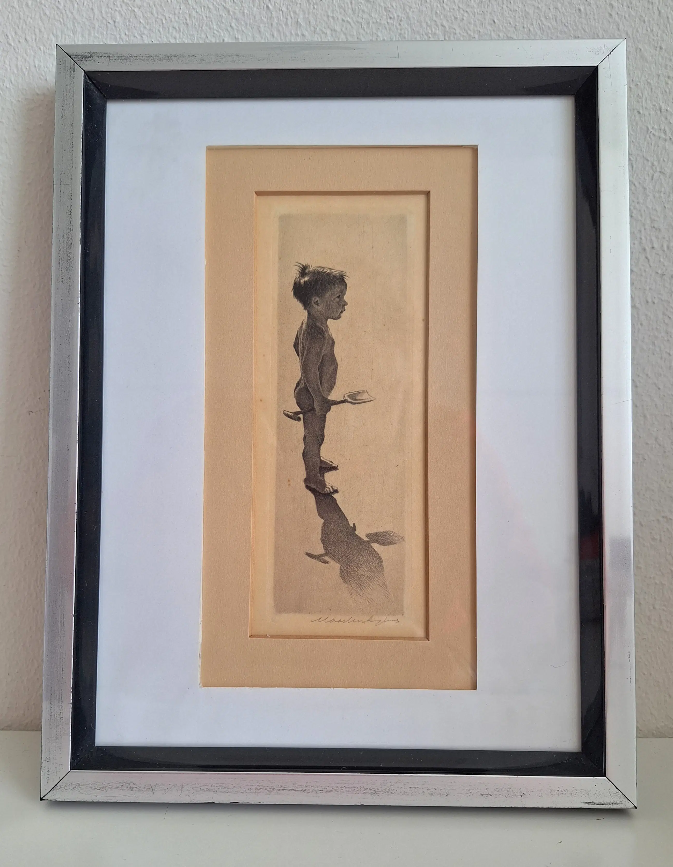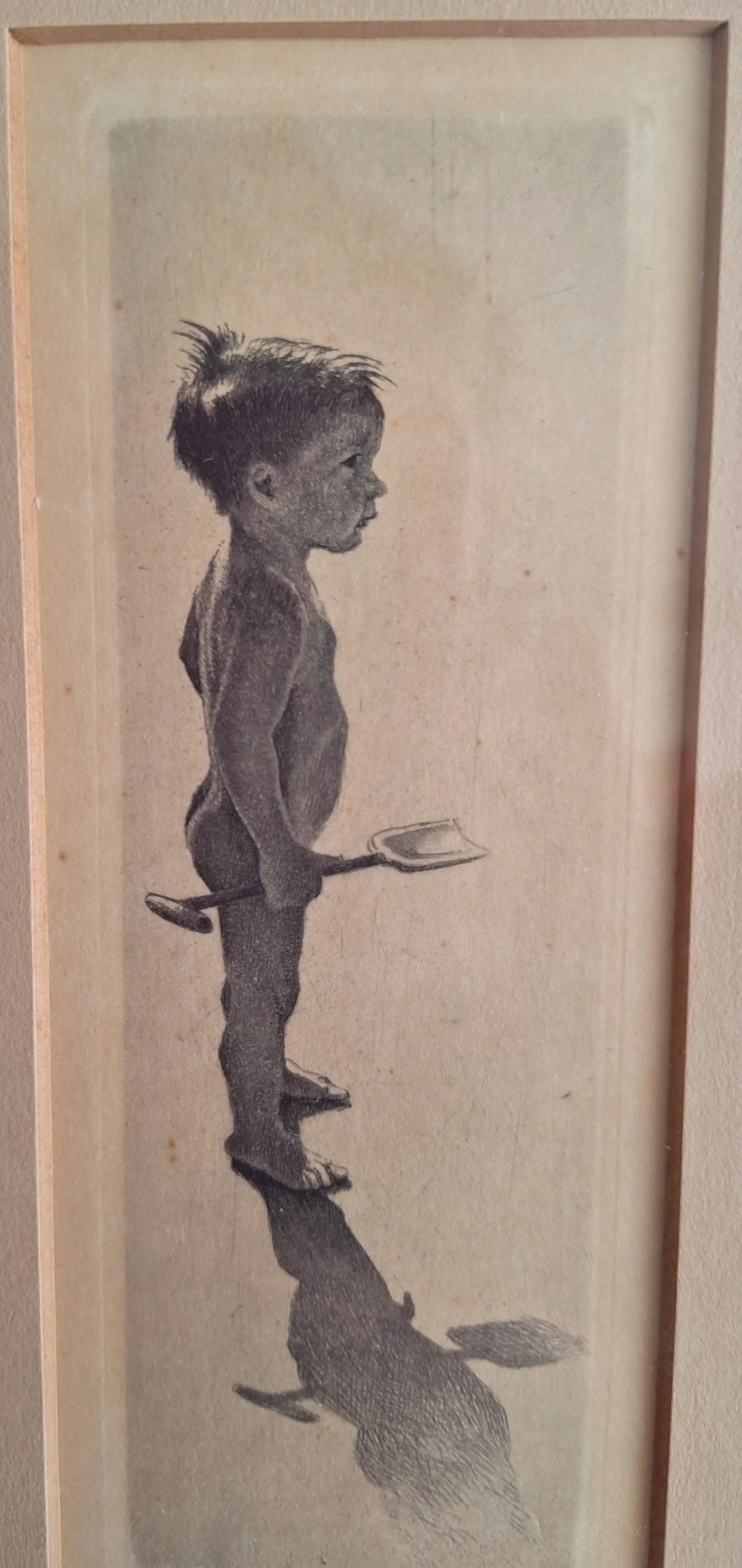 Fraaie ets van een aandoenlijk jongetje, met een schep in zijn hand.