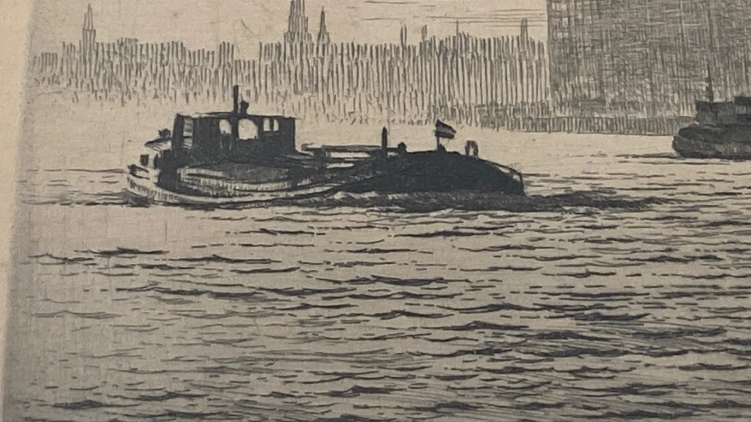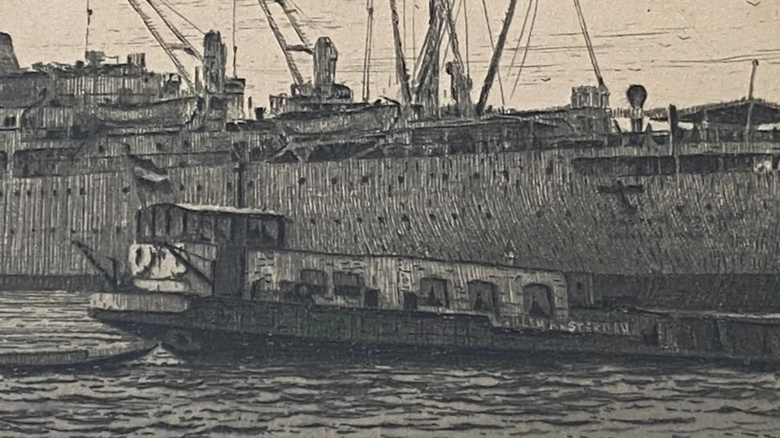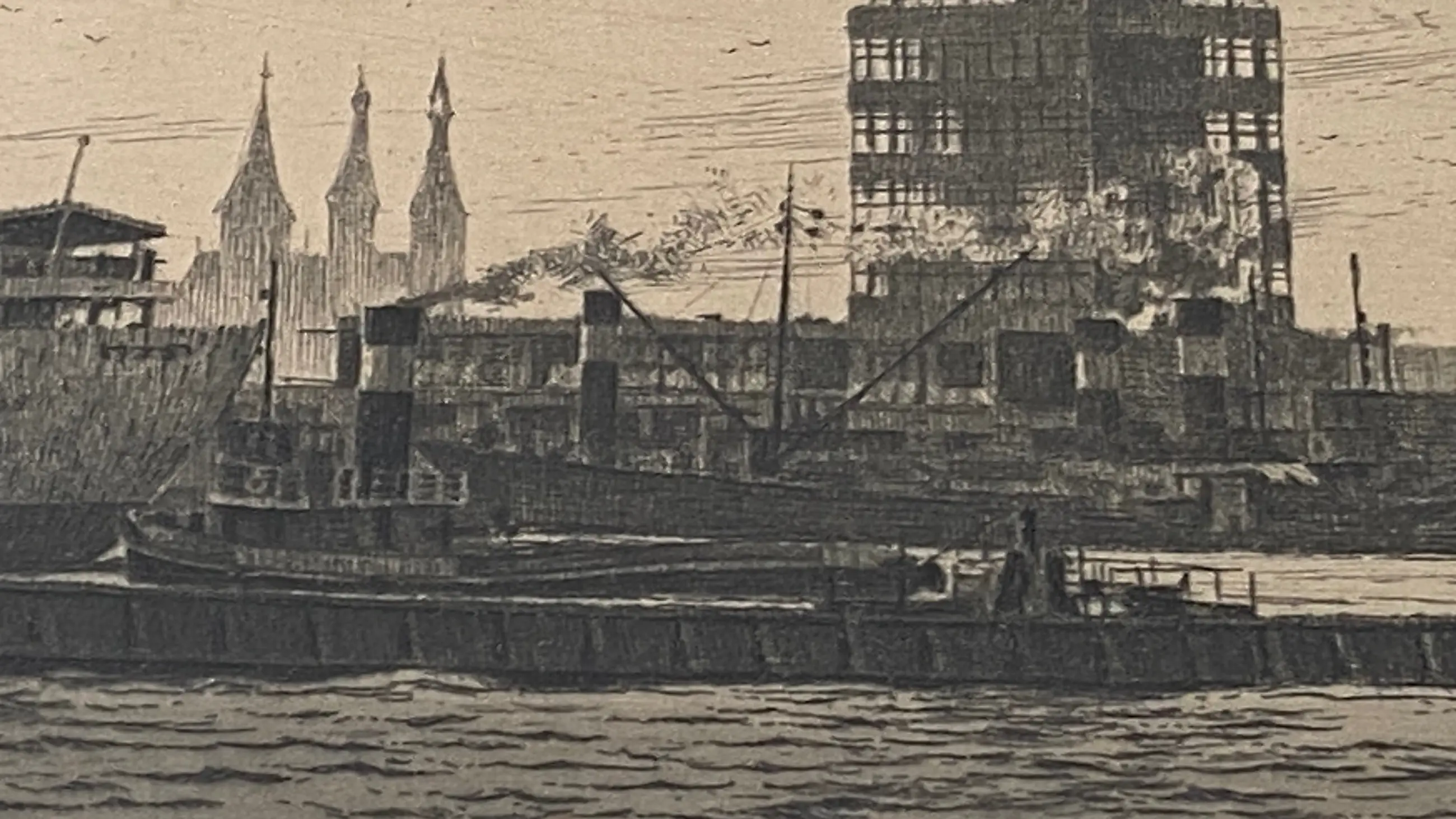 Deze sfeervolle ets van Maarten Langbroek toont een levendig panorama van het IJ in Amsterdam, met stoomschepen, havenkranen en industriële bebouwing langs de waterlijn. Langbroek staat bekend om zijn realistische en technisch sterke weergaven van Nederlandse havengebieden, waarbij hij de dynamiek van scheepvaart en industrie op karakteristieke wijze vastlegt.