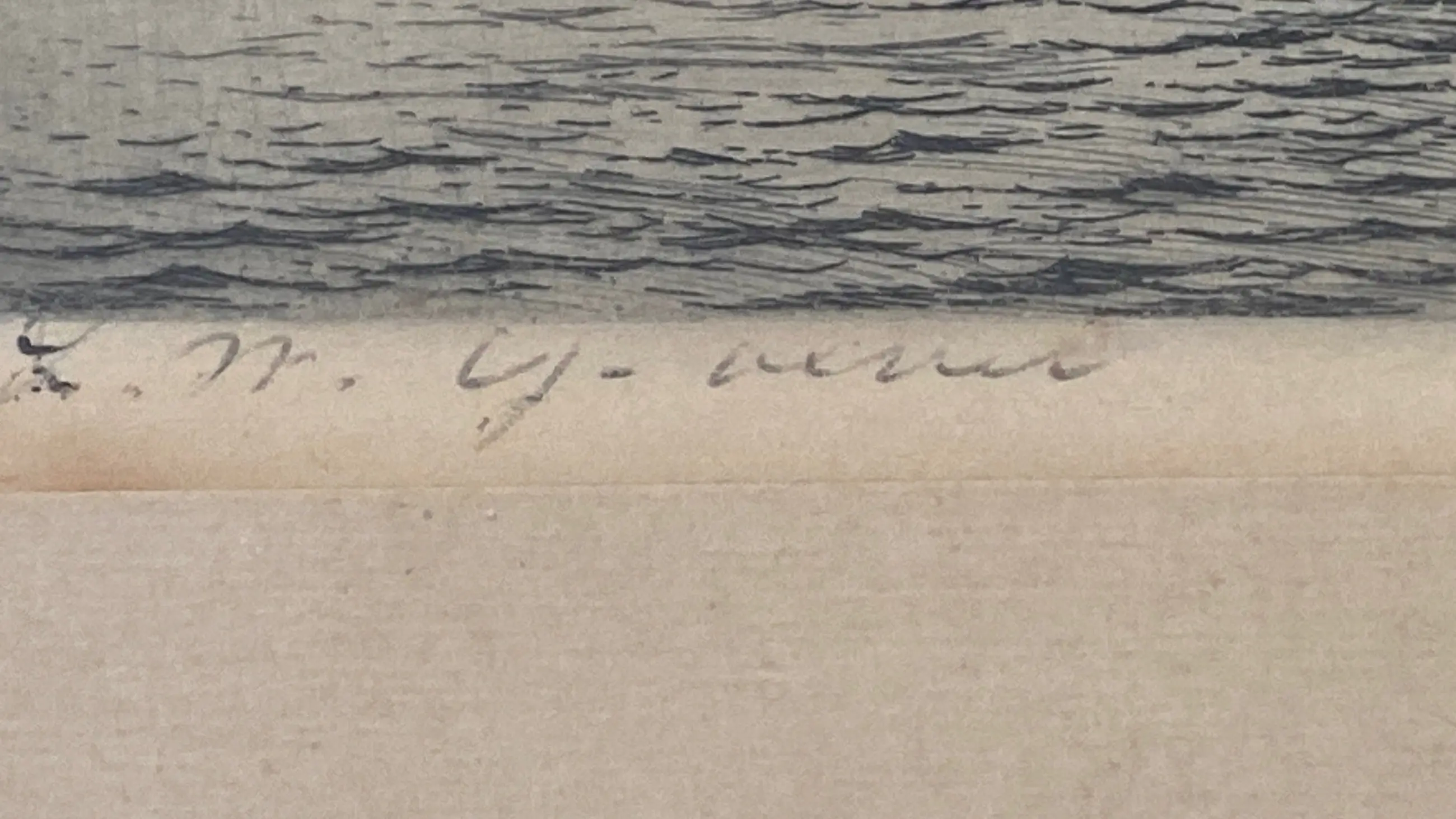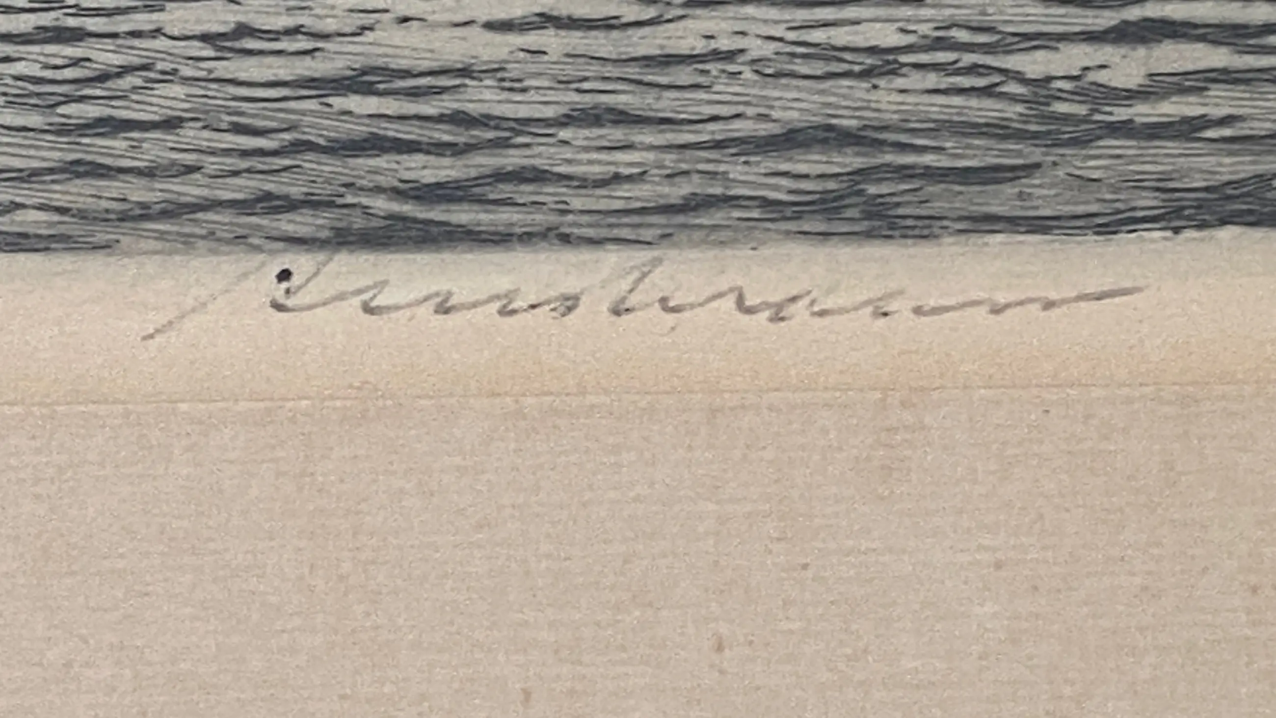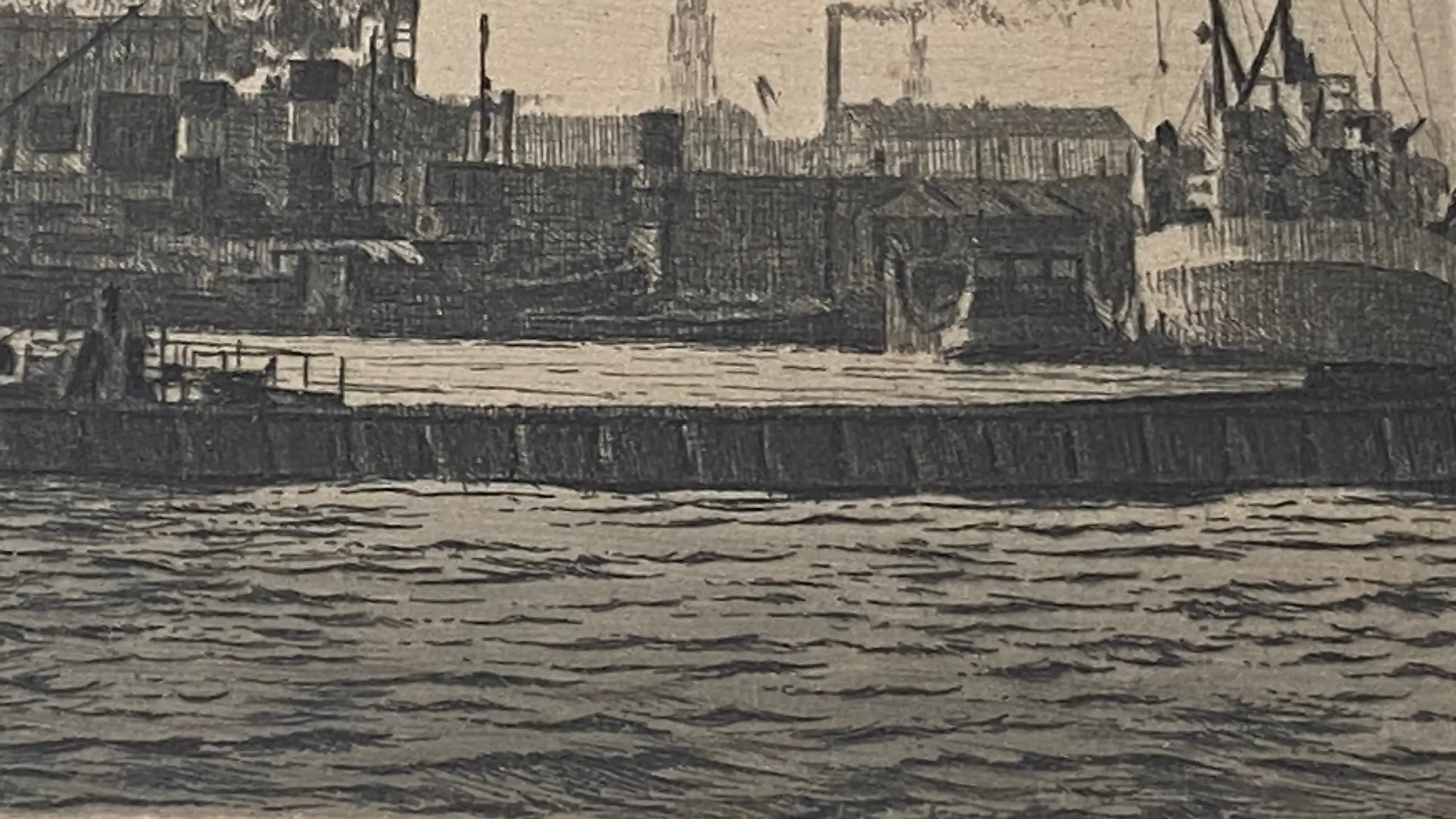 Deze sfeervolle ets van Maarten Langbroek toont een levendig panorama van het IJ in Amsterdam, met stoomschepen, havenkranen en industriële bebouwing langs de waterlijn. Langbroek staat bekend om zijn realistische en technisch sterke weergaven van Nederlandse havengebieden, waarbij hij de dynamiek van scheepvaart en industrie op karakteristieke wijze vastlegt.