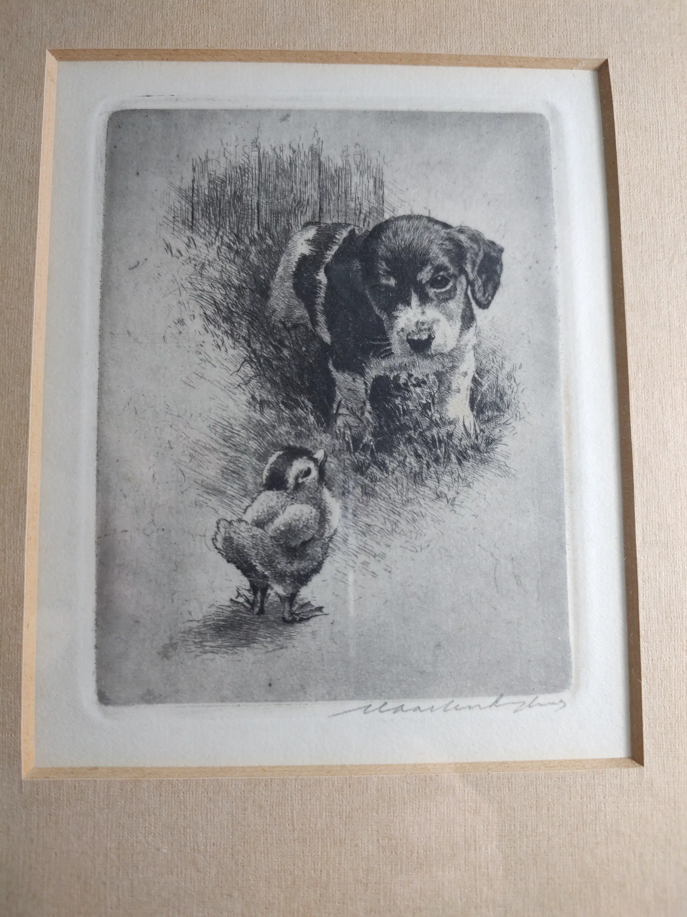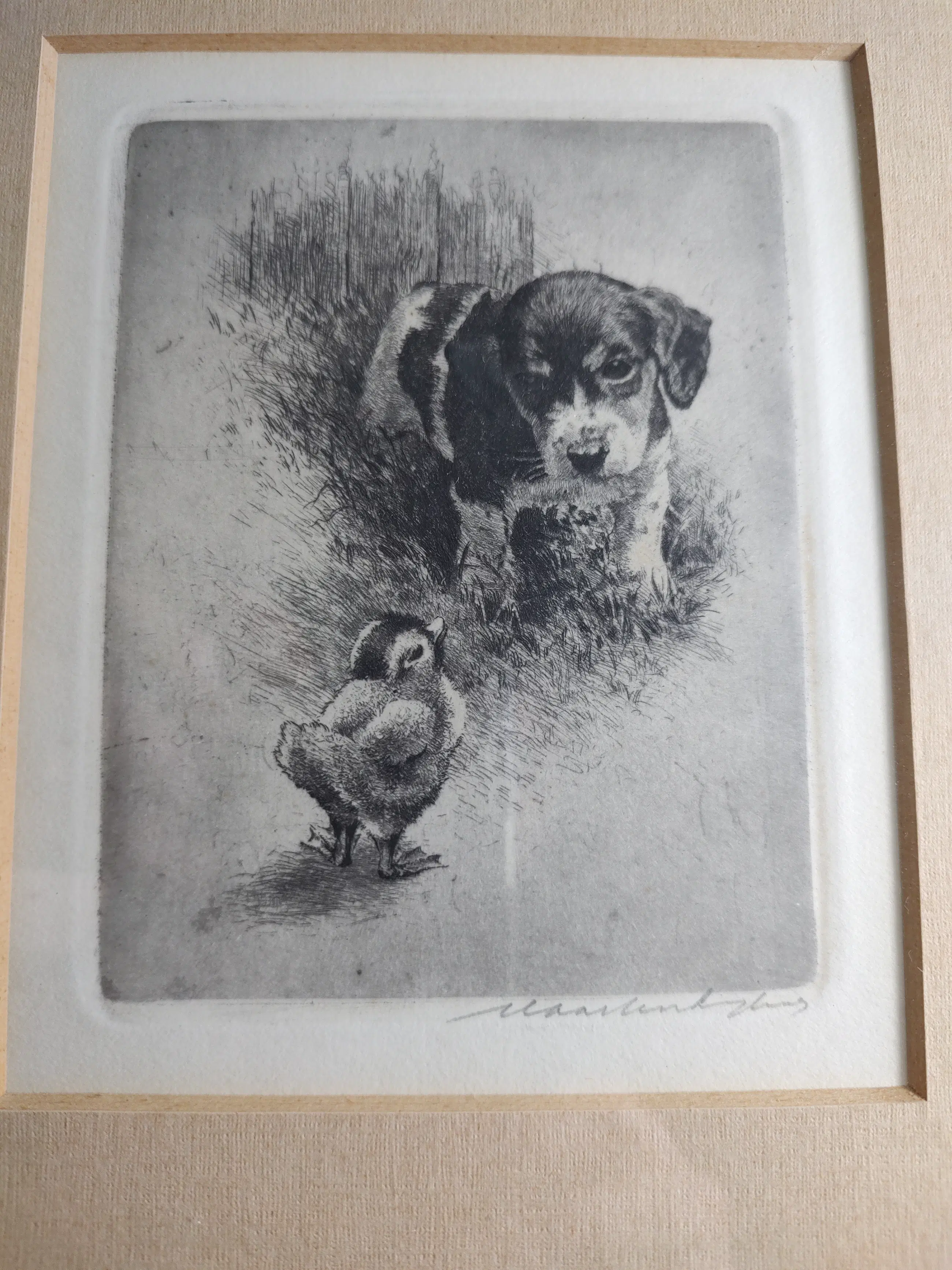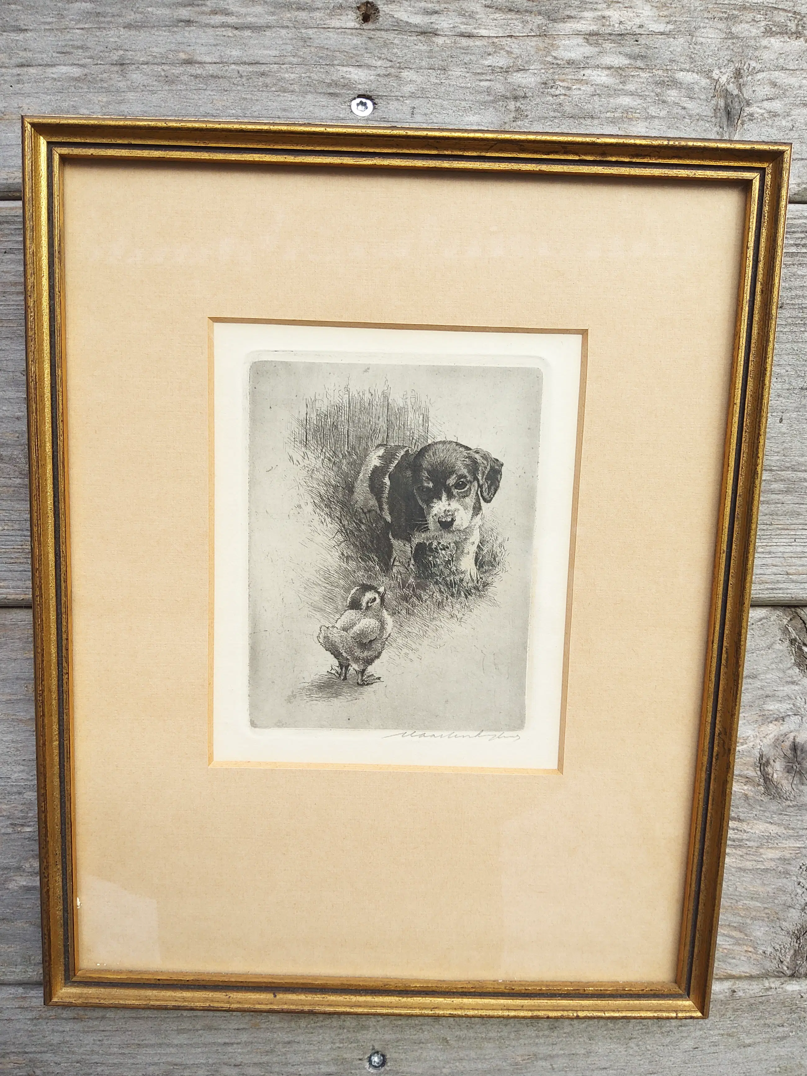 Ingelijste ets Voorstellend jonge hond met kuiken. Passe-partout met fraai geborsteld gouden lijstje.