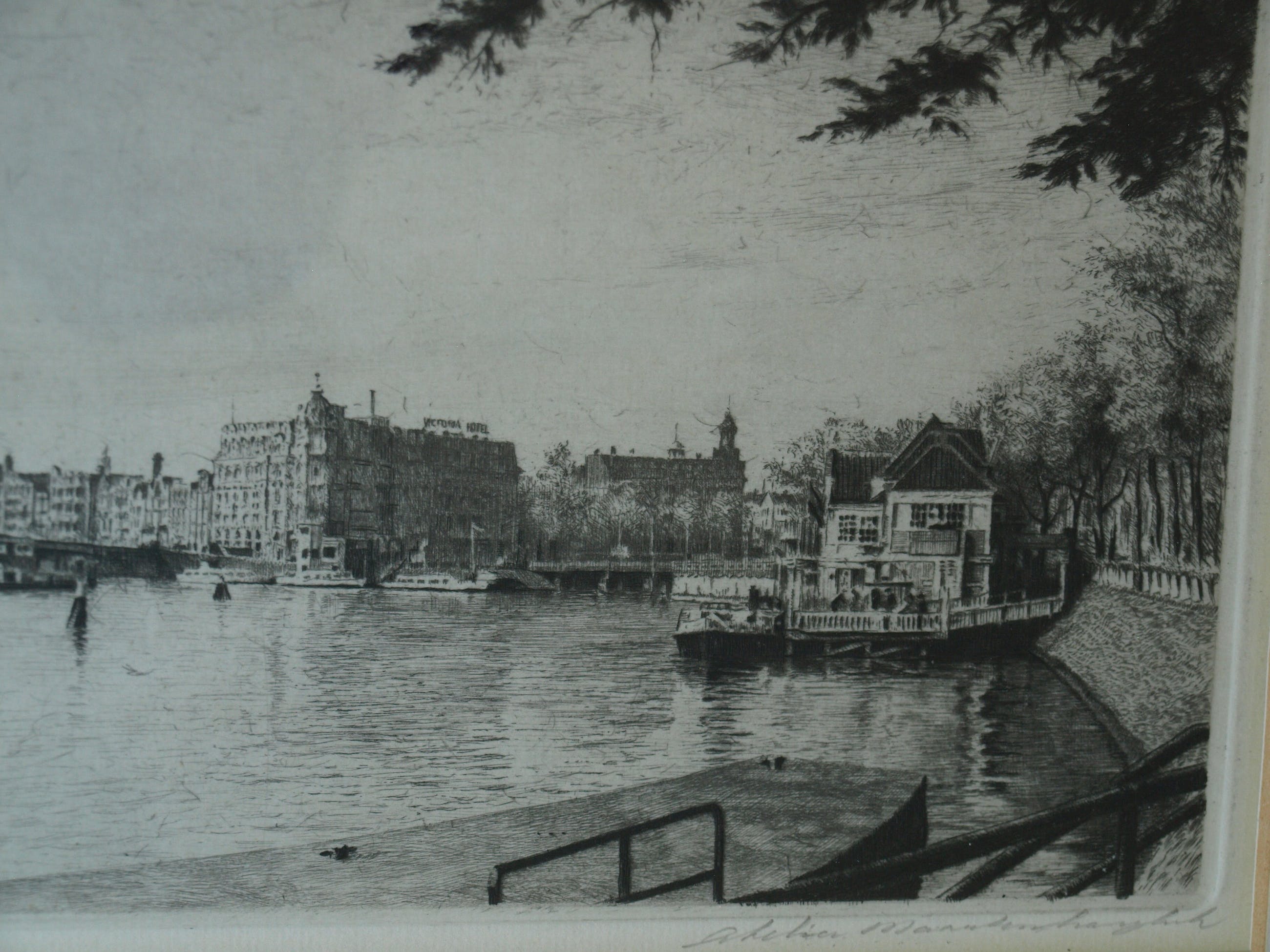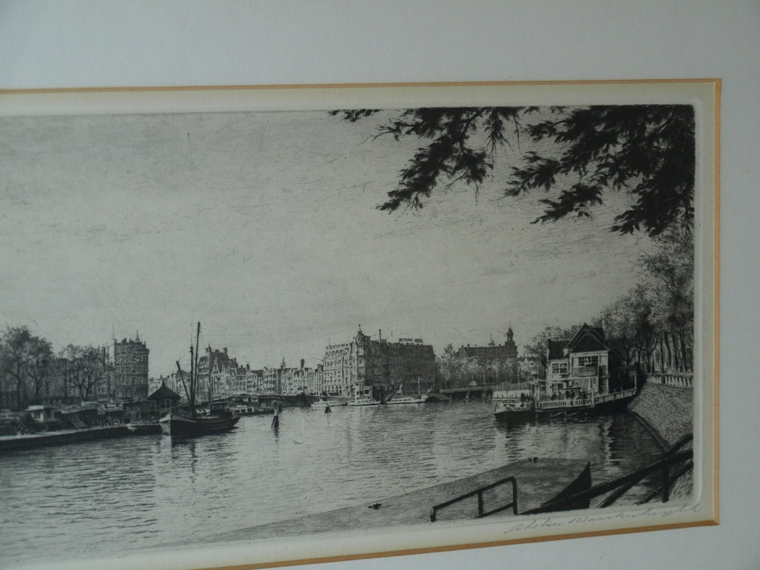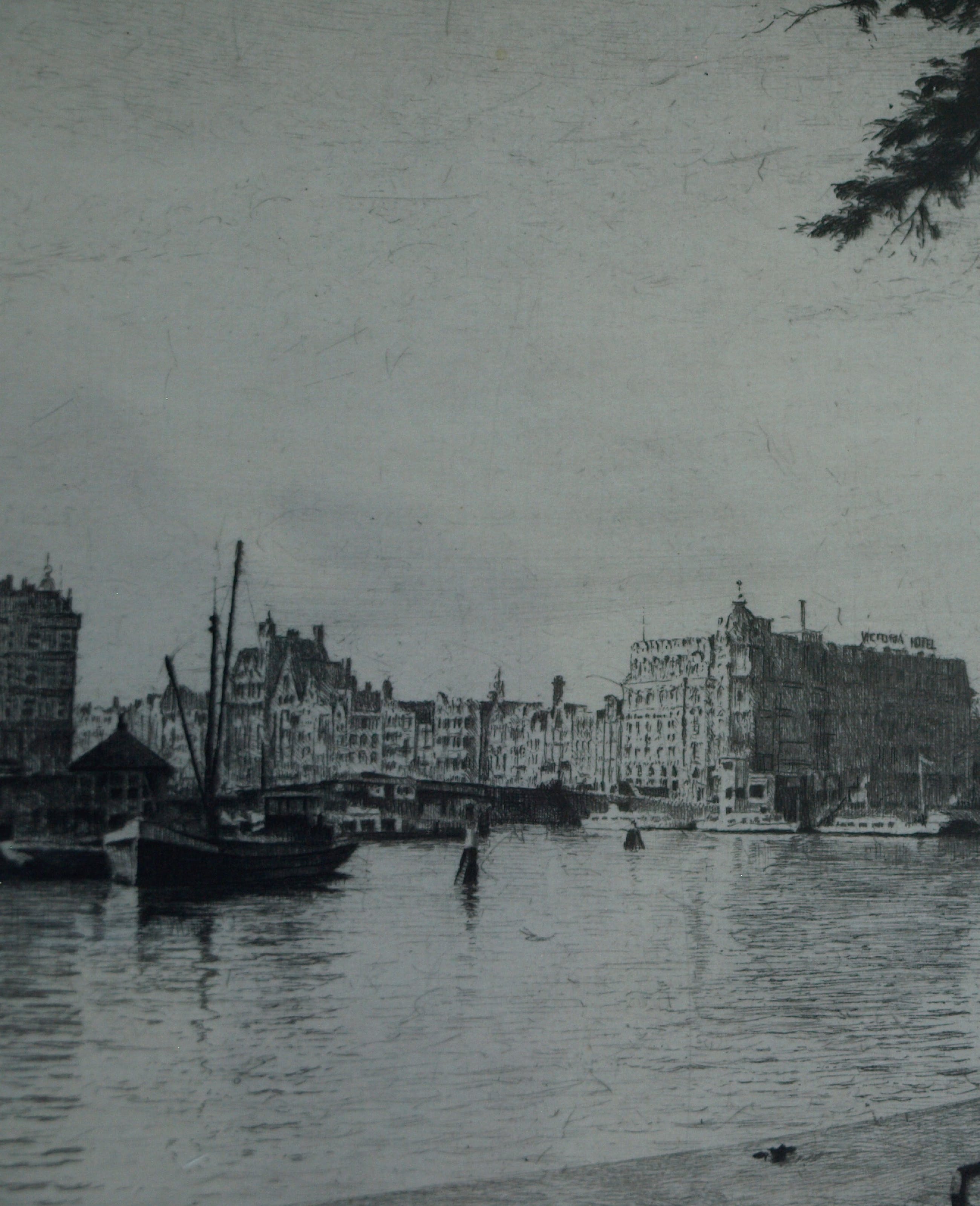 Een ets uit ca. 1970 van de Nederlandse kunstenaar Maarten Langbroek (1918-1985) met een voorstelling van de Prins Hendrikkade in Amsterdam, met o.a. op de achtergrond het Victoria Hotel en links de Sint-Nicolaaskerk.