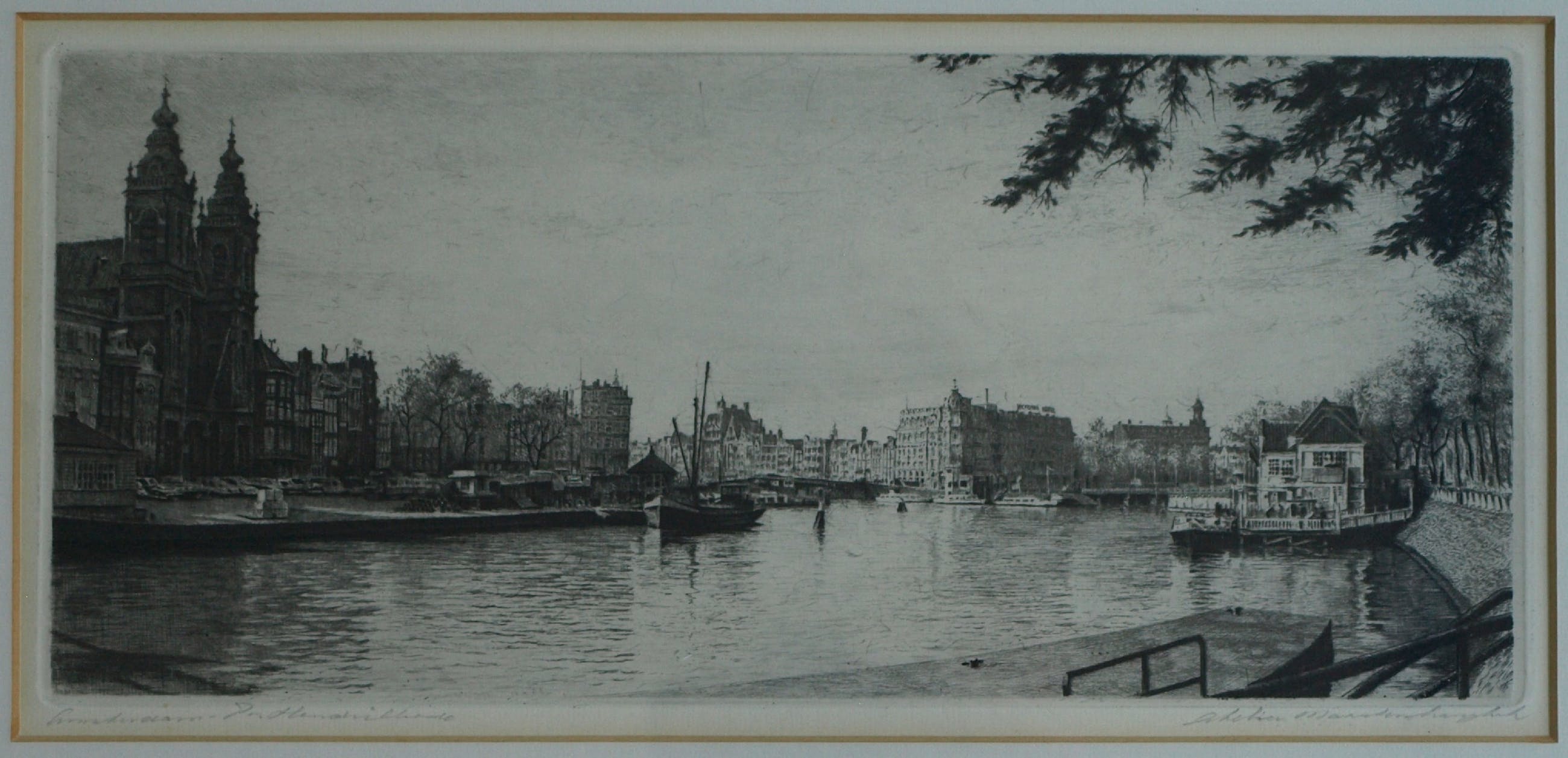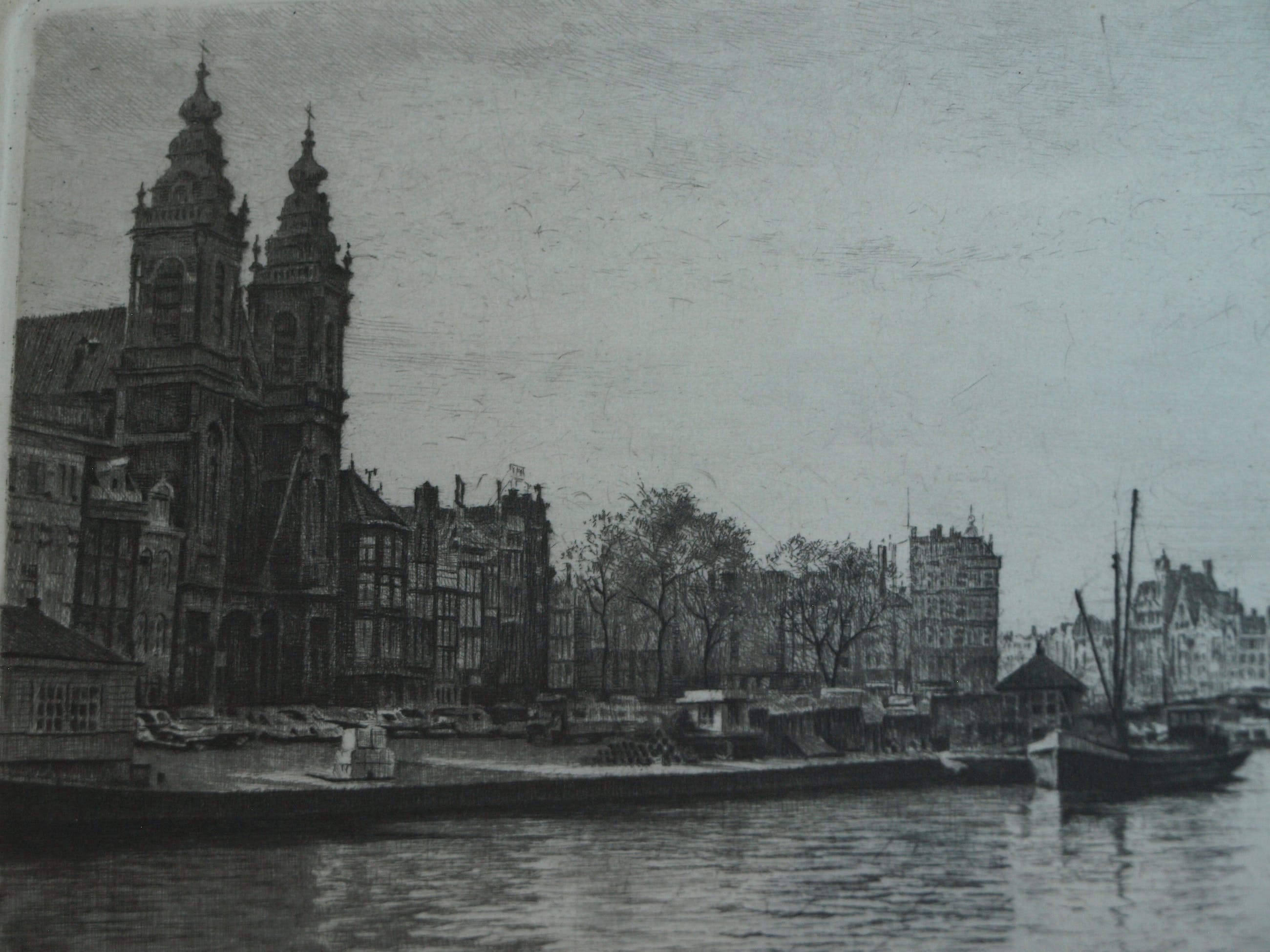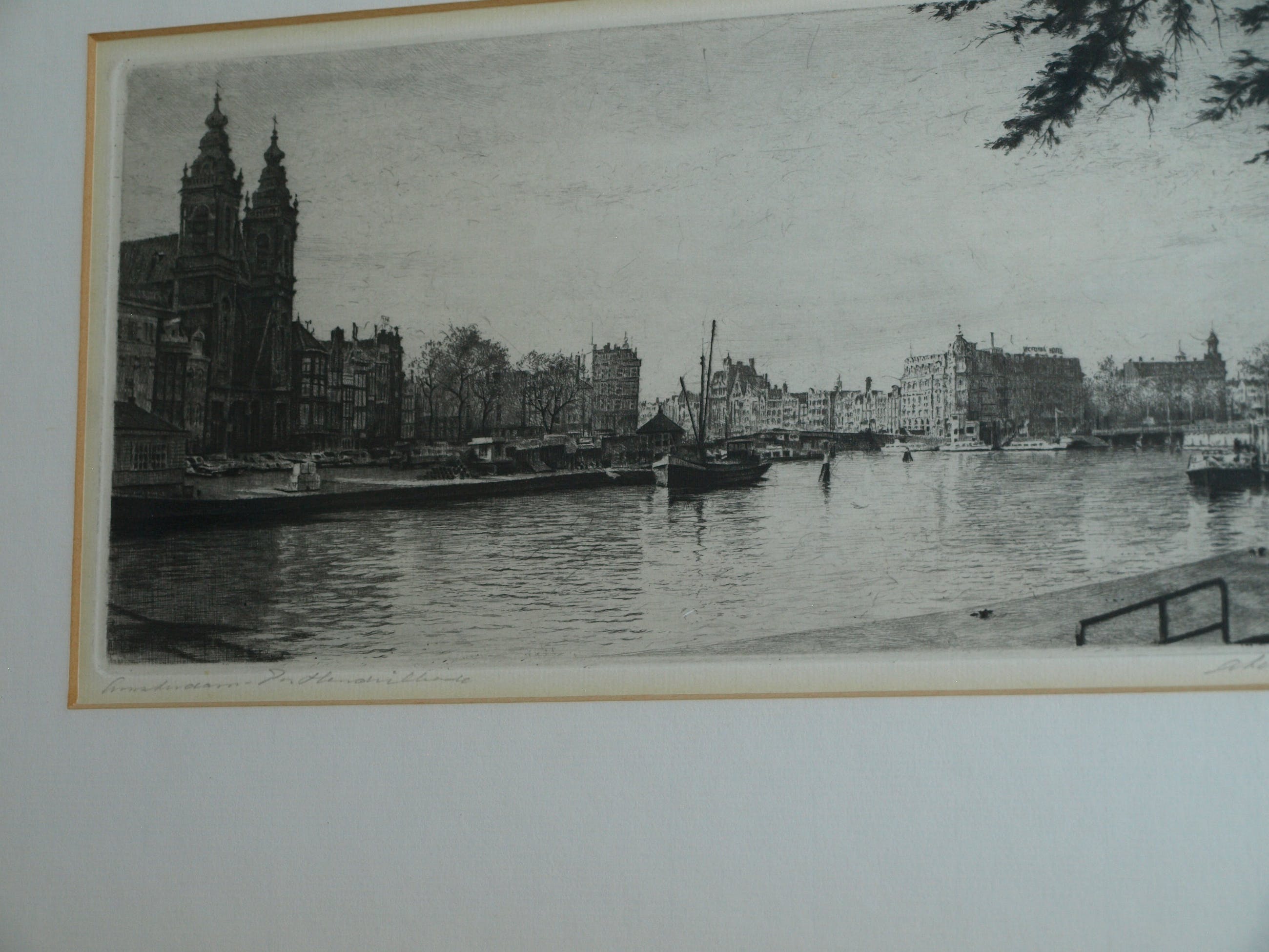 Een ets uit ca. 1970 van de Nederlandse kunstenaar Maarten Langbroek (1918-1985) met een voorstelling van de Prins Hendrikkade in Amsterdam, met o.a. op de achtergrond het Victoria Hotel en links de Sint-Nicolaaskerk.