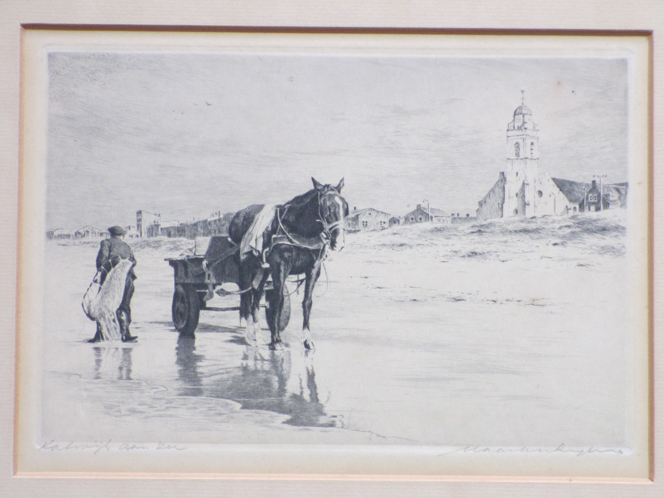 Ets door Maarten Langbroek Voorstelling van een schelpenvisser op het strand bij Katwijk aan Zee Ets onder passepartout, beeldmaat 11.5x17.5, p.p.maat 23x28.5 Gesigneerd in potlood r.o.: 'Maarten Langbroek' Getiteld in potlood l.o.: 'Katwijk aan zee' Authenticiteit volledig gegarandeerd