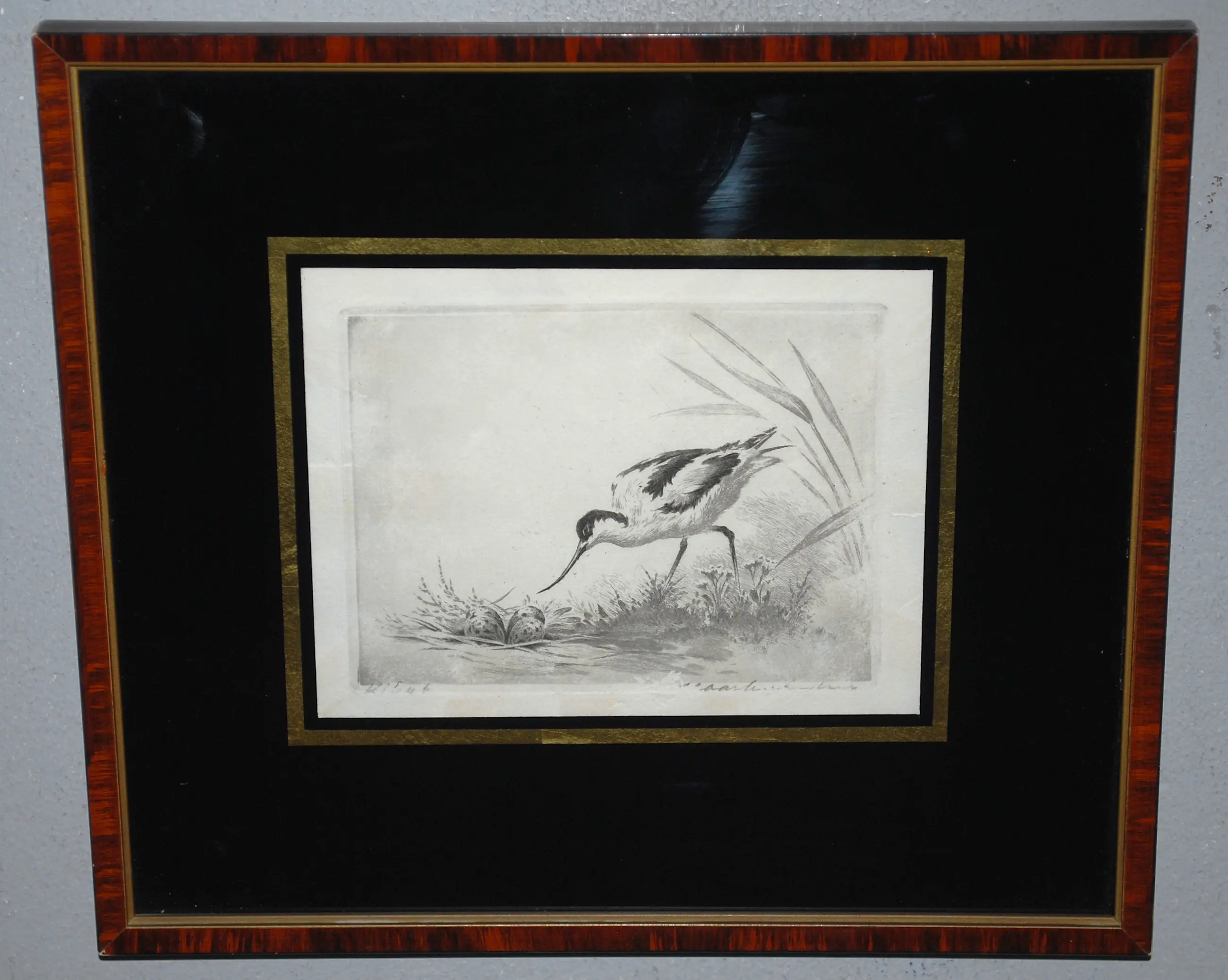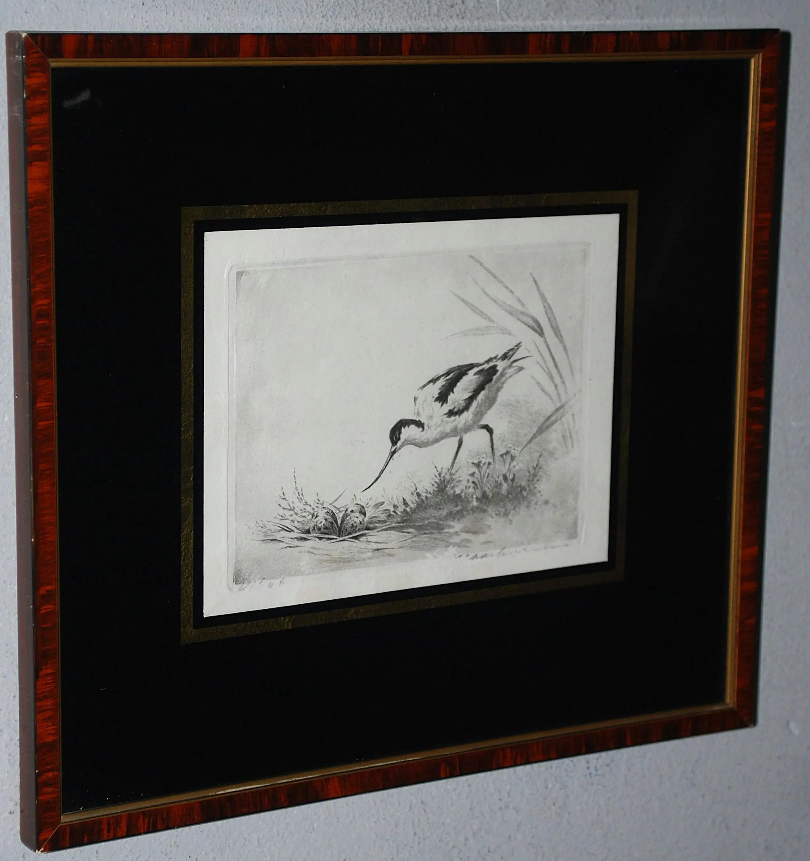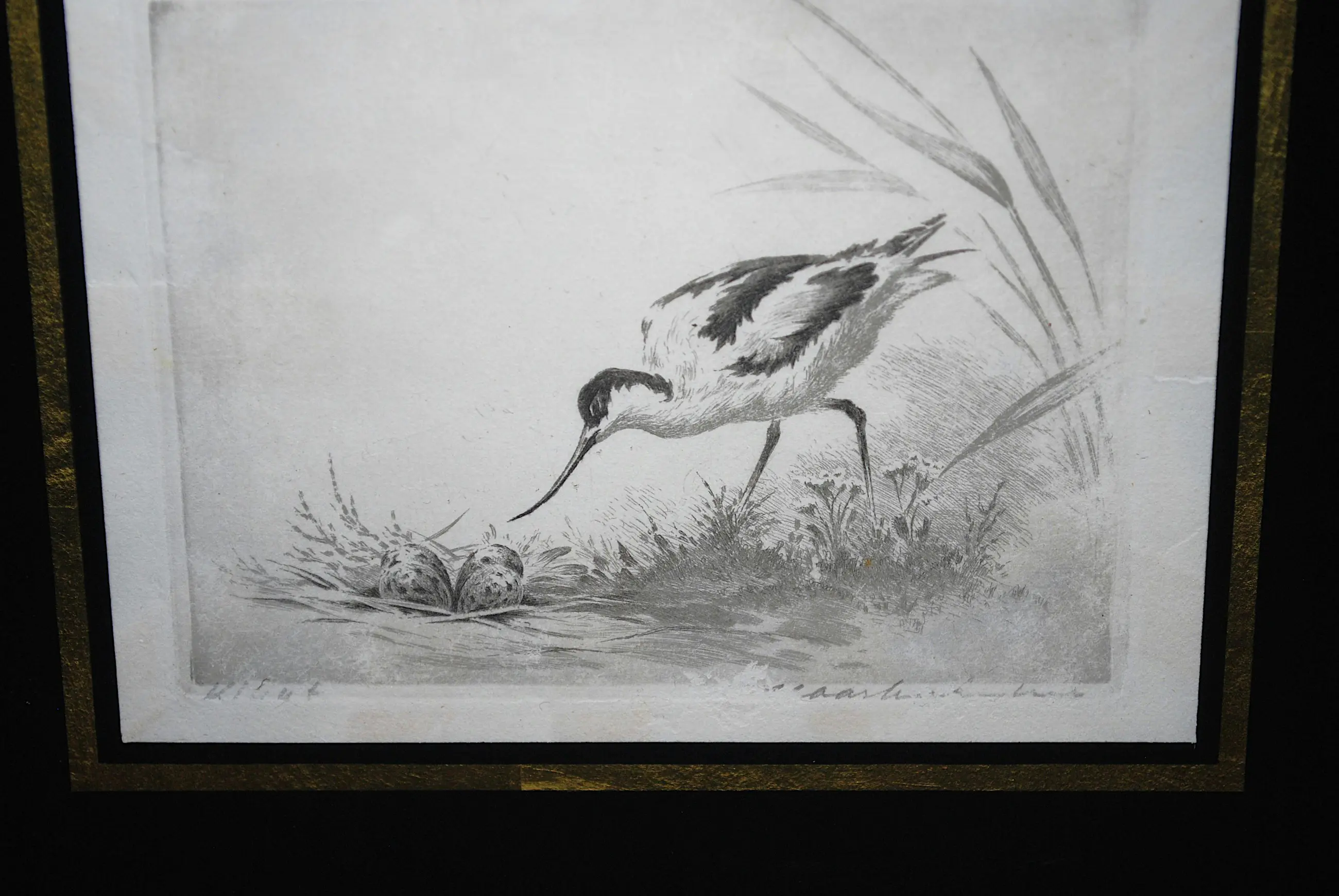 Bladmaat 12x14 cm. Geplaatst achter zwart glas met gouden bies. In een subtiel lijstje van mooie kwaliteit.